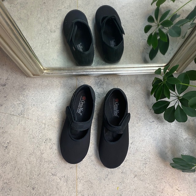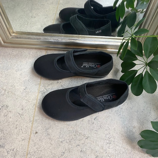 Dette er en ortopedisk sko. Sålen har en pelotte som gir forfoten et løft.