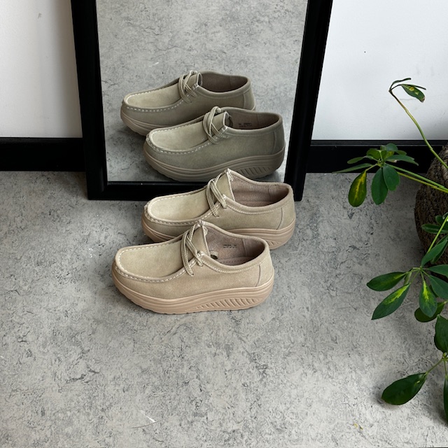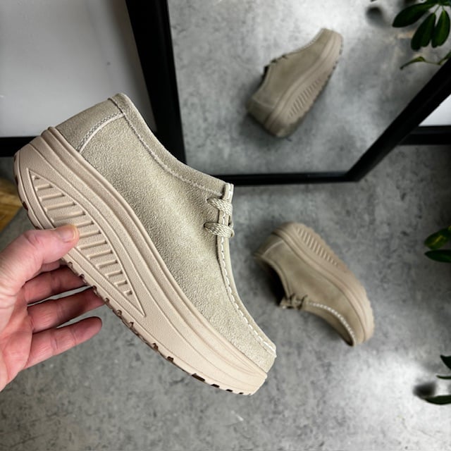 Beige semsket skinnsko med rullesåle og fotbuestøtte tilbyr både stil og komfort.