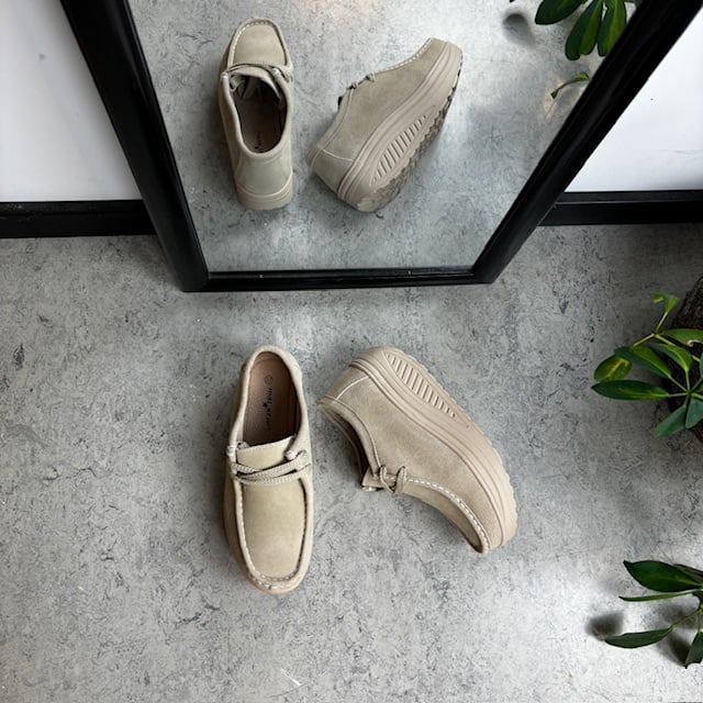 Beige semsket skinnsko med rullesåle og fotbuestøtte