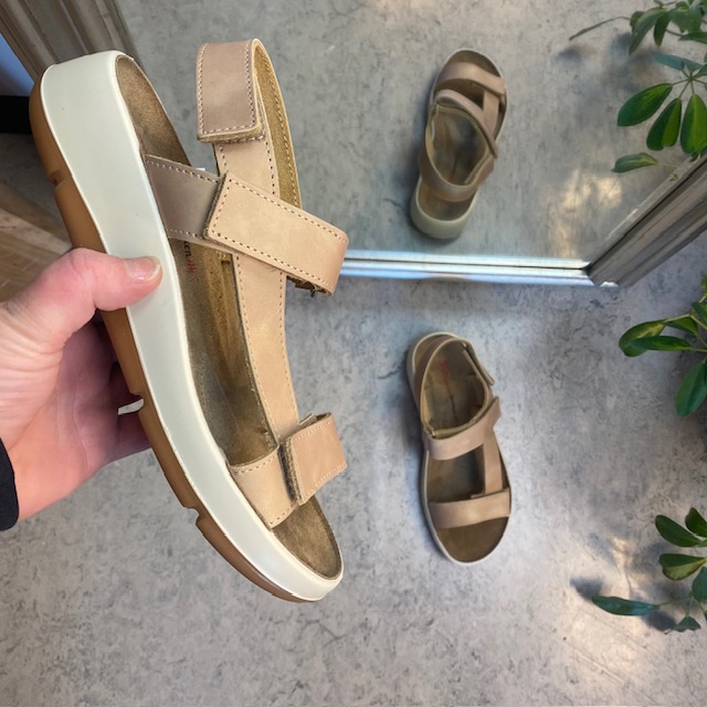 Beige skinnsandaler med tre justerbare stropper og fotbuestøtte