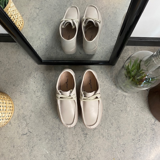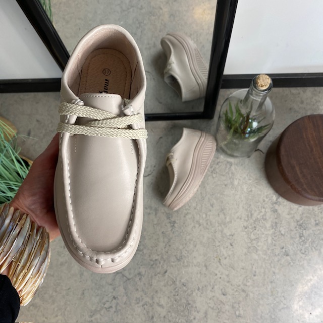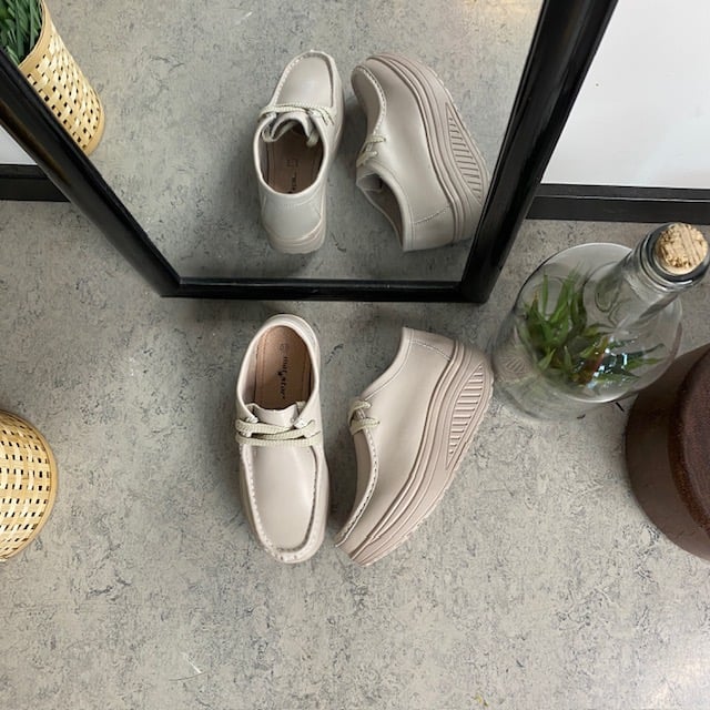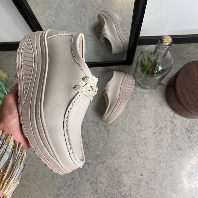 Beige skinnsko med rullesåle og svangstøtte kombinerer stil og komfort.