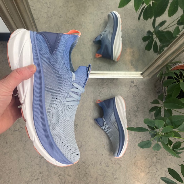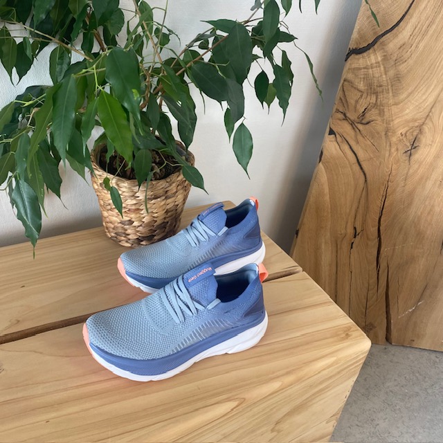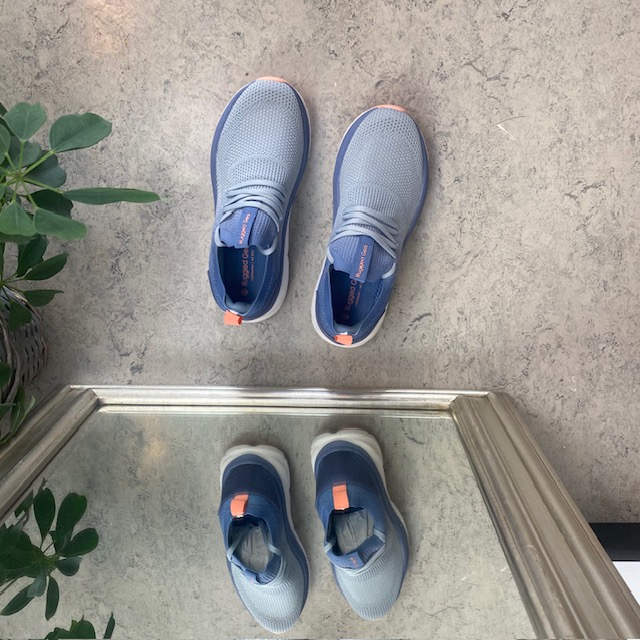 Lys blå sko med overdel i strikket mesh som sikrer at føttene dine kan puste