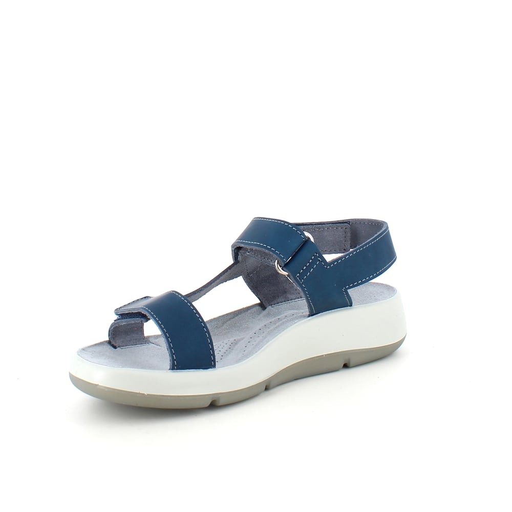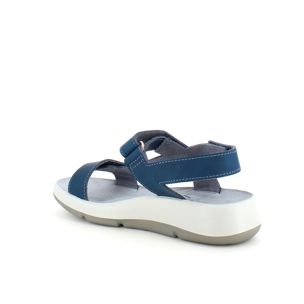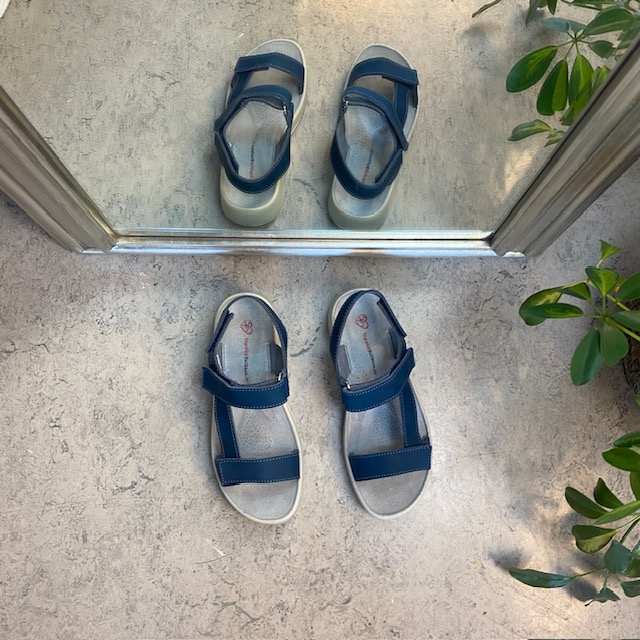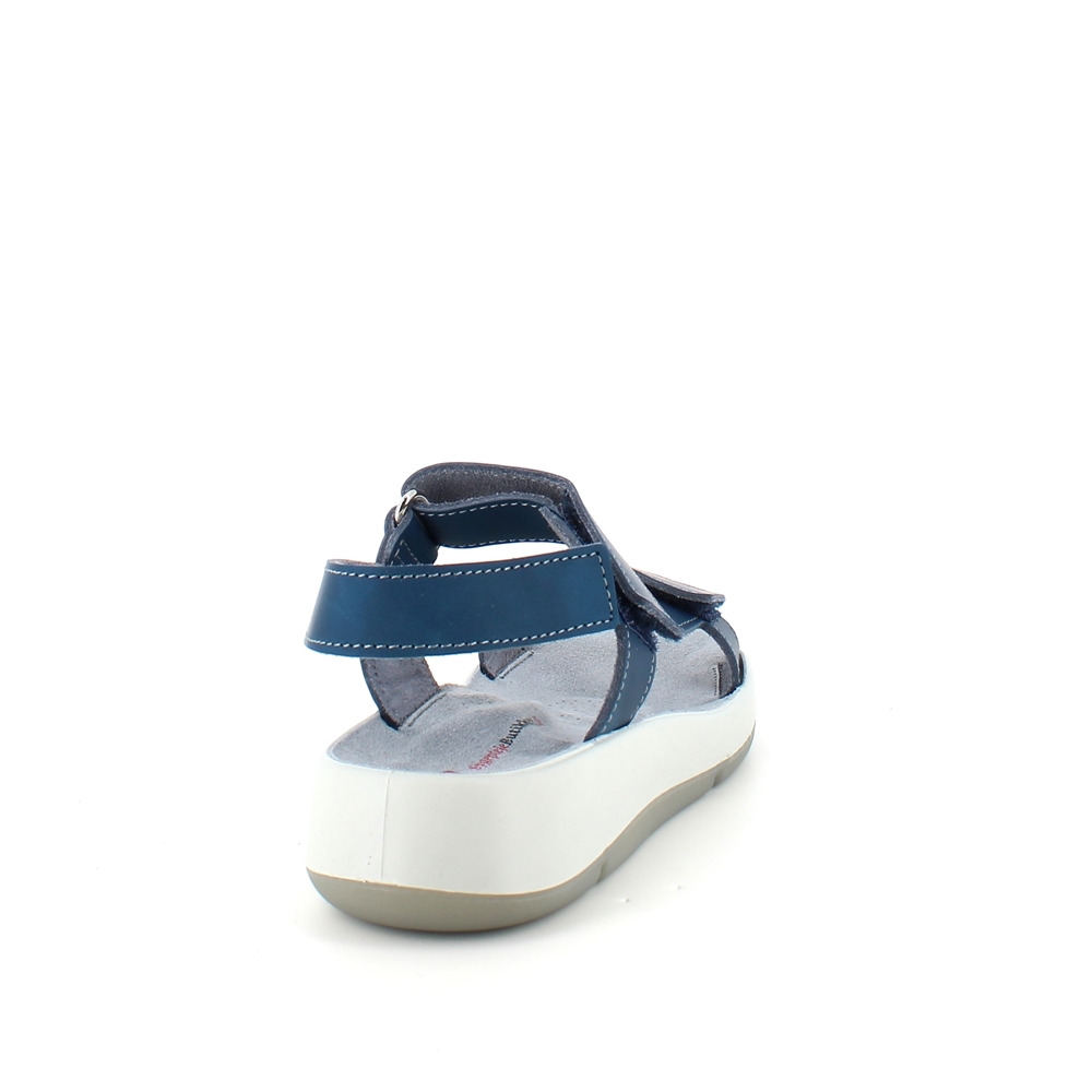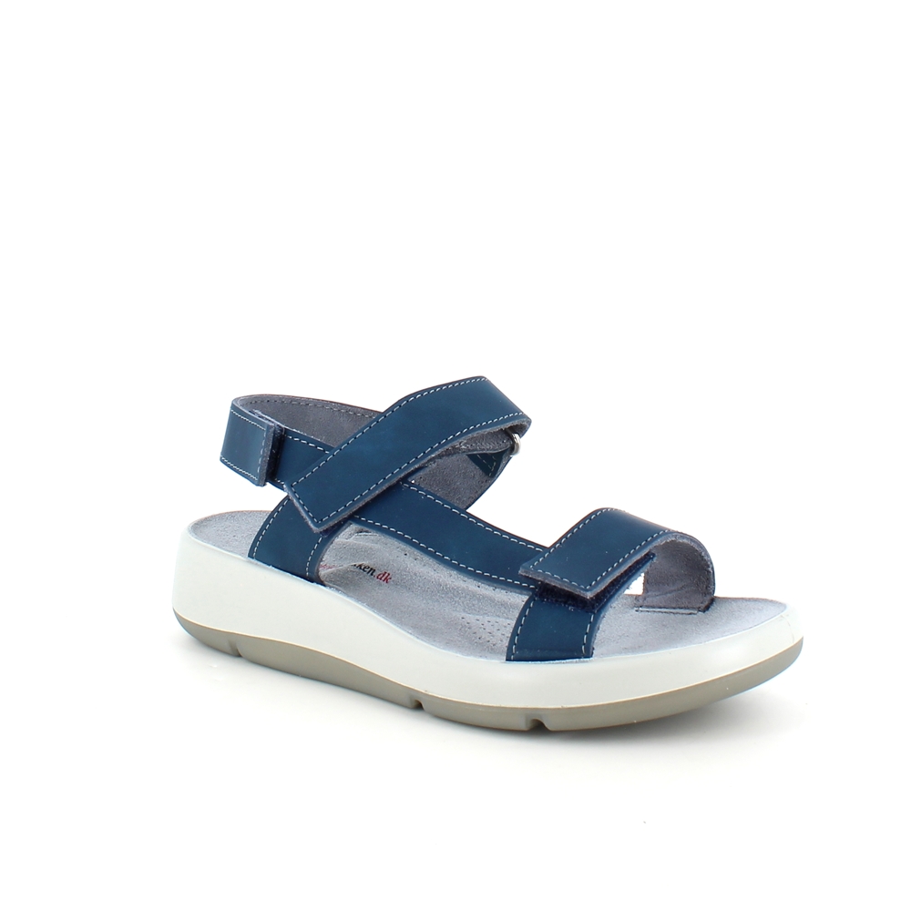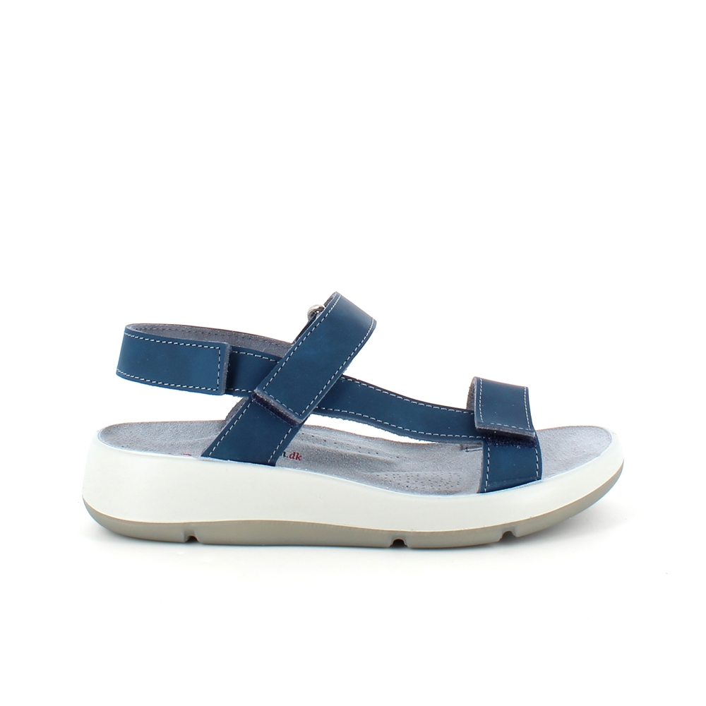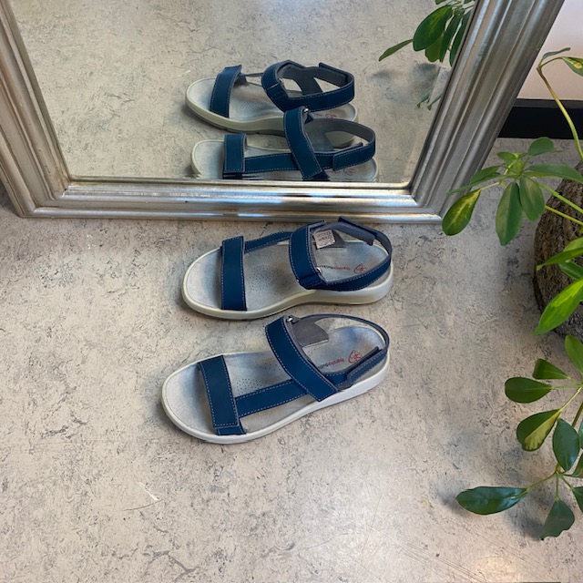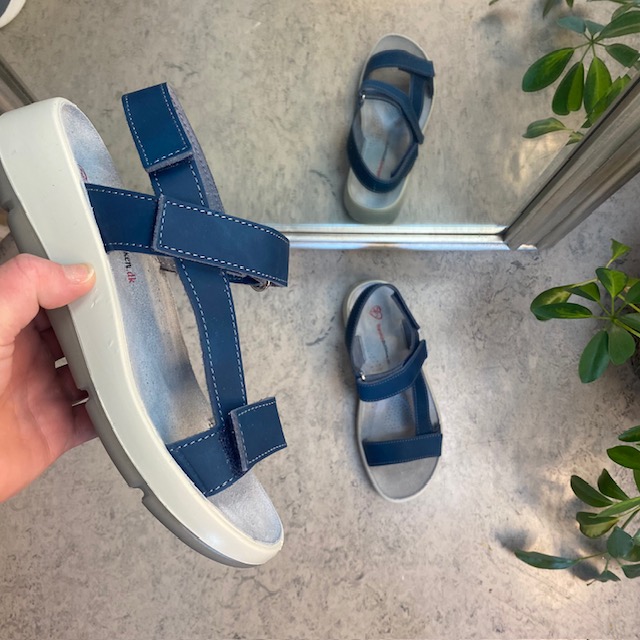 Sandal med blå skinnremmer som kan justeres både ved forfoten, ankelen og bak hælen.