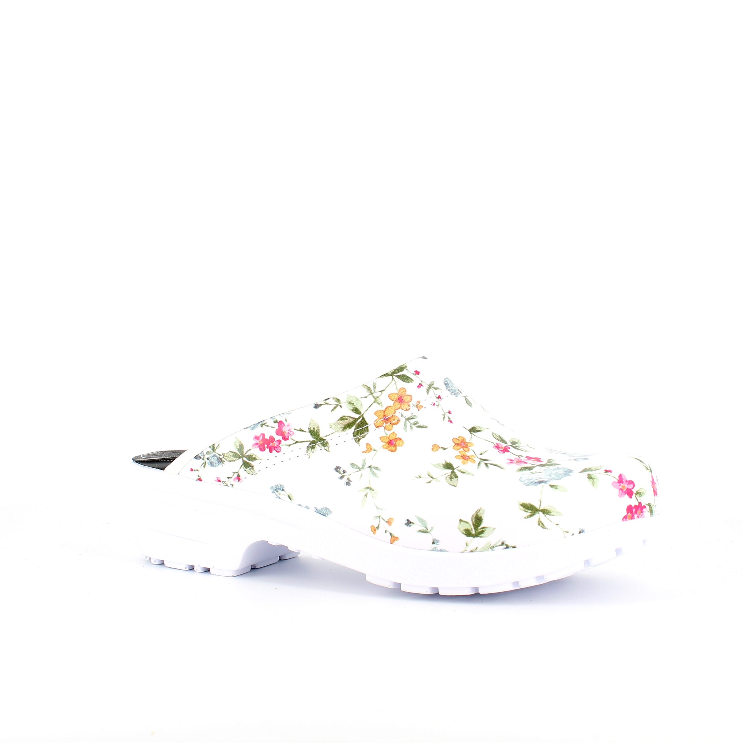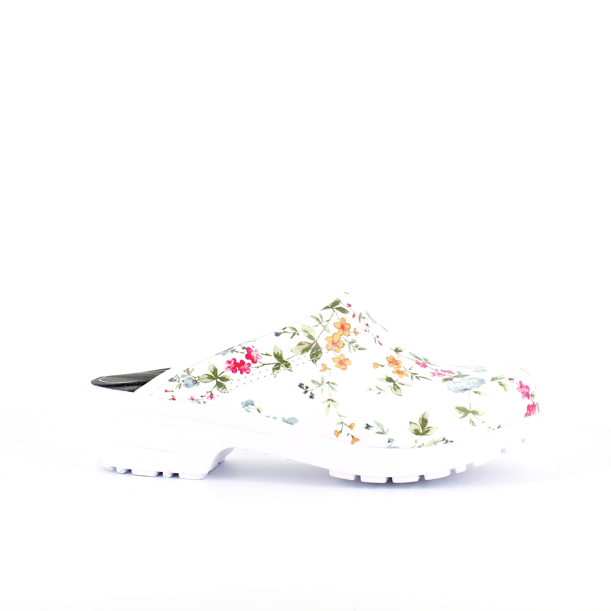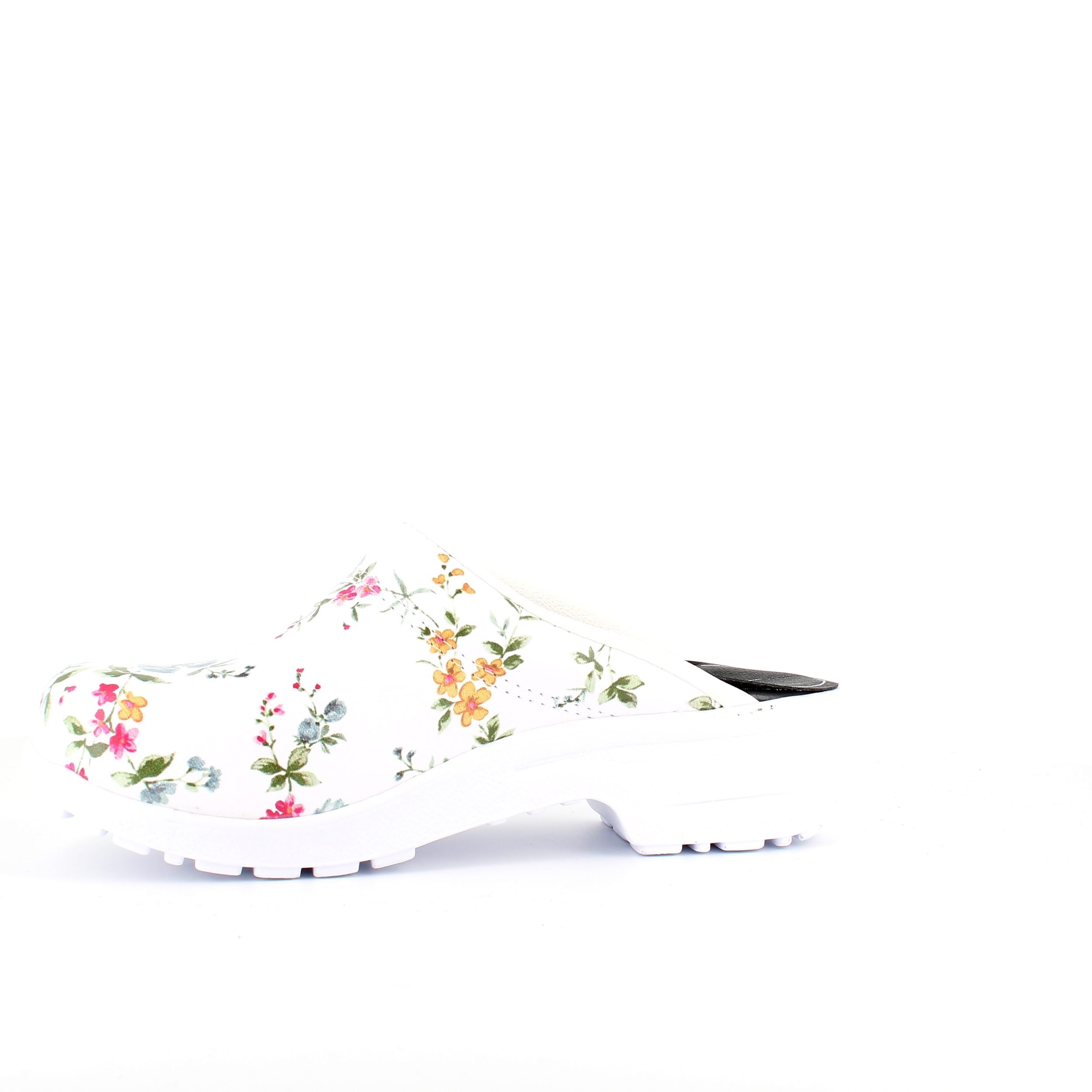 Hvit blomstret tresko i dansk kvalitet uten kap.