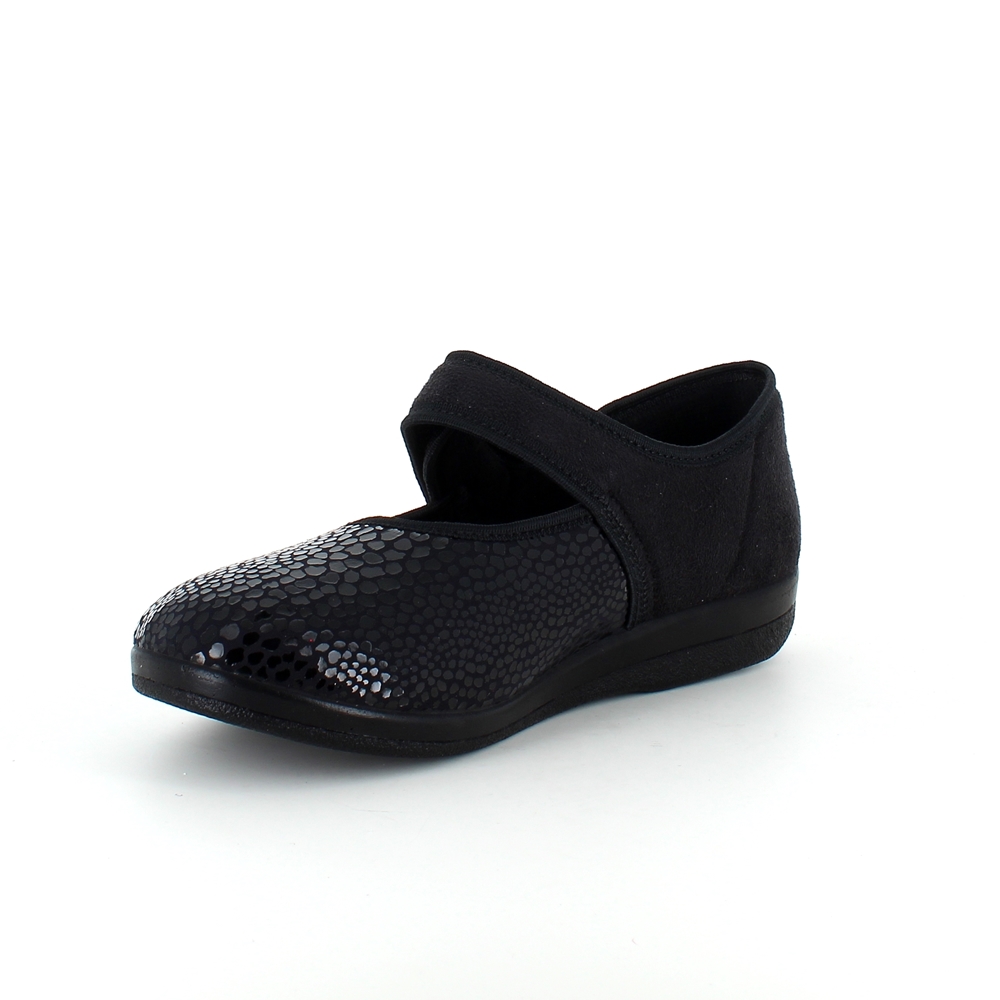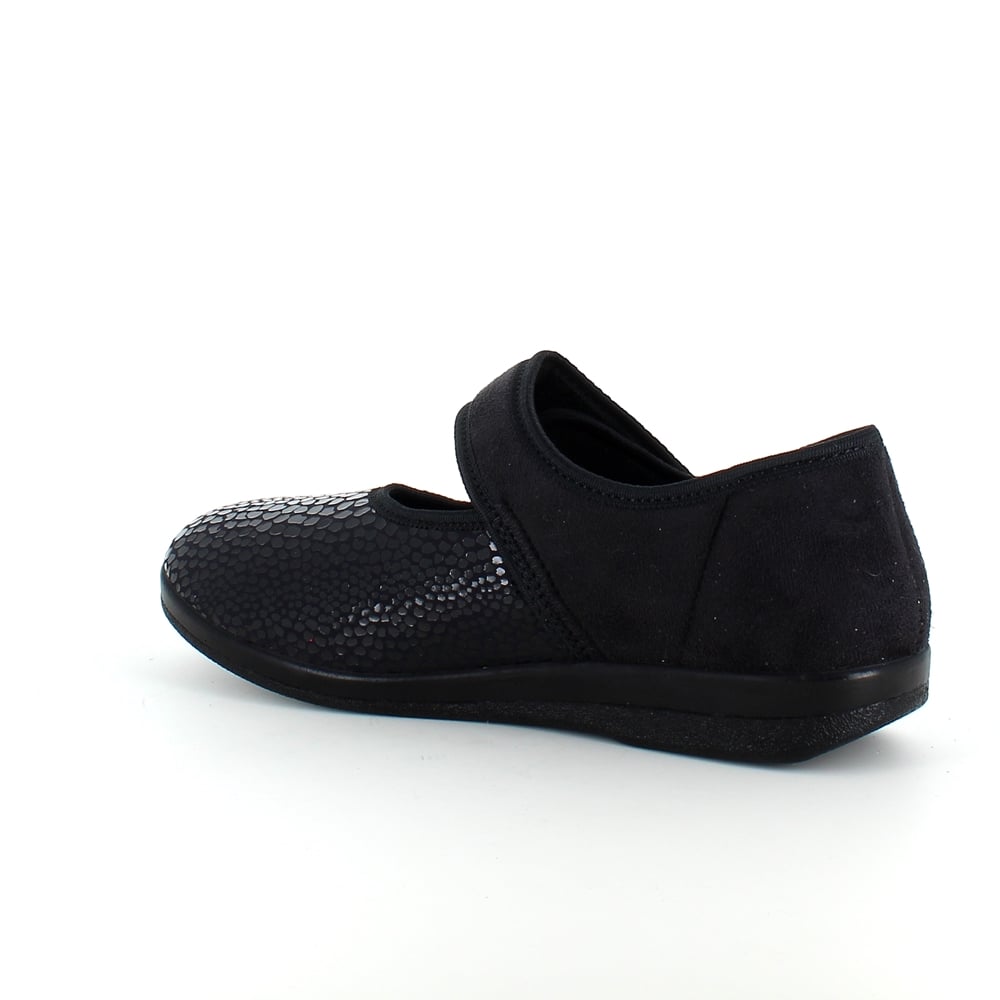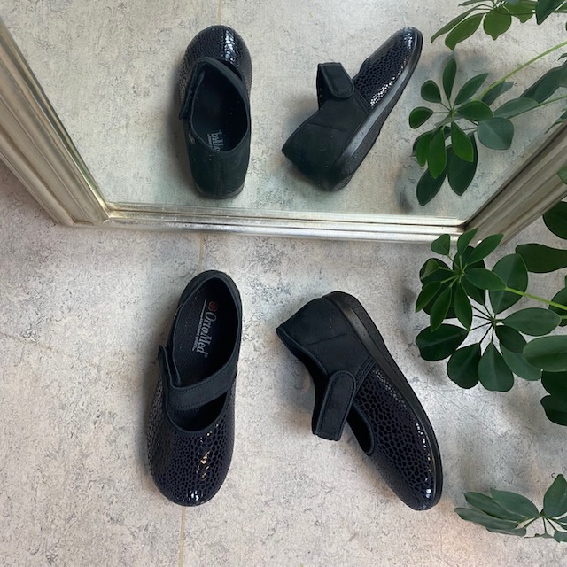 Bred ortopedisk sko i svart med borrelås rundt ankelen. Forfoten har glatt elastisk stoff som gir forfoten ekstra plass.