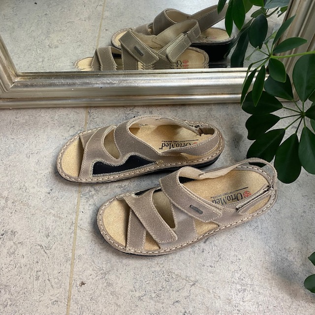 Sandalen har såler med fotbuestøtte. Dette er en ortopedisk sko.