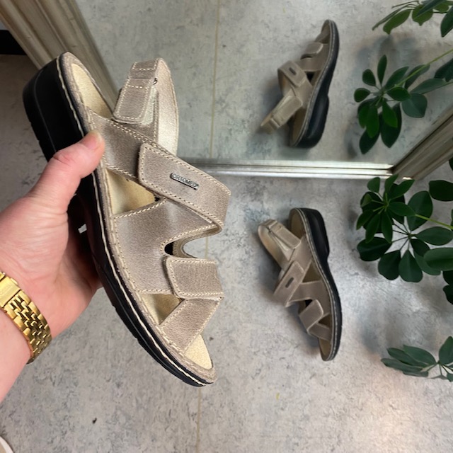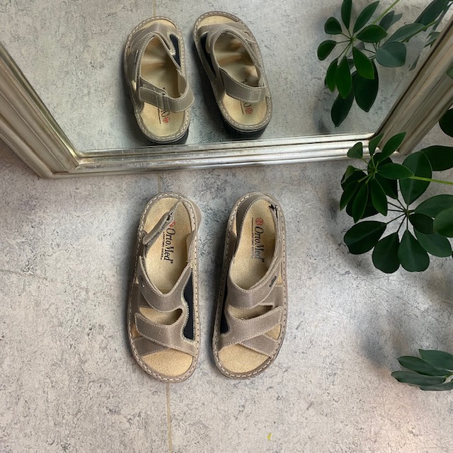 Bred ortopedisk sandal i beige med borrelås på forfot og vrist.
