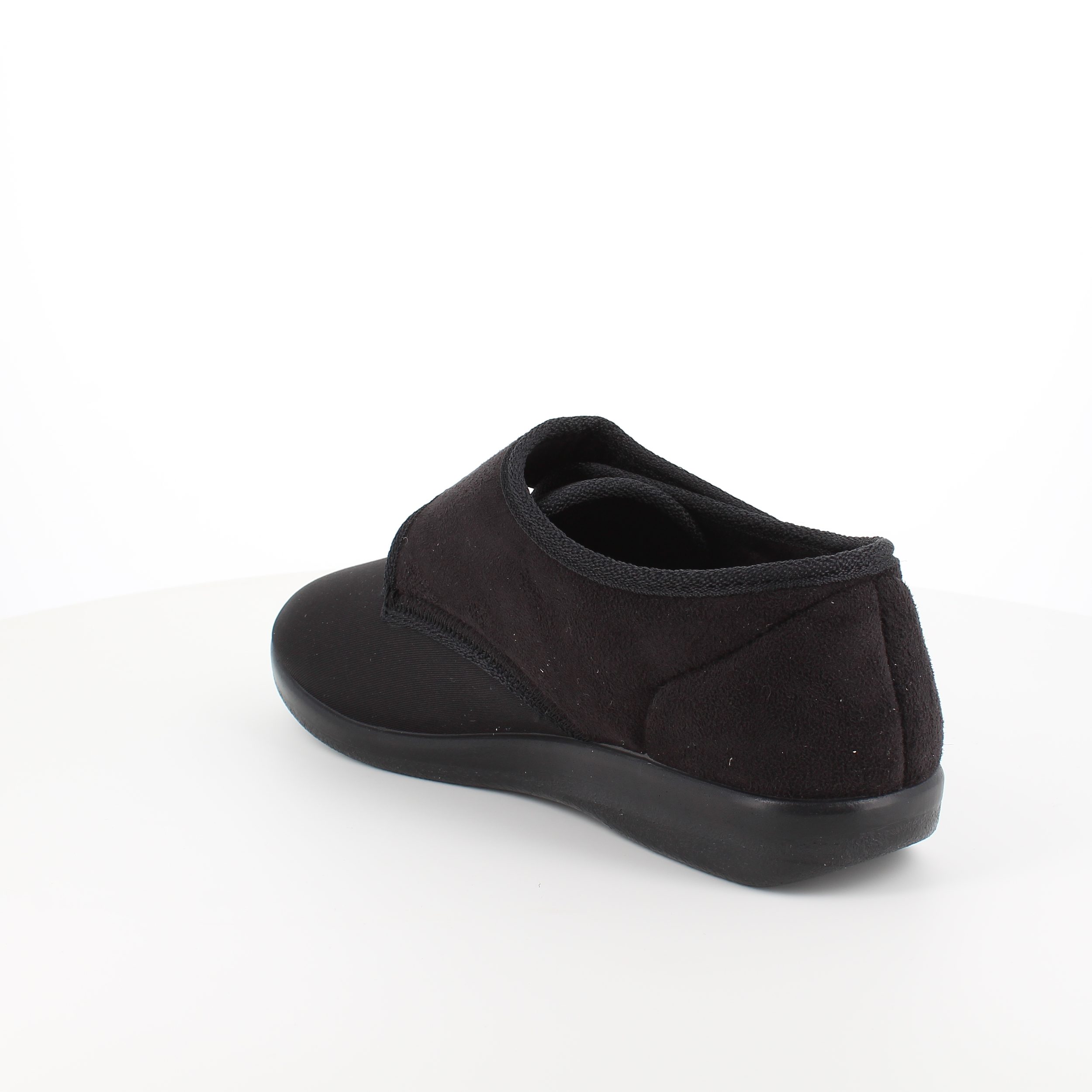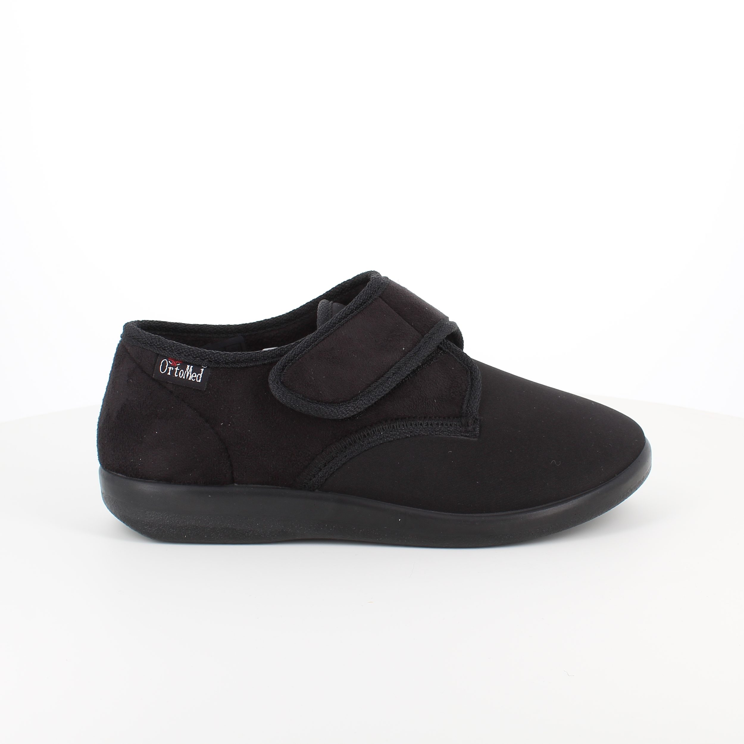 Bred ortopedisk sko i svart med borrelås rundt ankelen. Forfoten har glatt elastisk stoff som gir forfoten ekstra plass.