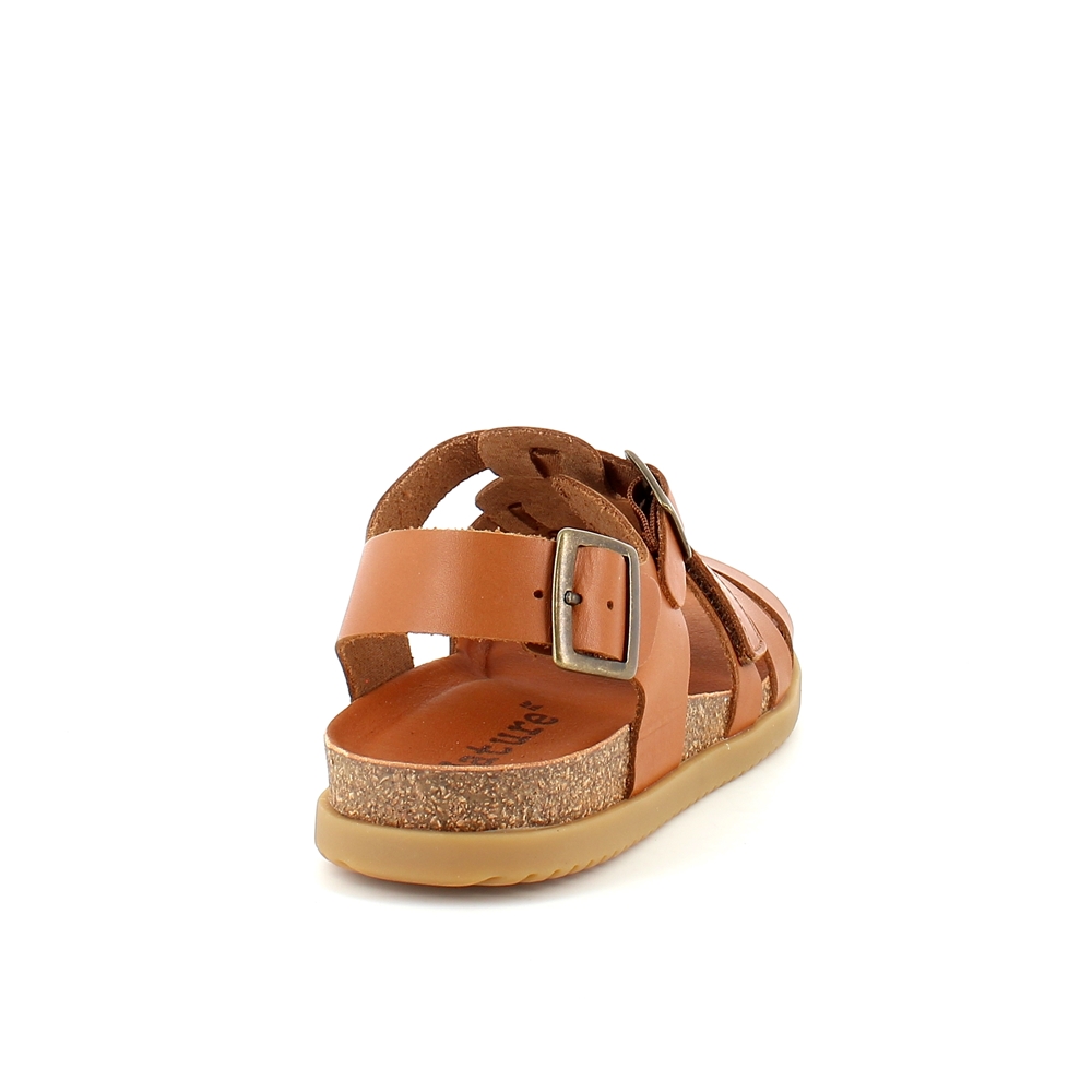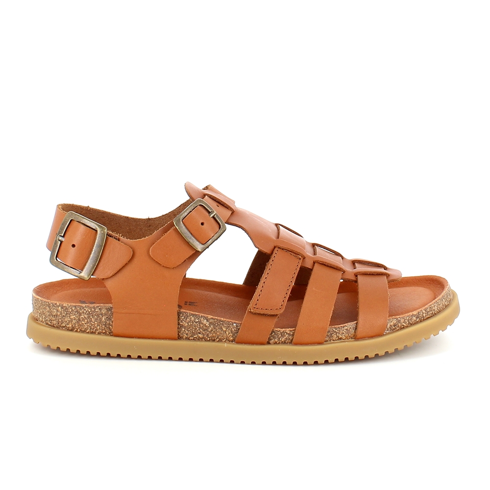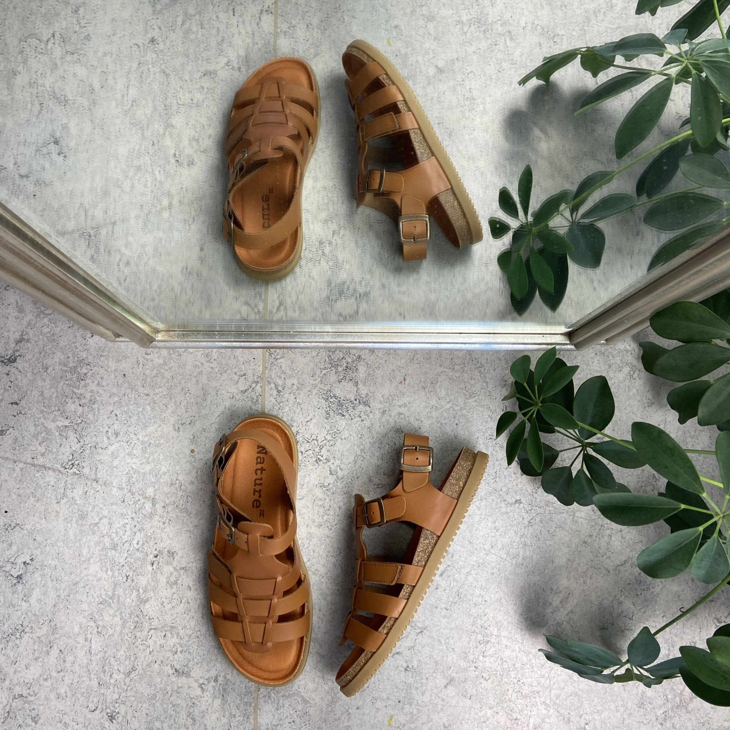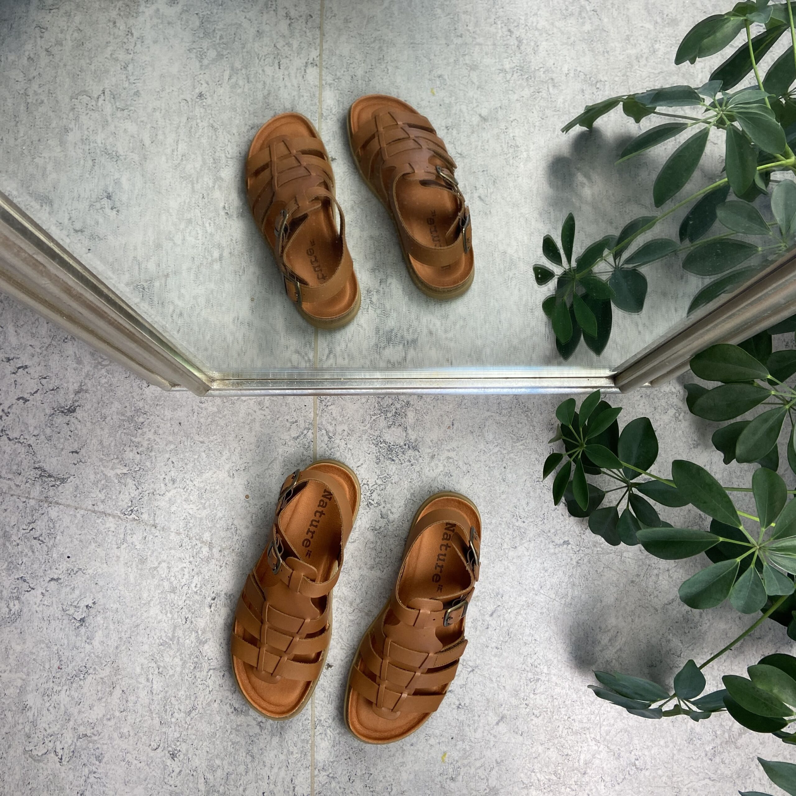 Flott, brun lærsandal fra Nature med tre remmer over forfoten hvorav den ene kan justeres med borrelåslukkingen.
