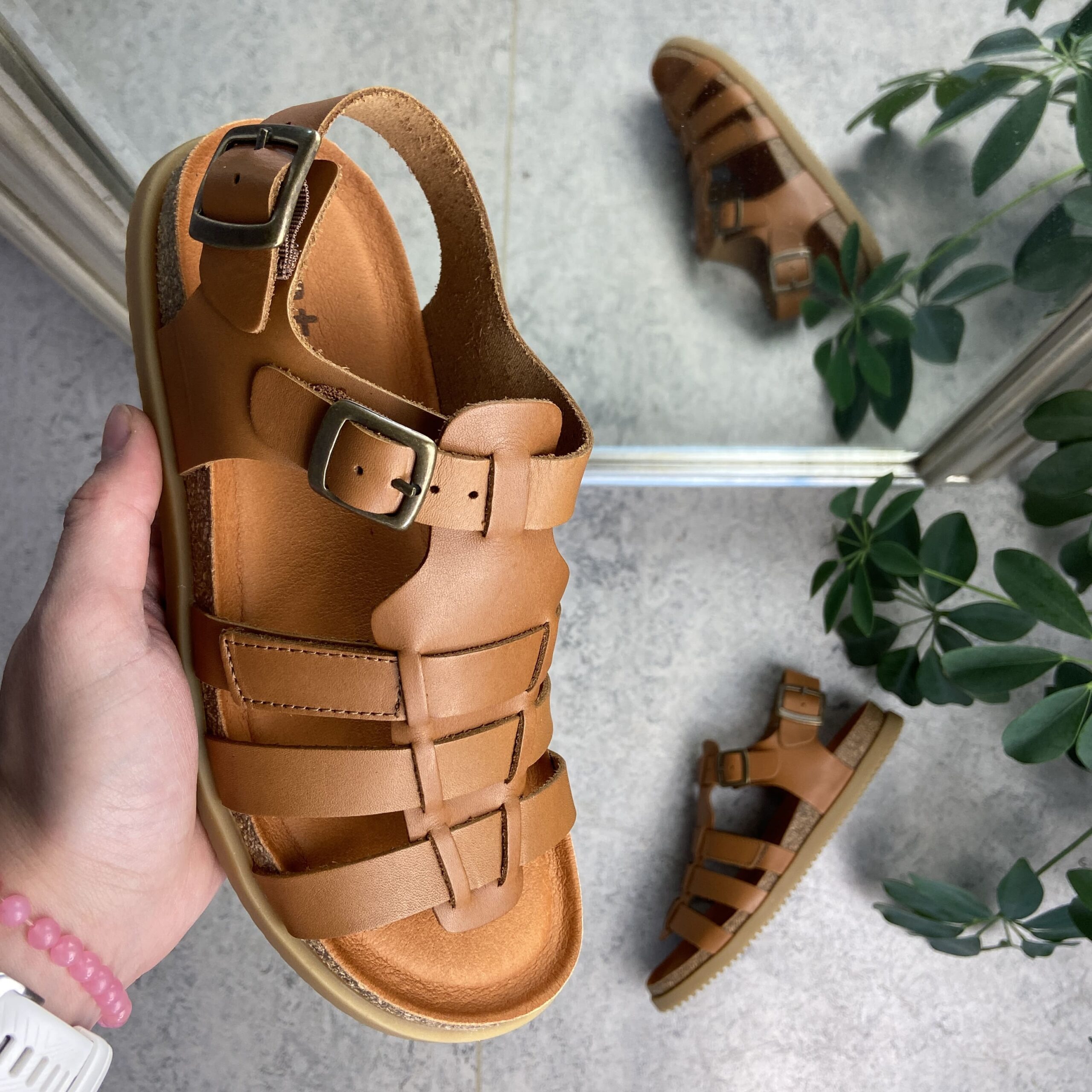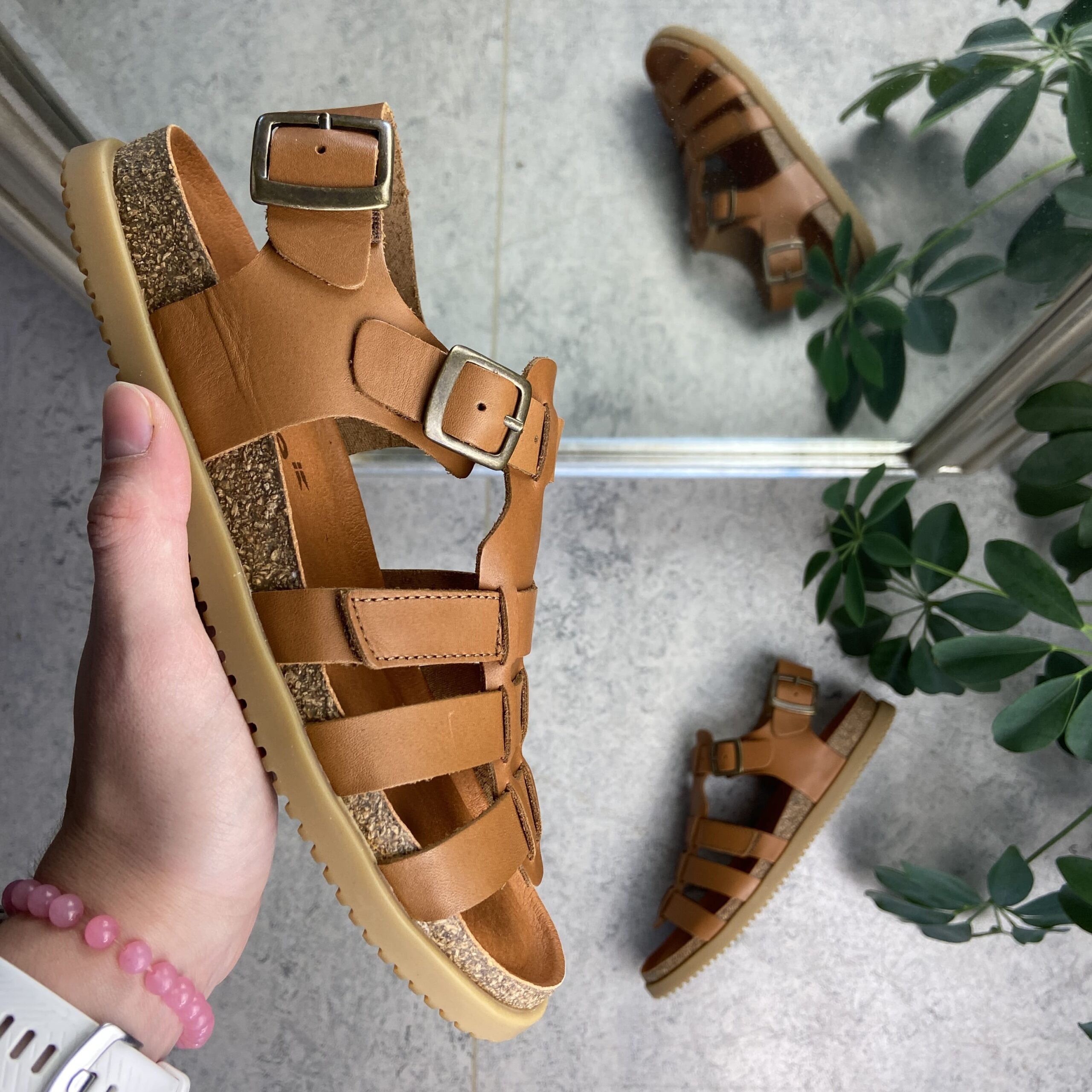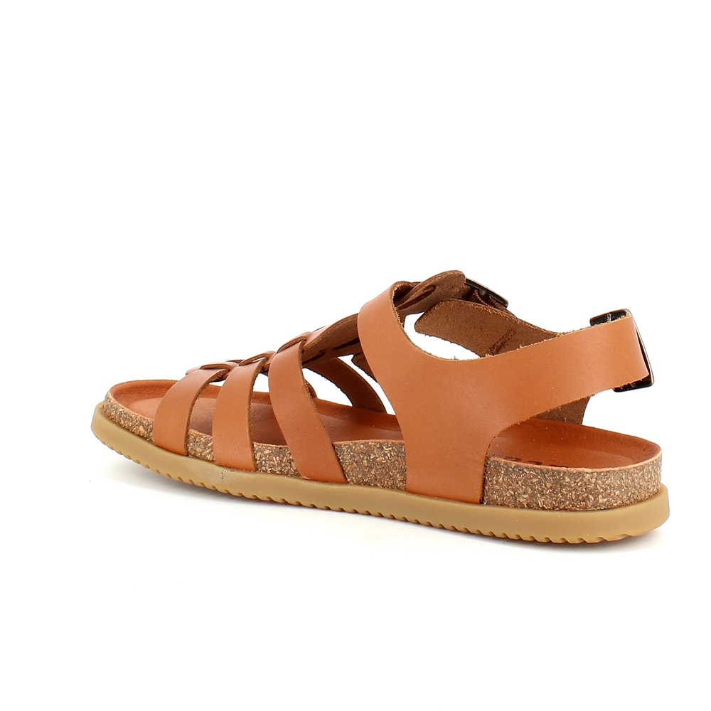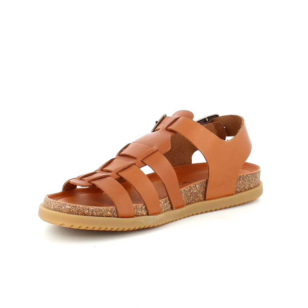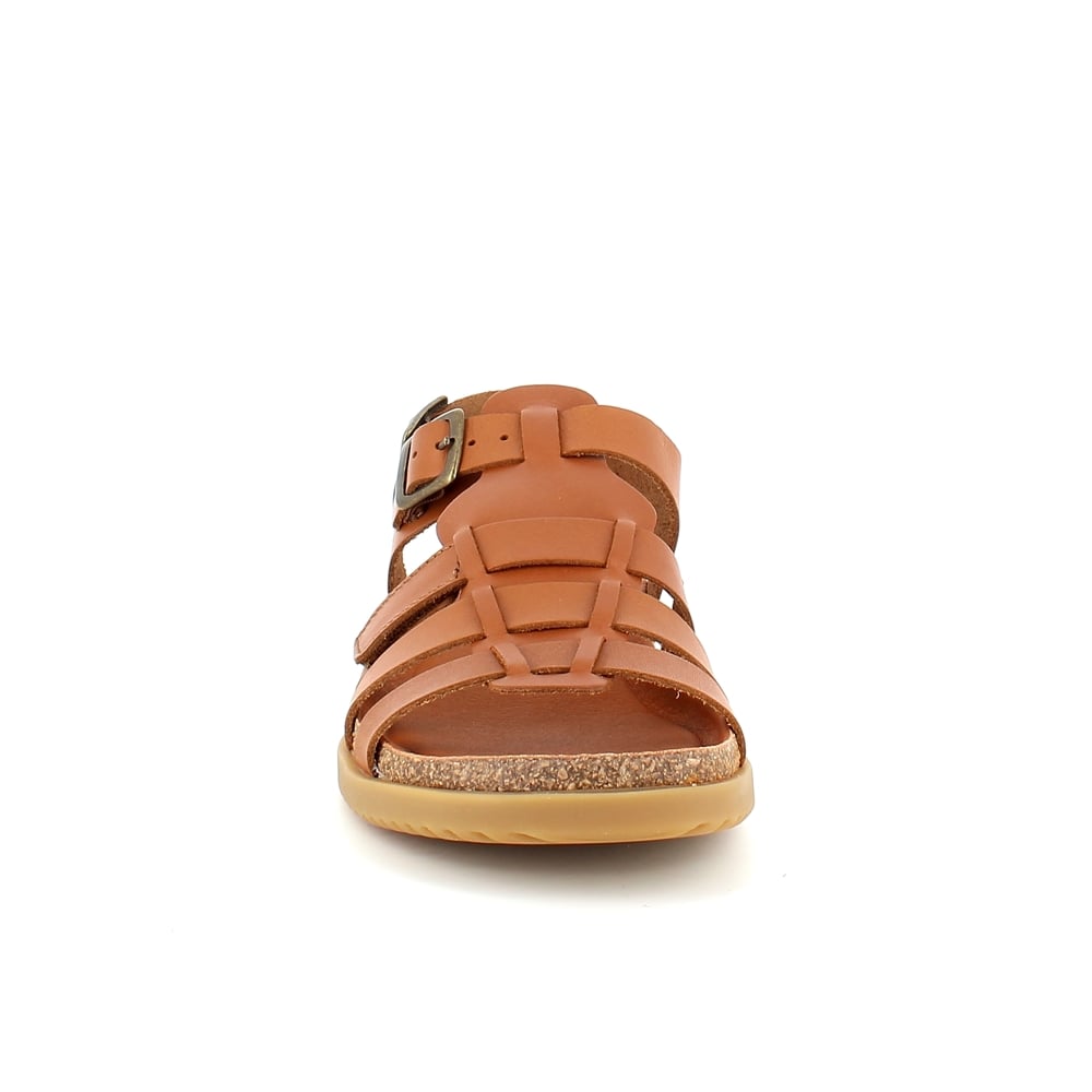 Flott, brun lærsandal fra Nature med tre remmer over forfoten hvorav den ene kan justeres med borrelåslukkingen.