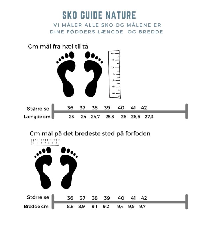 Nature anbefaler at man velger sin normale størrelse i Nature sko og -støvler for å få den mest optimale passformen. Siden dette er en mokkasinsko, er den mest optimale passformen når tærne “kysser” spissen av skoen.