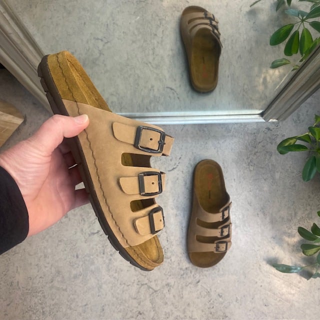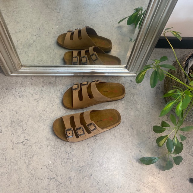 Flott brun slip-in sandal i skinn med tre smale, justerbare remmer.