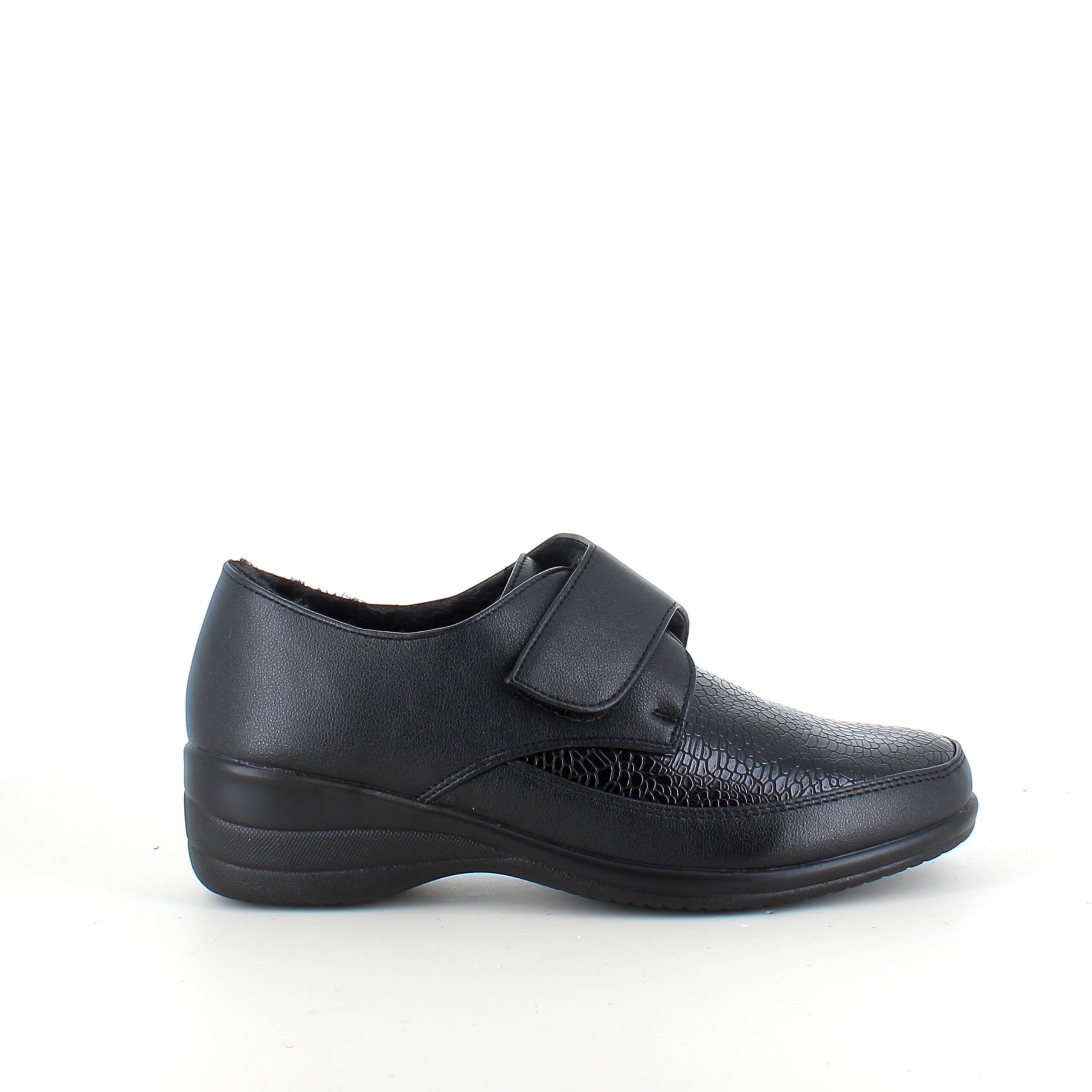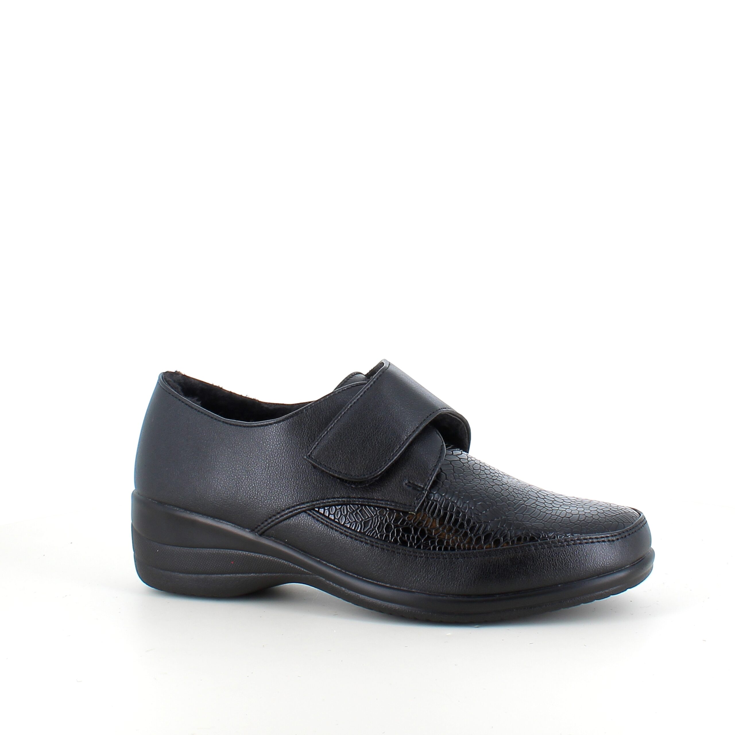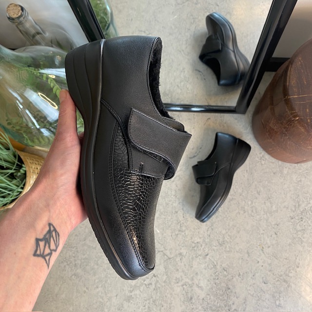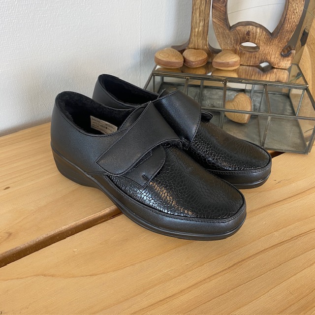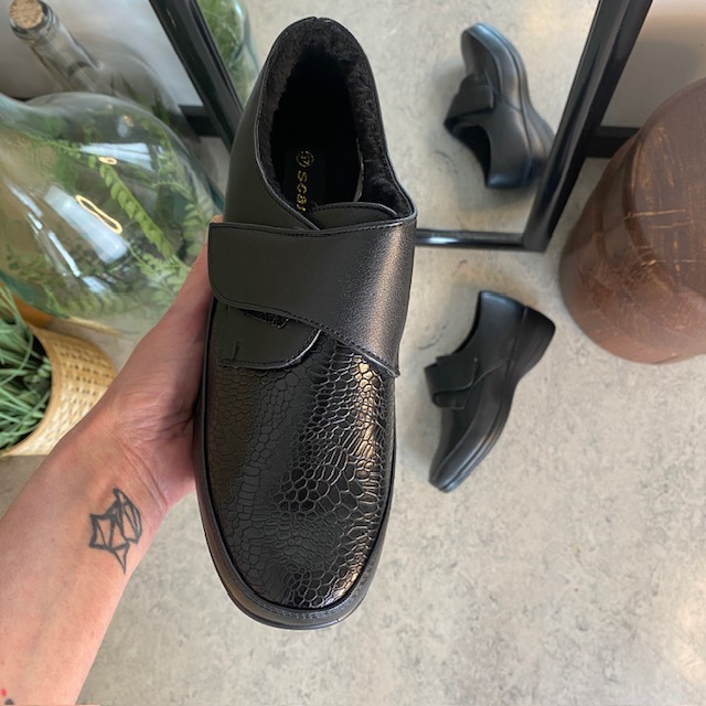 Overdelen er detaljert med et elegant slangemønster, som gir et moderne utseende, mens den brede borrelåslukkingen gjør skoen enkel å ta av og på – også for deg som har behov for ekstra romslighet.