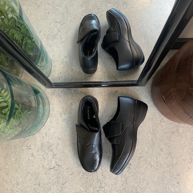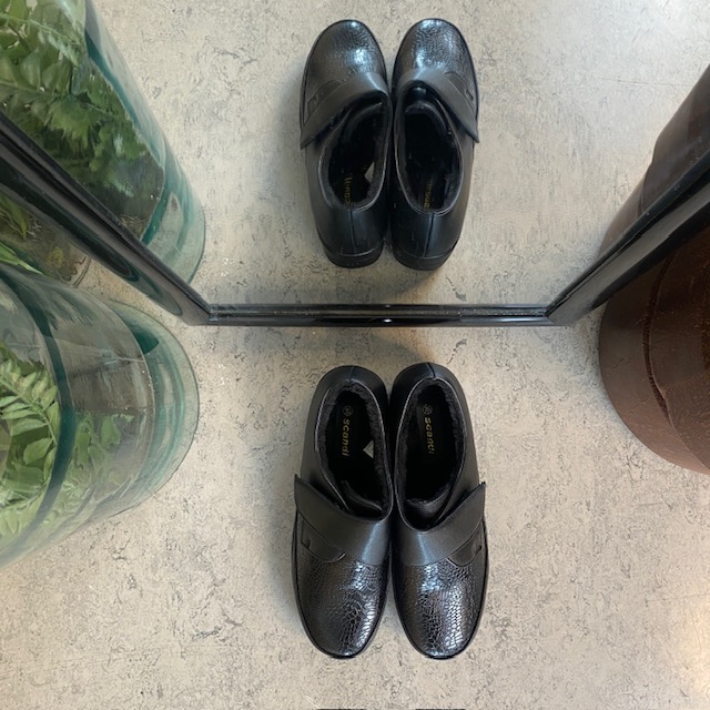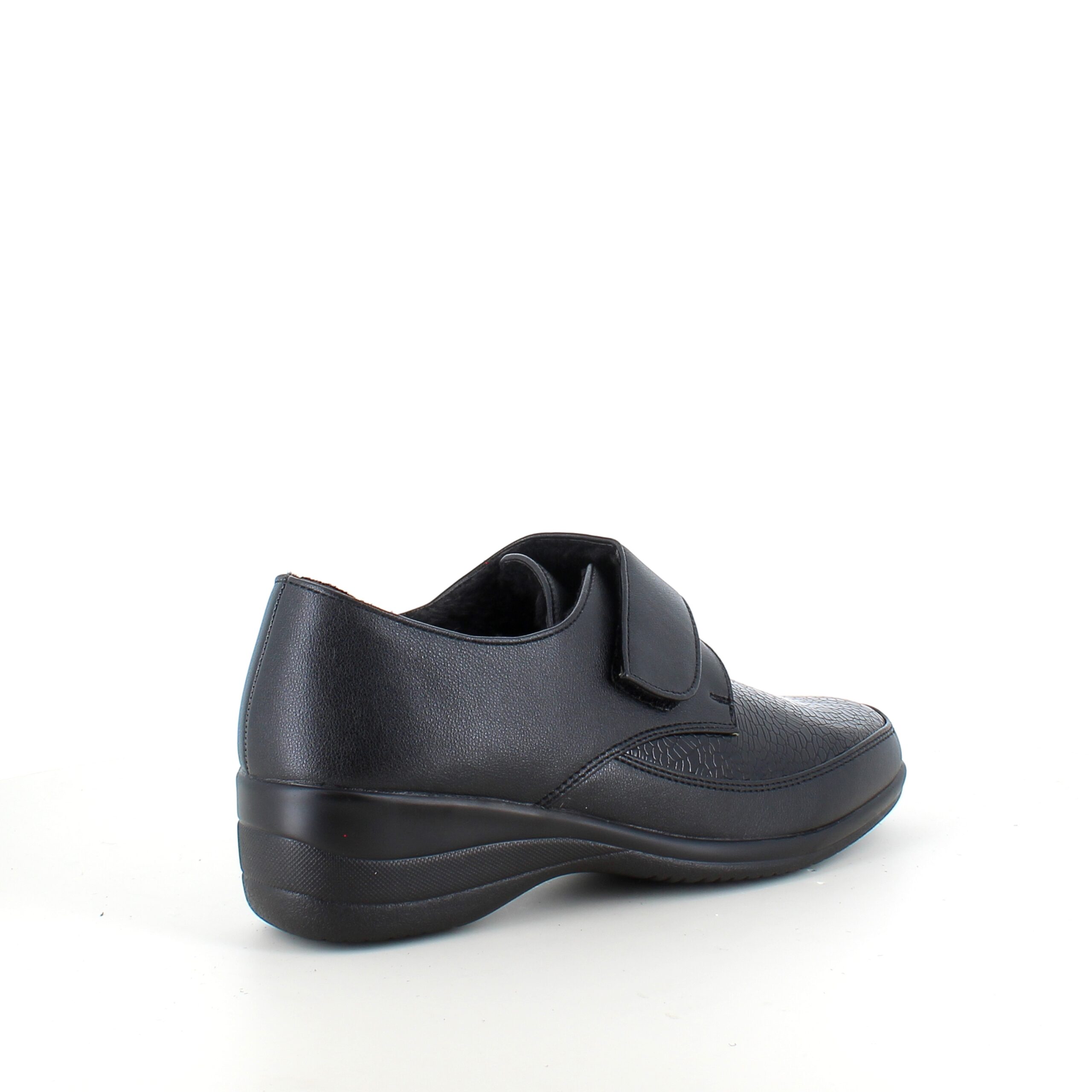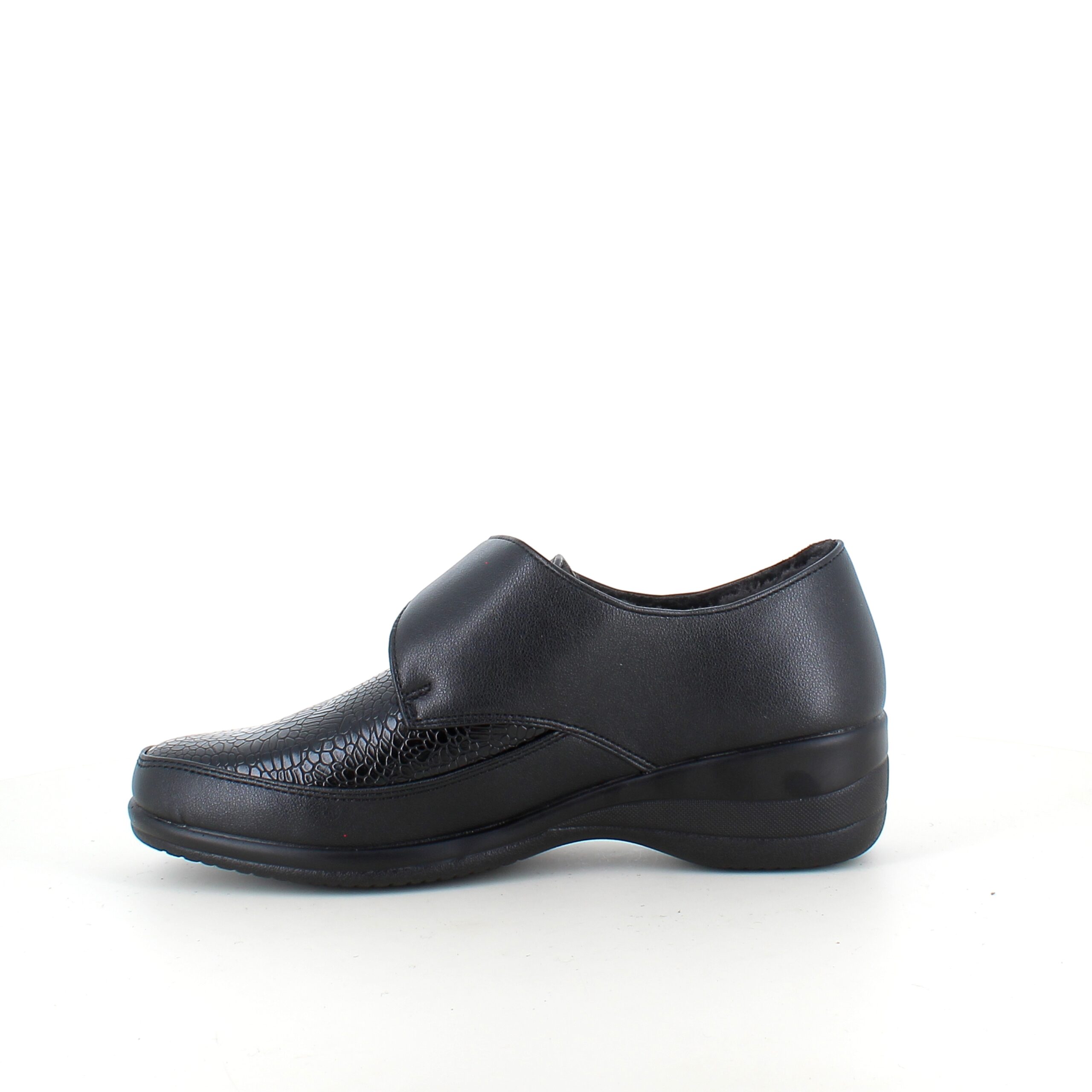 Overdelen er detaljert med et elegant slangemønster, som gir et moderne utseende, mens den brede borrelåslukkingen gjør skoen enkel å ta av og på – også for deg som har behov for ekstra romslighet.