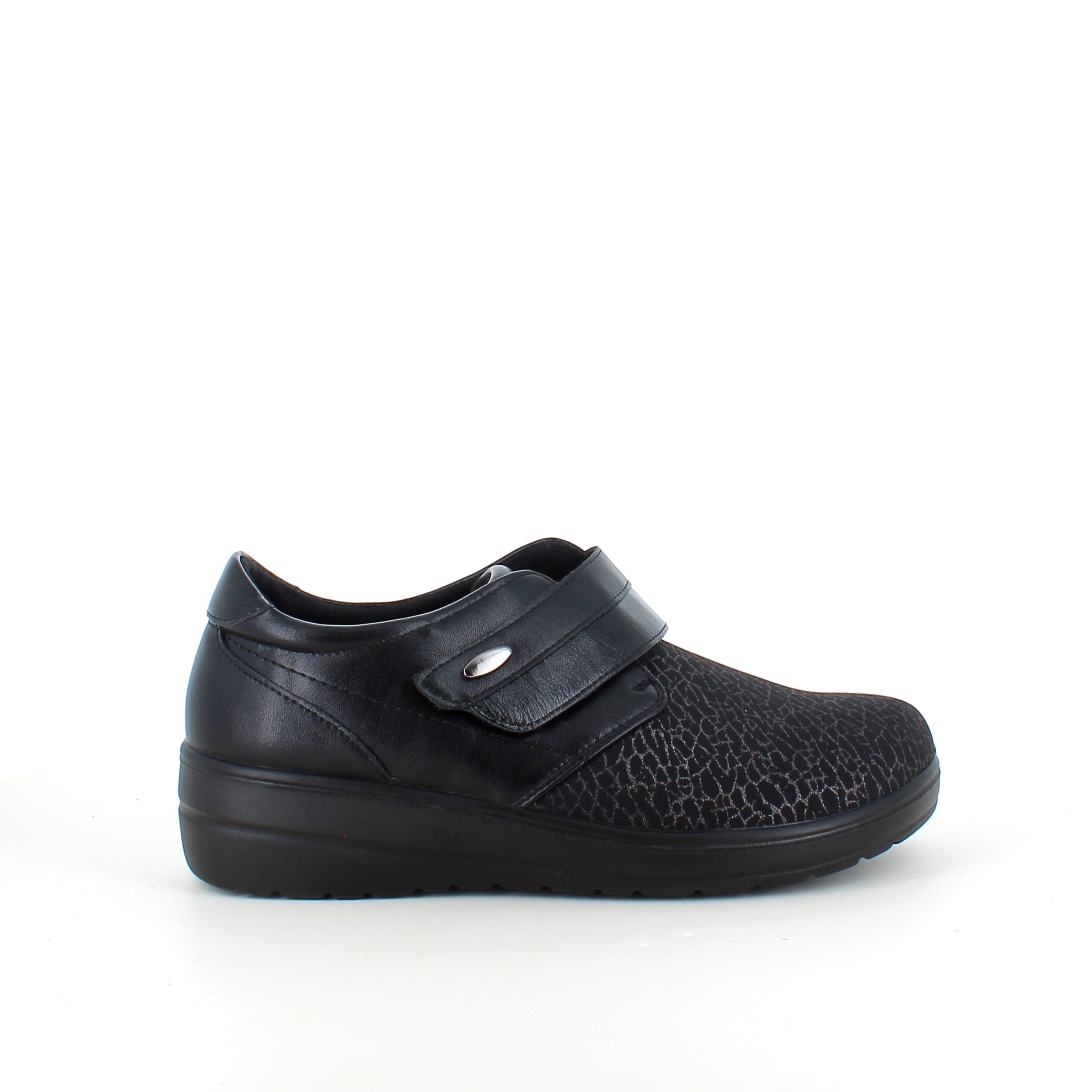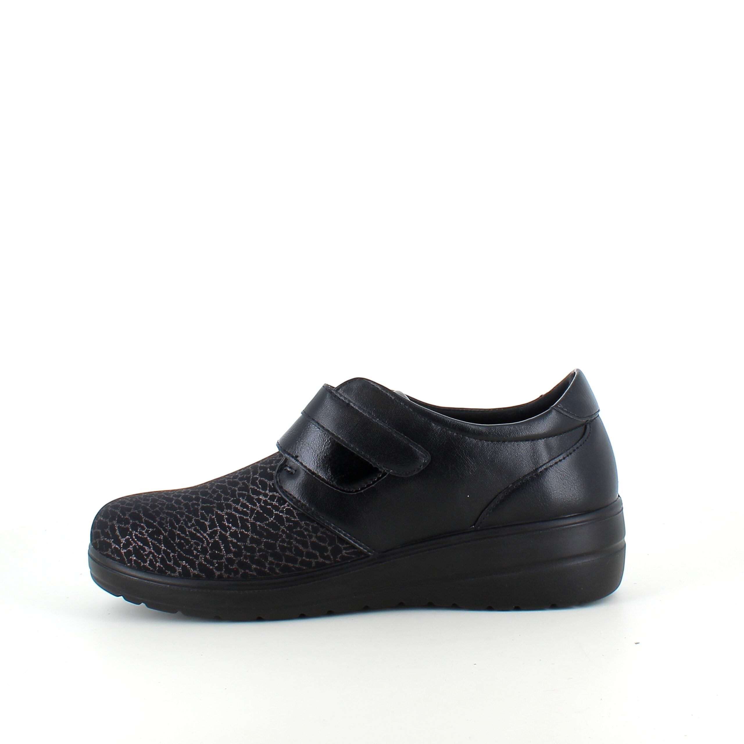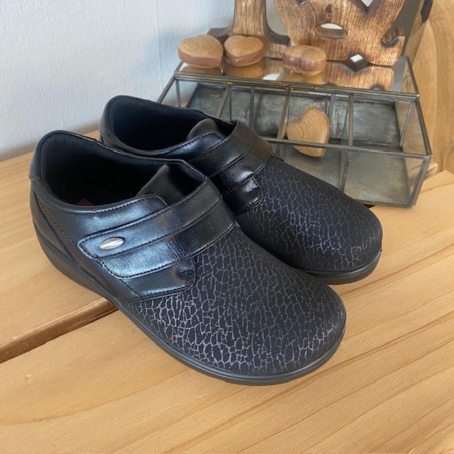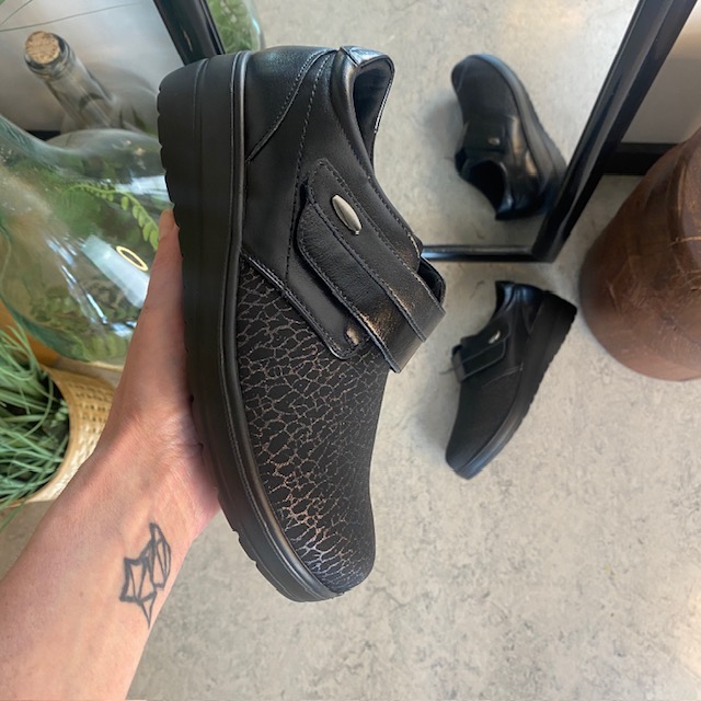 Damesko i sort PU med mønstret overdel, borrelåslukning og fleksibel PU-såle