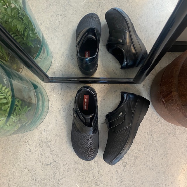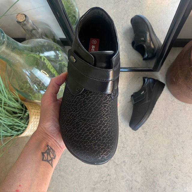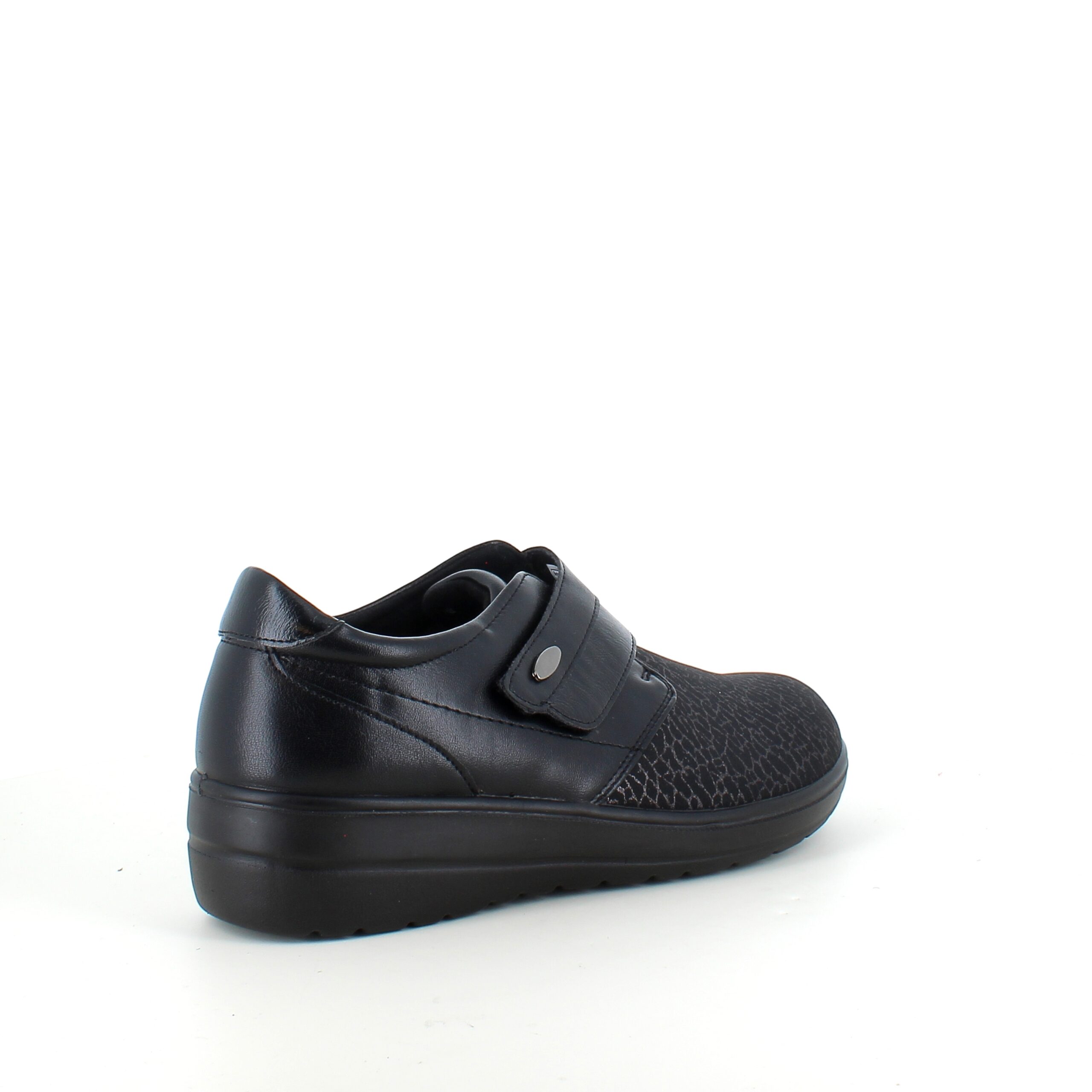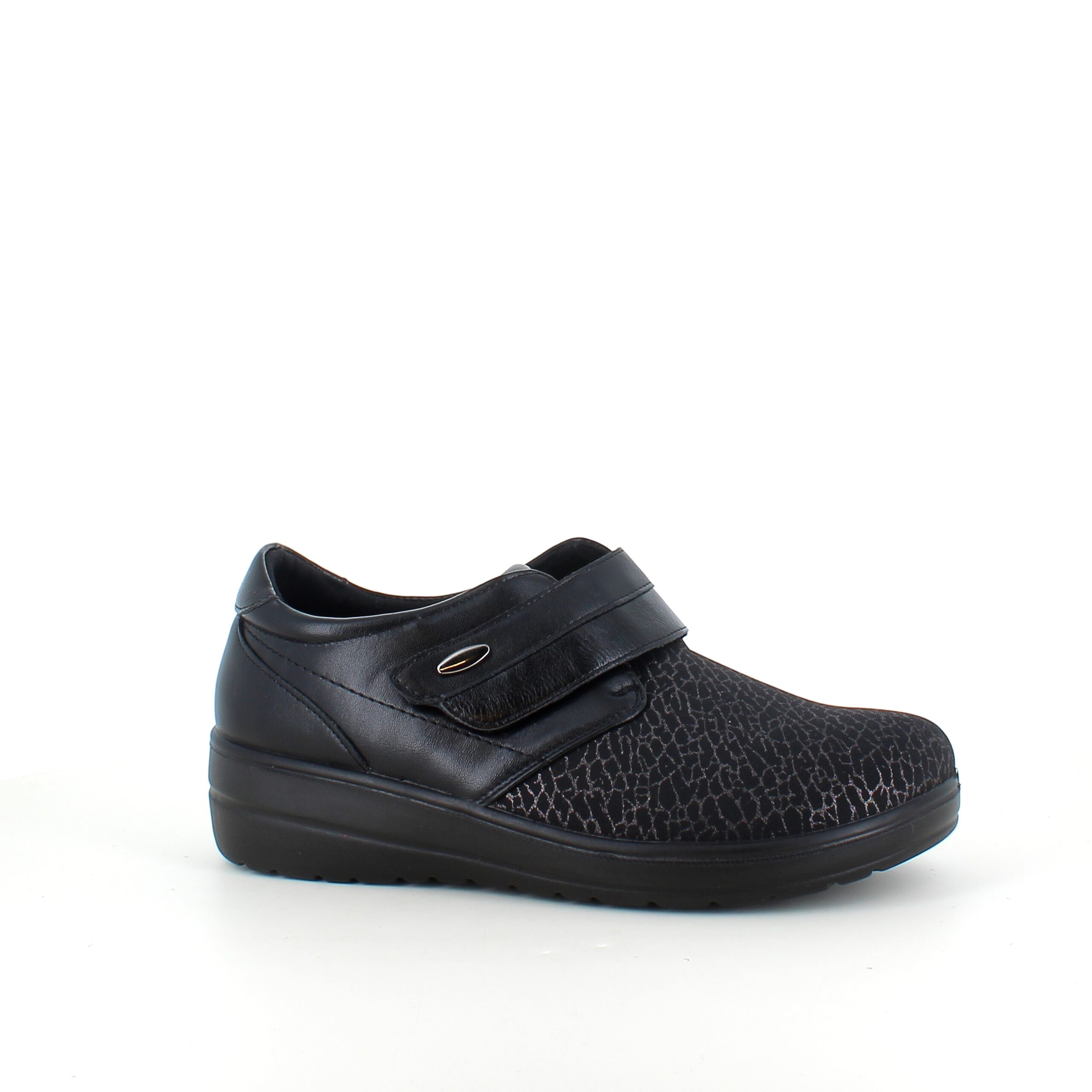 Damesko i sort PU med mønstret overdel, borrelåslukning og fleksibel PU-såle