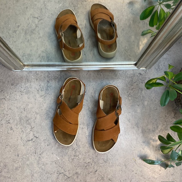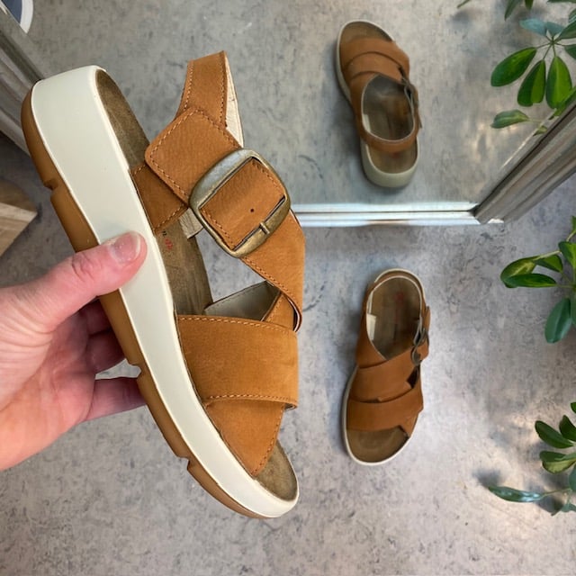 Sandalene har kryssende remmer over forfoten i et smart design, lukkes med en smart spenne, og det er sydd inn et stykke elastikk for å forbedre komforten når du går.
