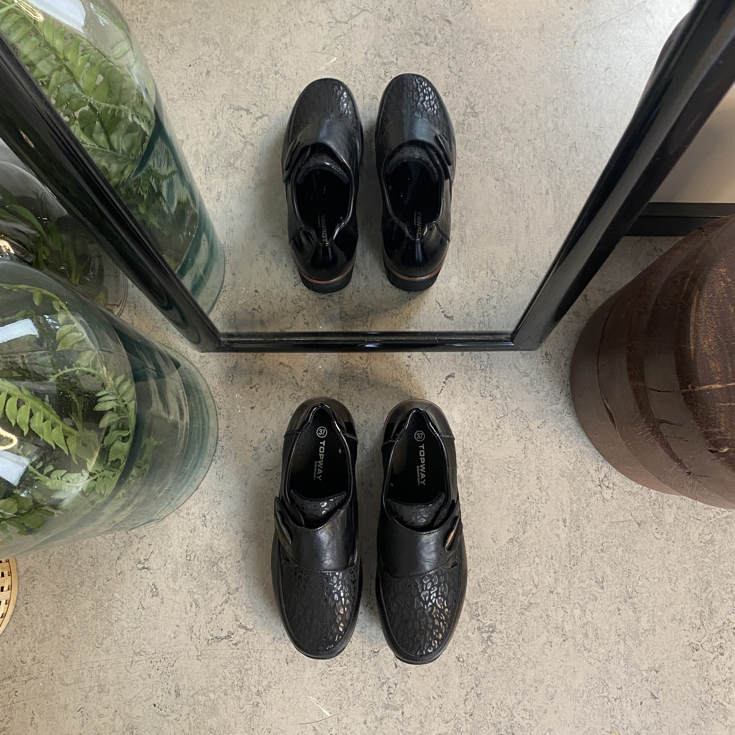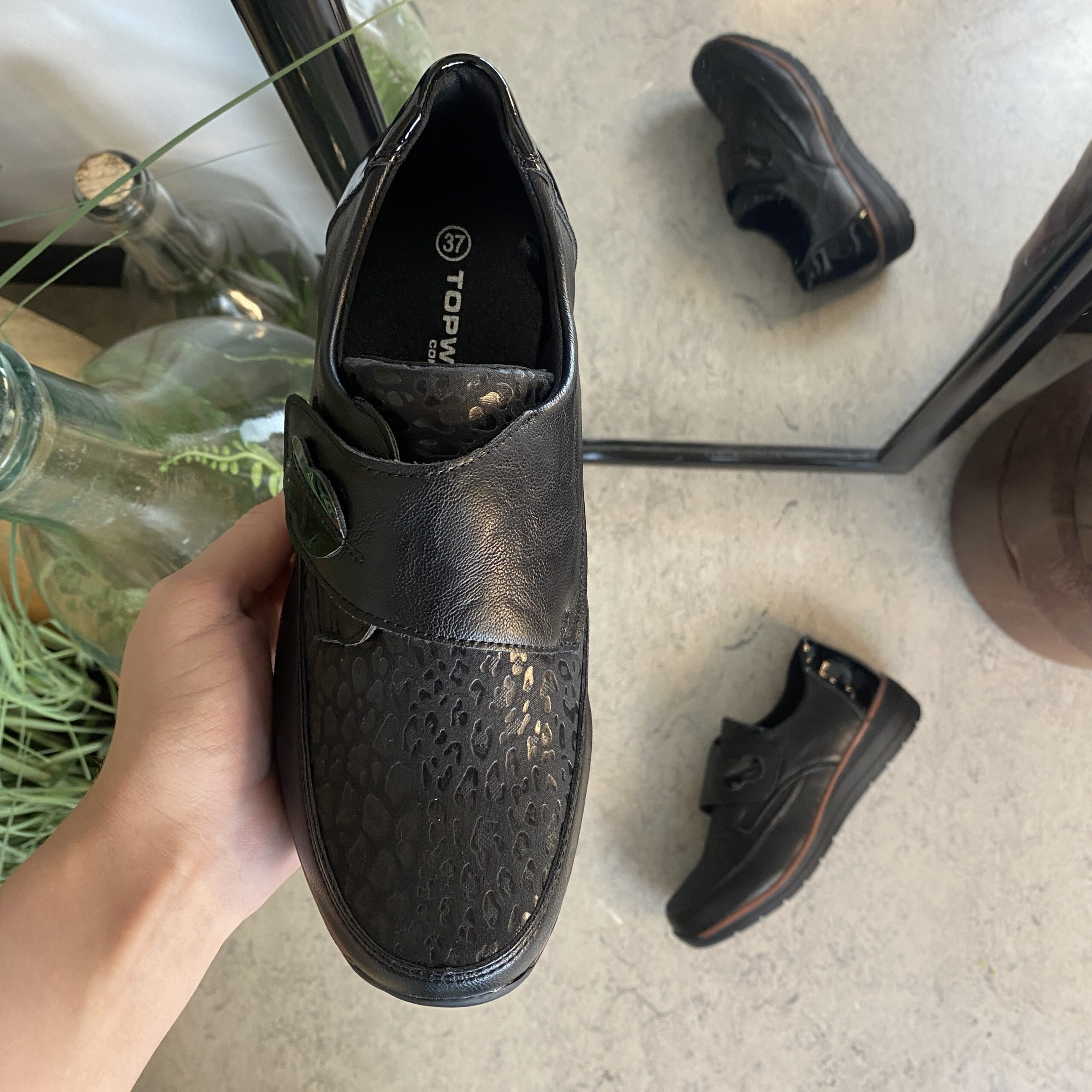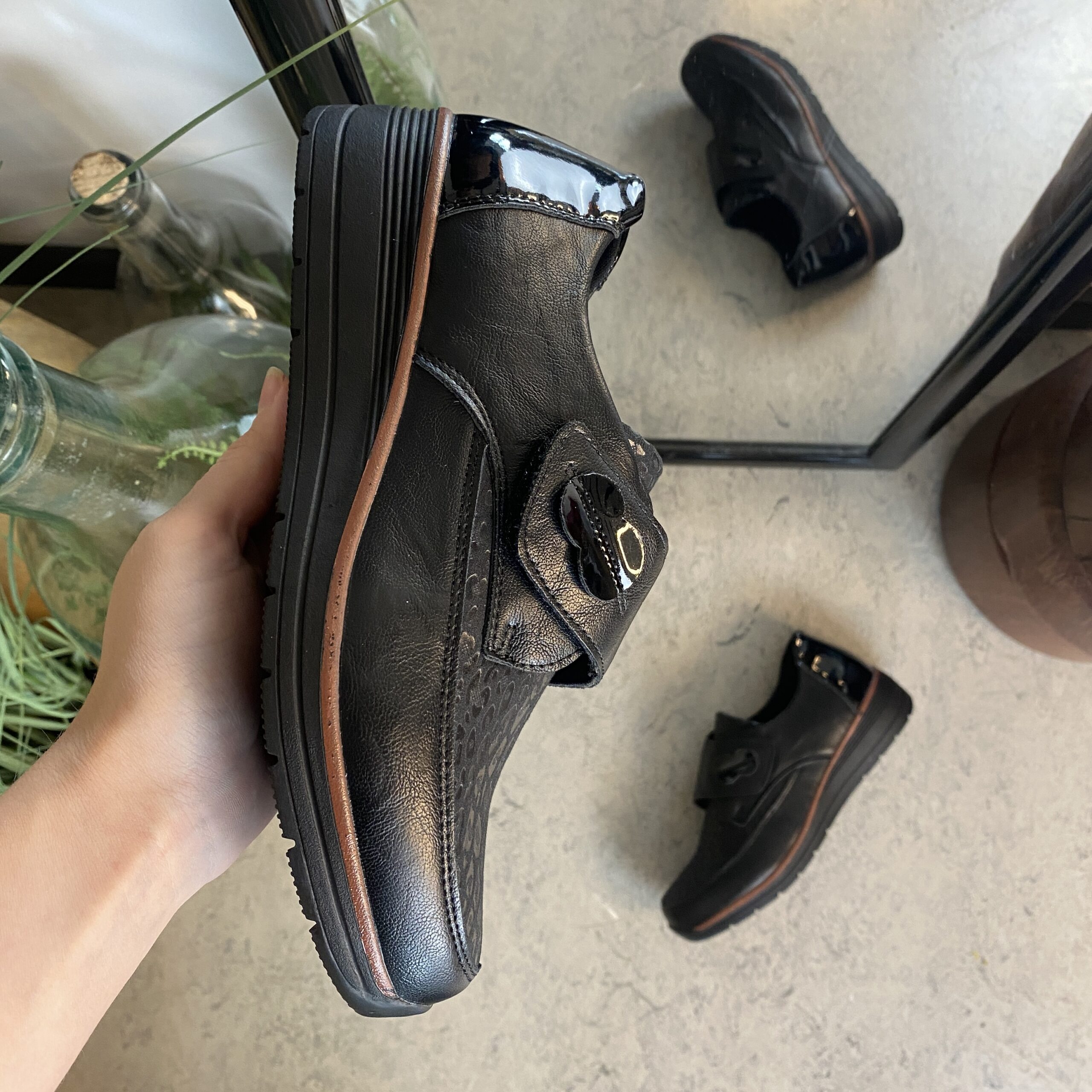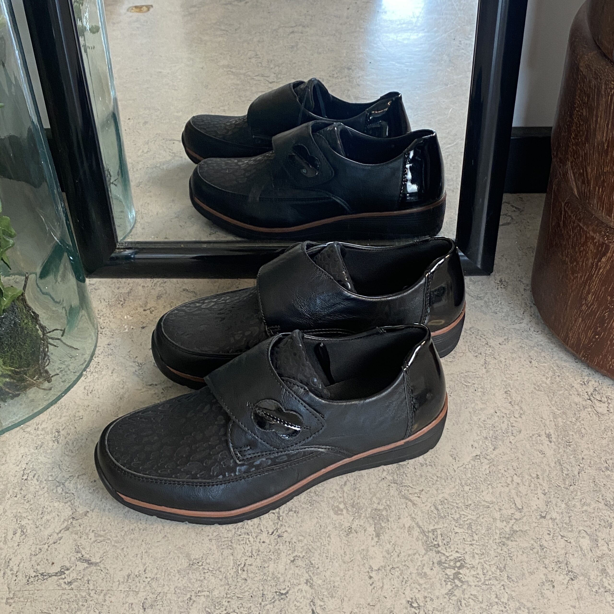 Skoen har borrelåslukning som gjør den enkel å ta av og på.