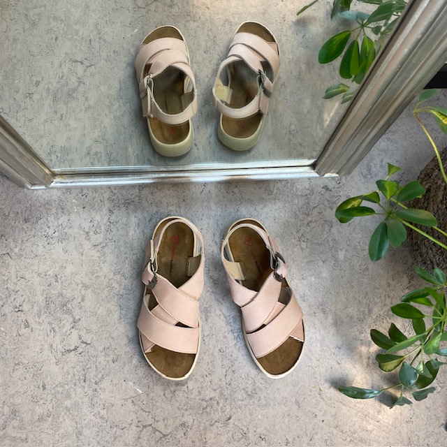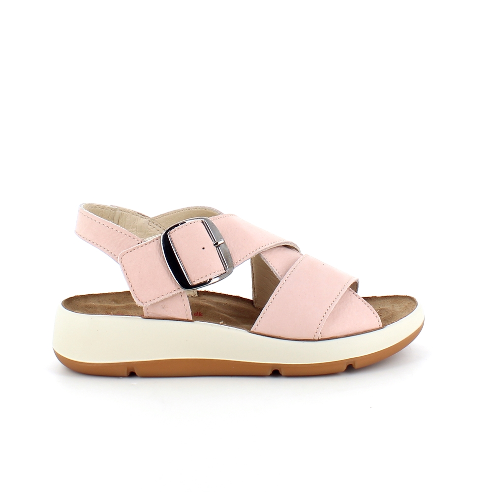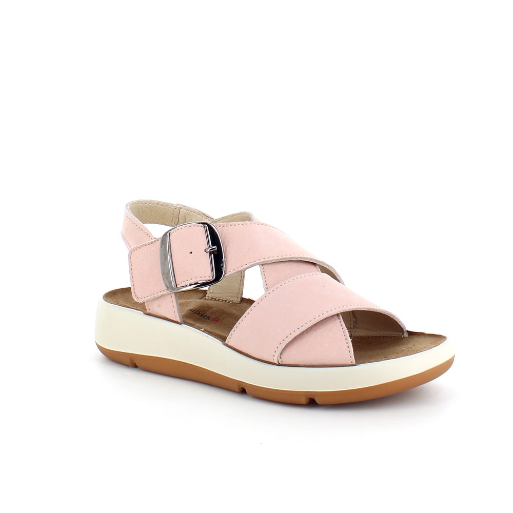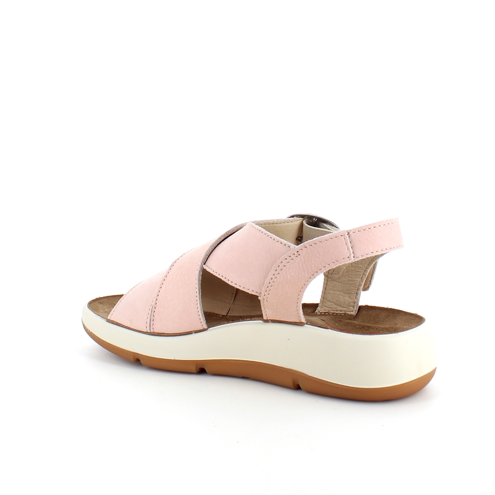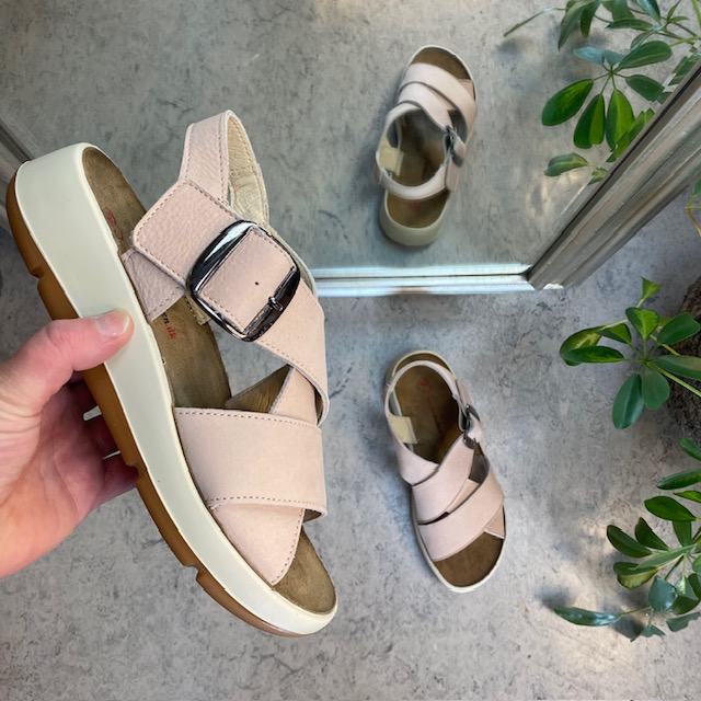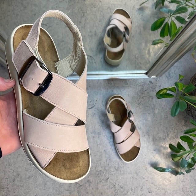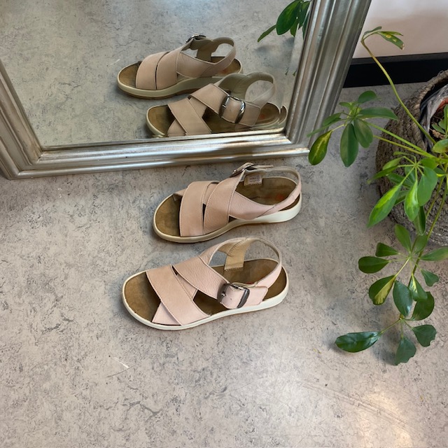 Sandalene har kryssende stropper over forfoten i et smart design, lukkes med en smart spenne, og det er sydd inn et stykke elastikk for å forbedre komforten under gange.