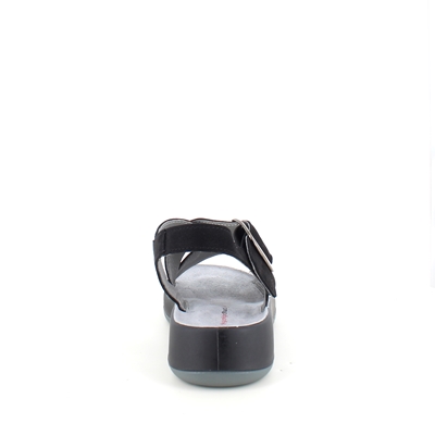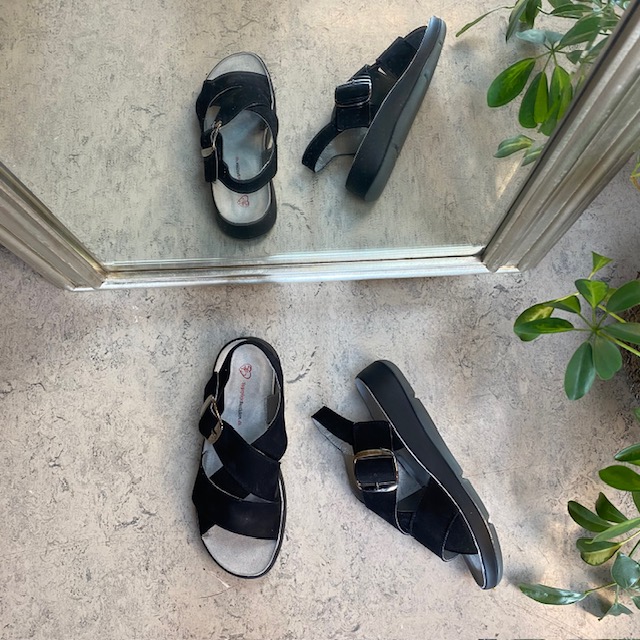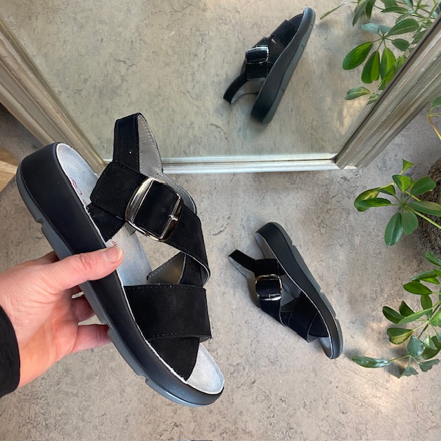 Sandalene har kryssende stropper over forfoten i et smart design, lukkes med en smart spenne, og det er sydd inn et stykke elastikk for å forbedre komforten under gange.