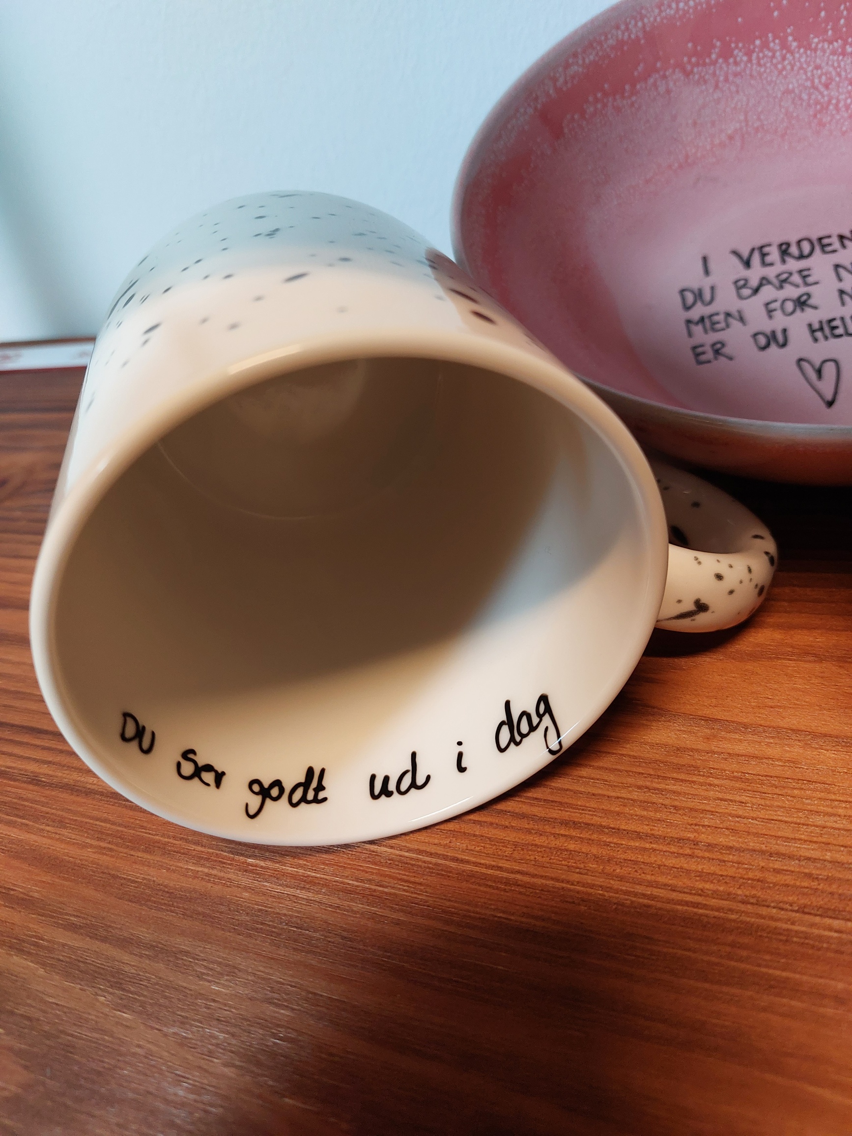 Men det er når du kikker inn i kruset at du blir overrasket. Her finner du en tekst som er nøye utvalgt for å bringe et smil til dine lepper. Vi overlater valget av innvendig tekst til deg, slik at du kan finne den meldingen som passer perfekt til ditt humør og daglige glede.