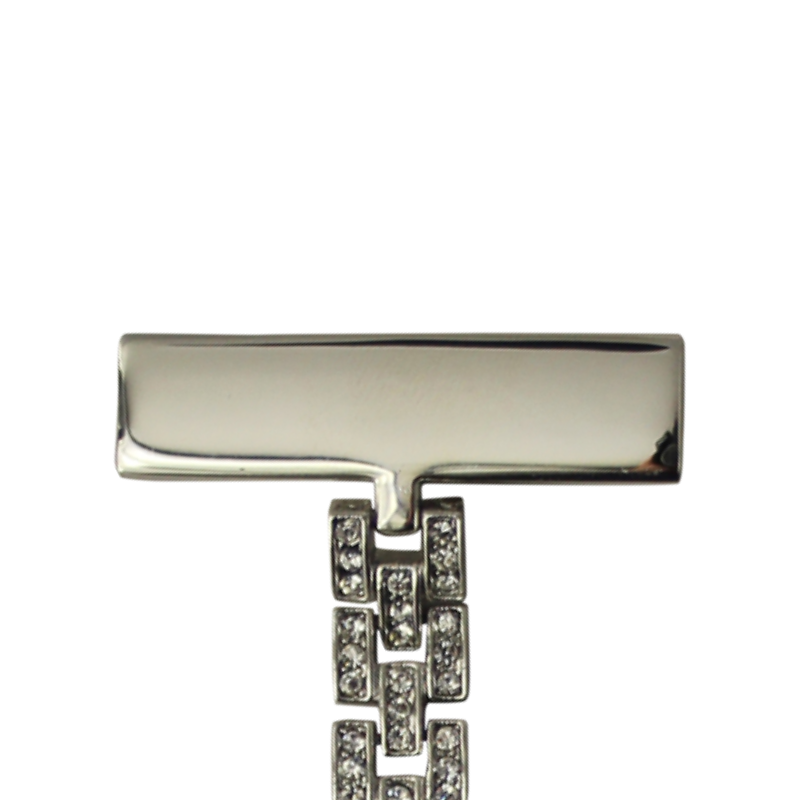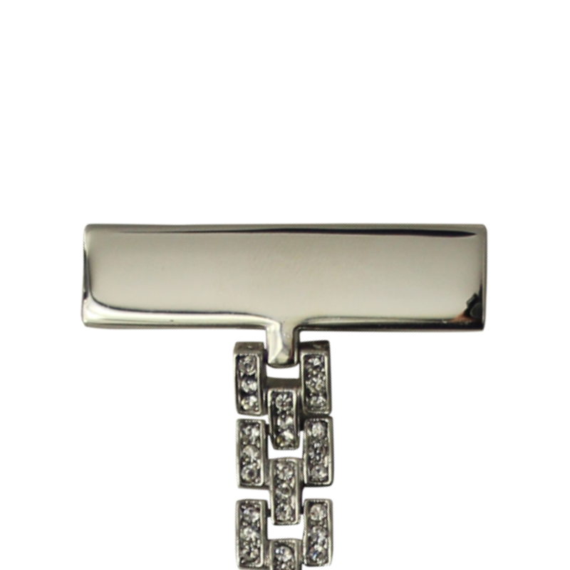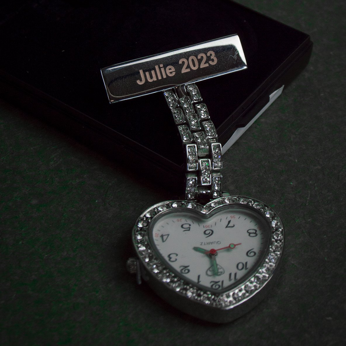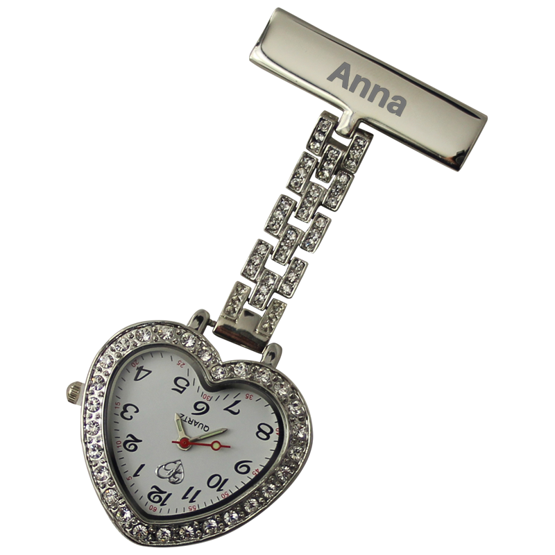 Feminint sykepleierur med krystaller rundt kanten av urskiven og gravering. Uret er formet som et hjerte. Det er 8 cm langt og 3,5 cm bredt.