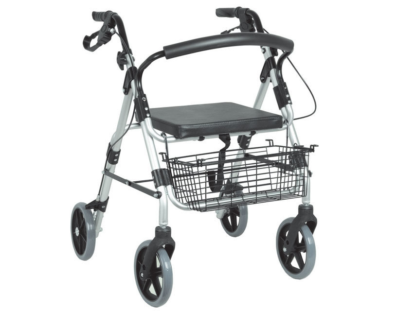 Rullatoren har et sete og ryggstøtte, en stor handlekurv foran og bremser på bakhjulene.
