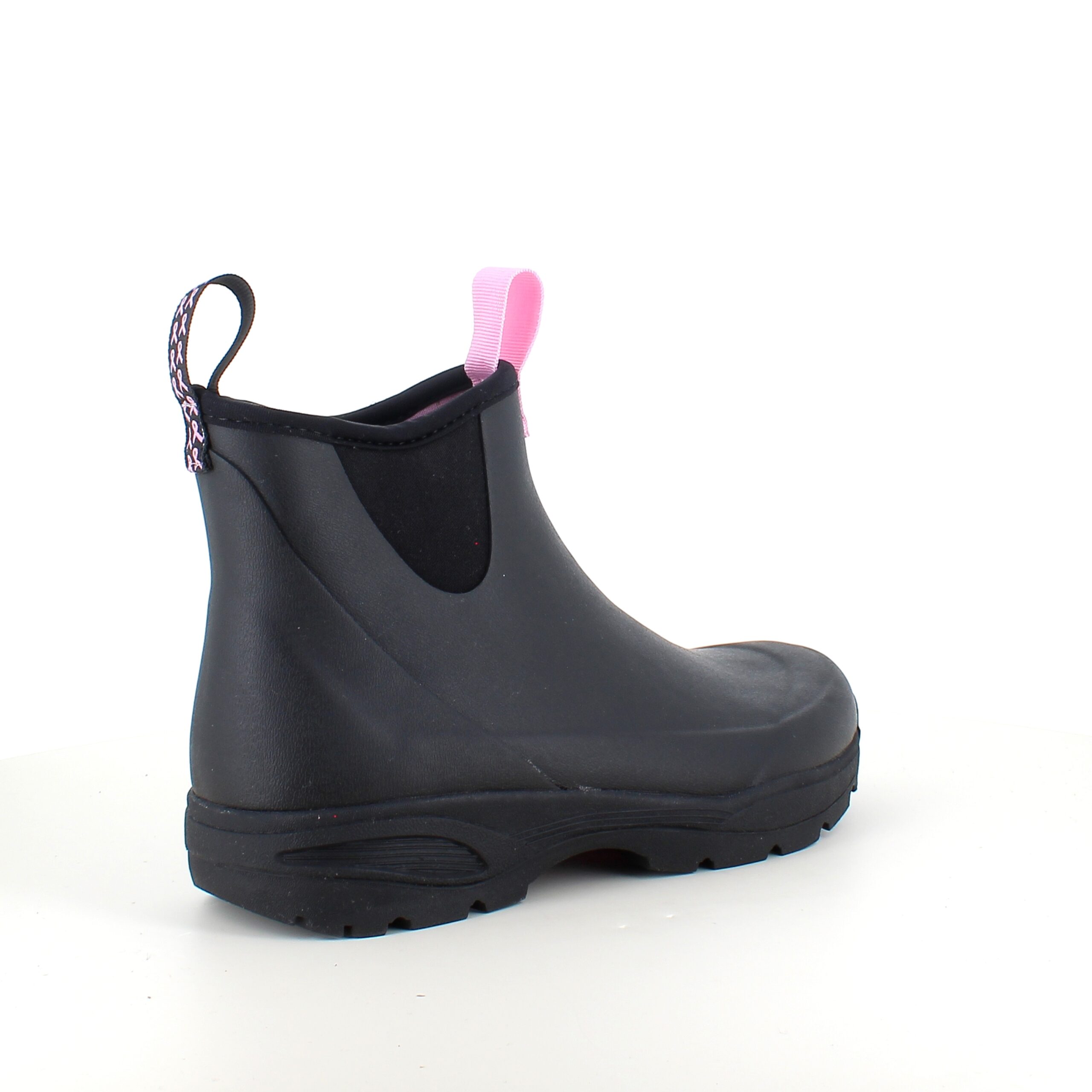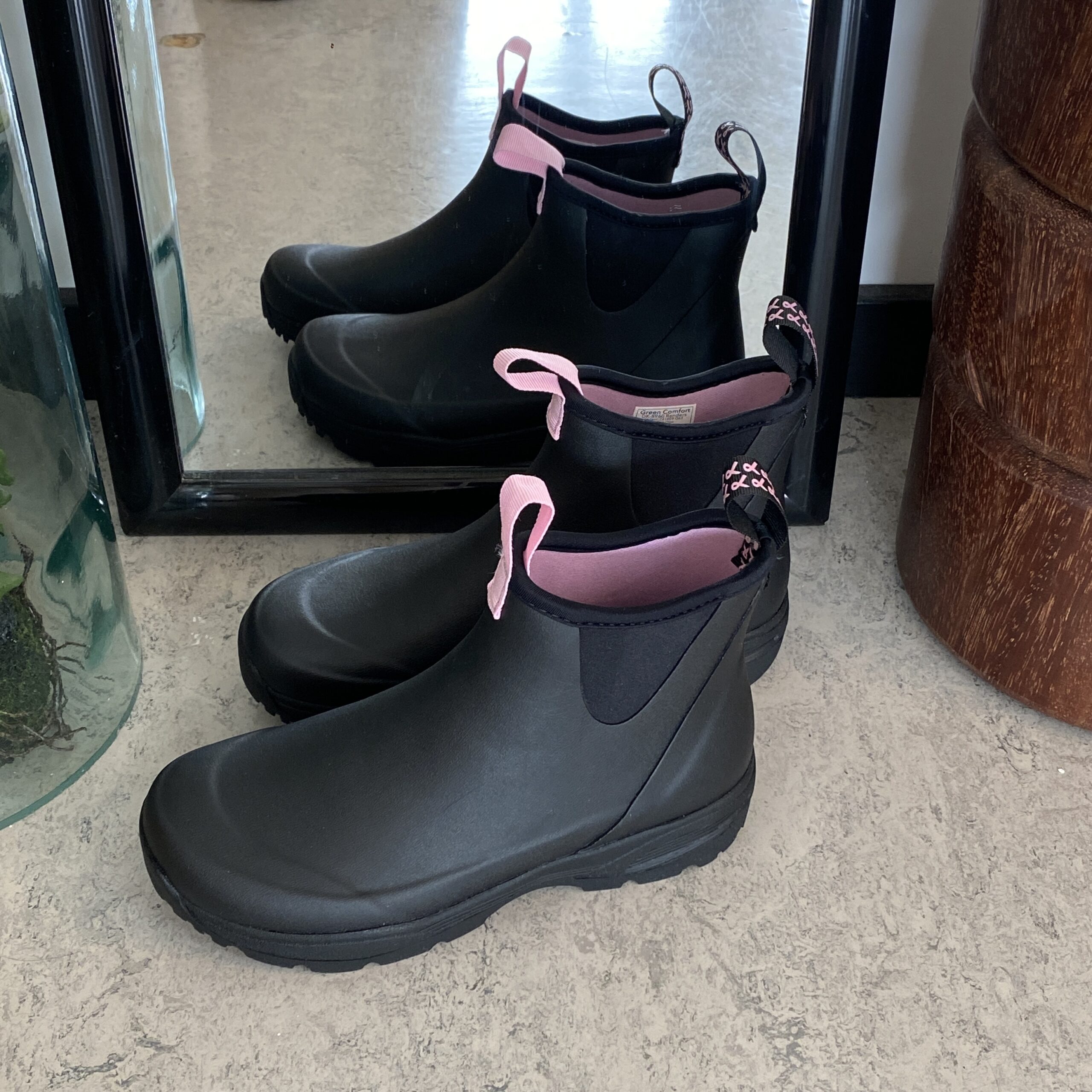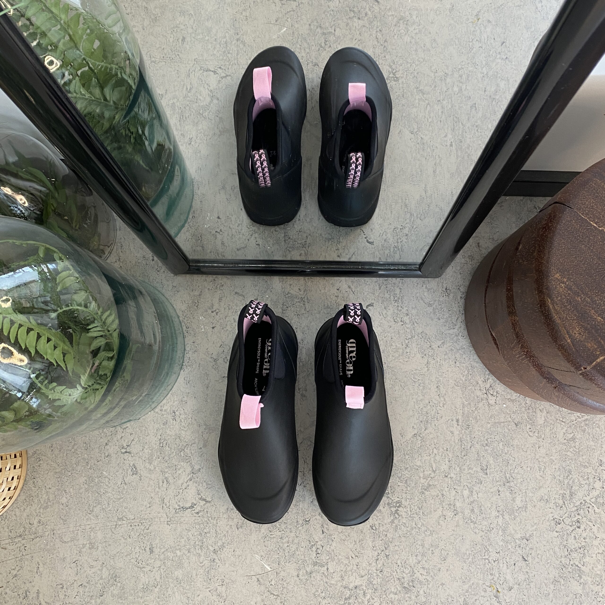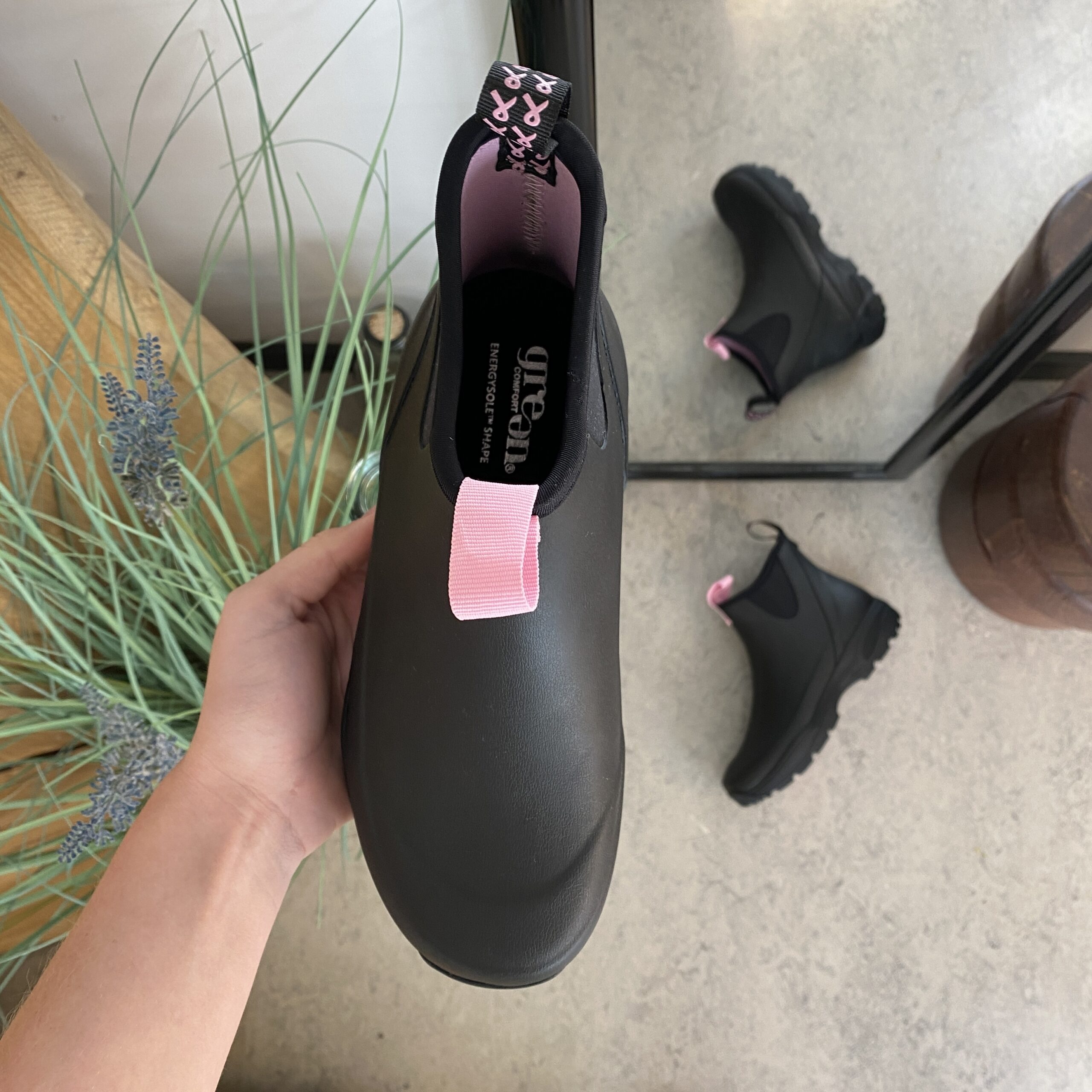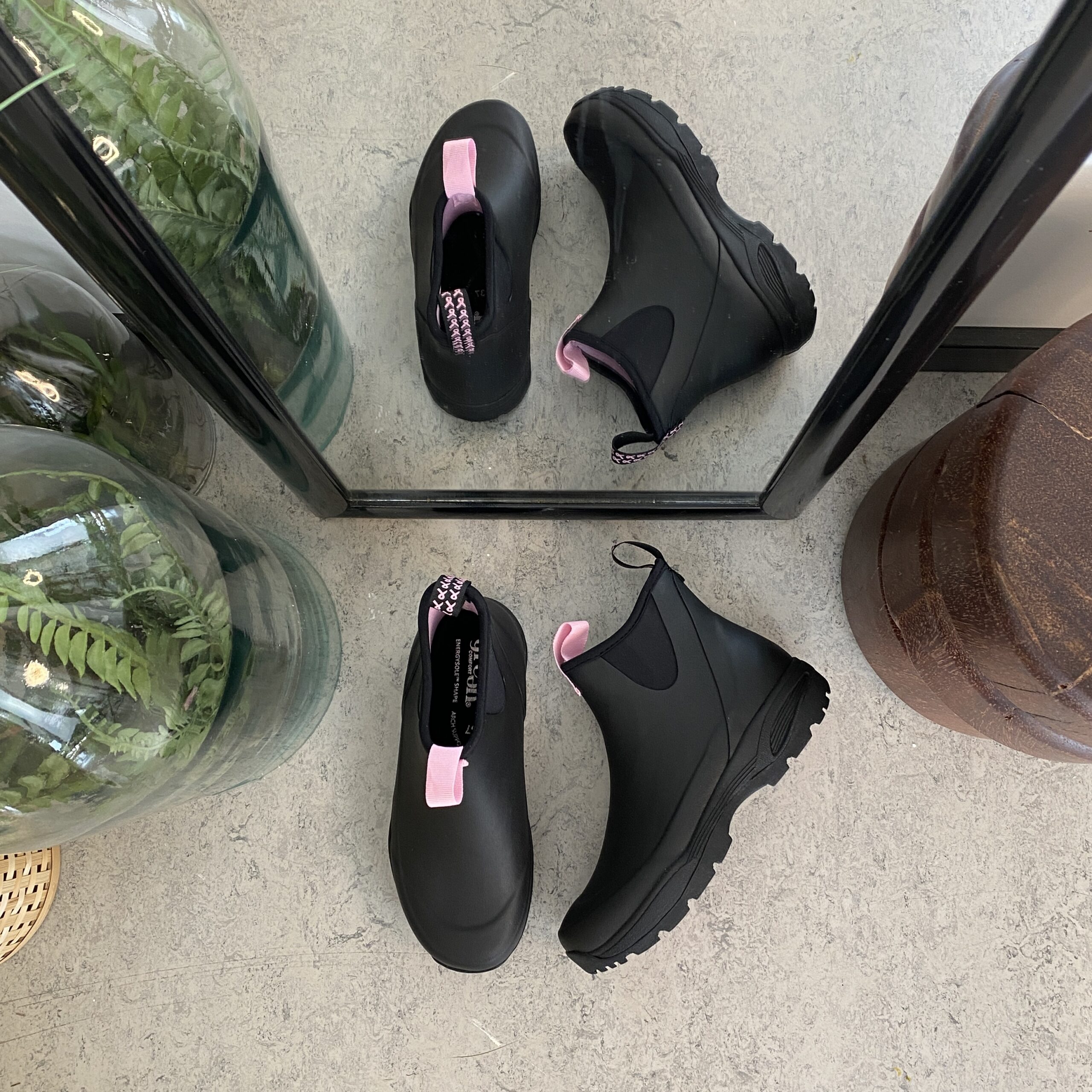 Opplev våre svarte gummistøvler, skapt med omtanke og i samarbeid med Støt Brysterne, hvor den gjenkjennelige rosa fargen elegant fremheves i bunnen av støvelen samt i den dekorative sløyfen, som pryder den ene stroppen.