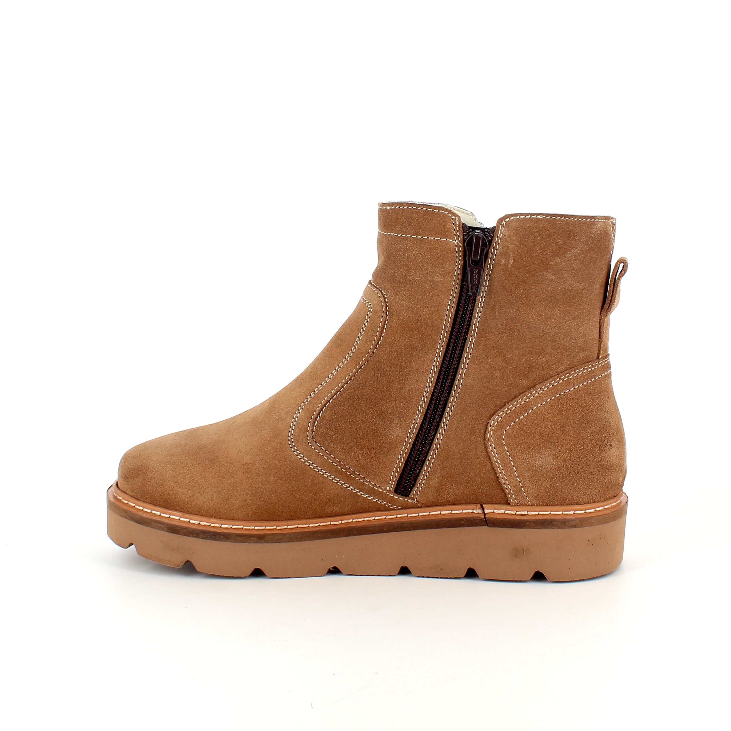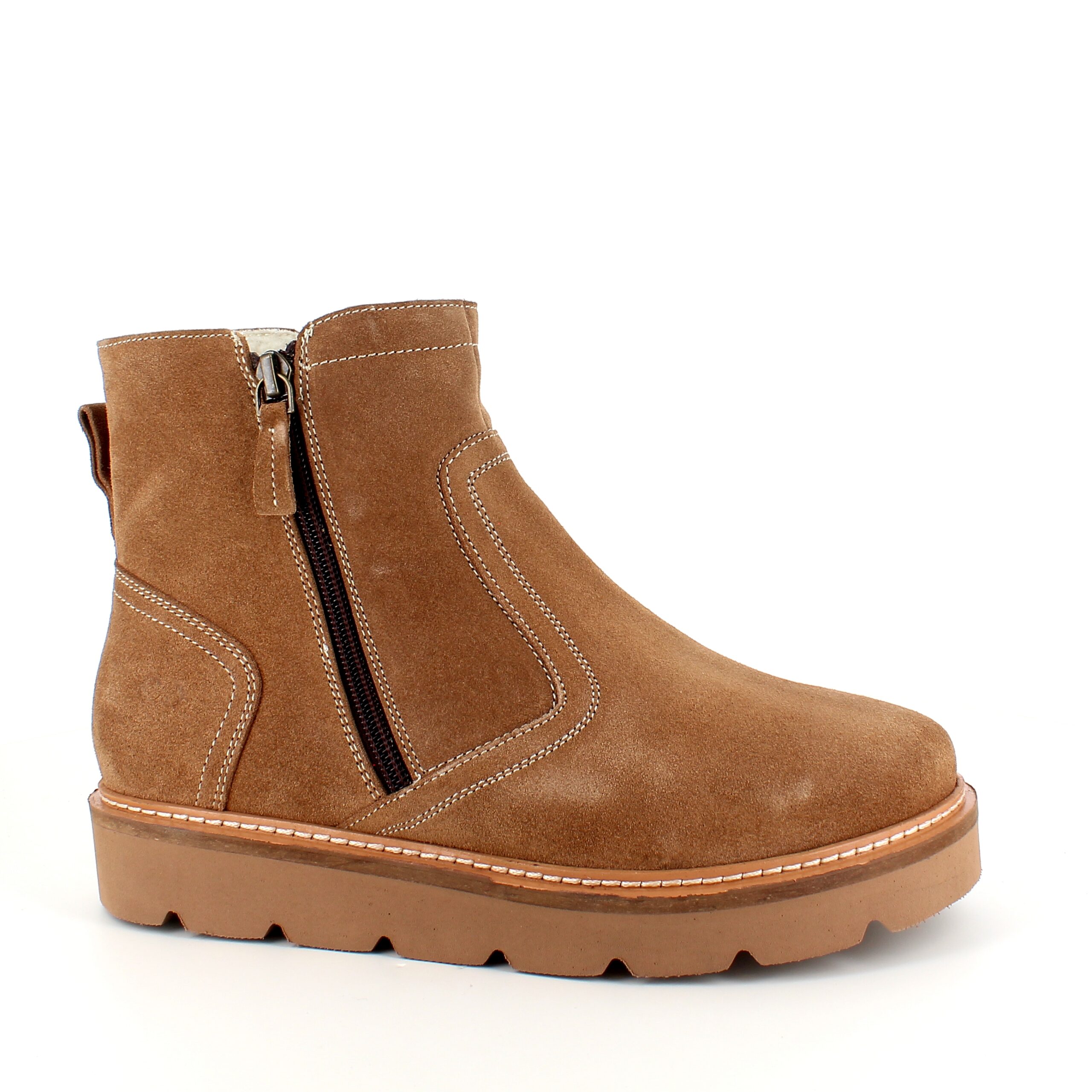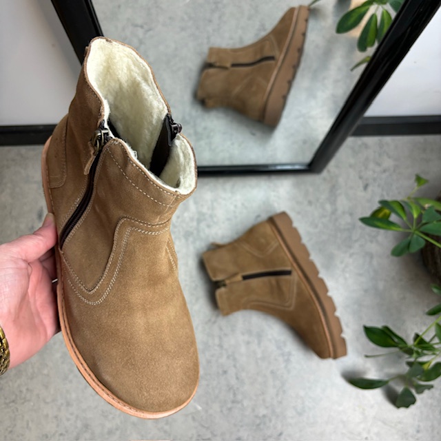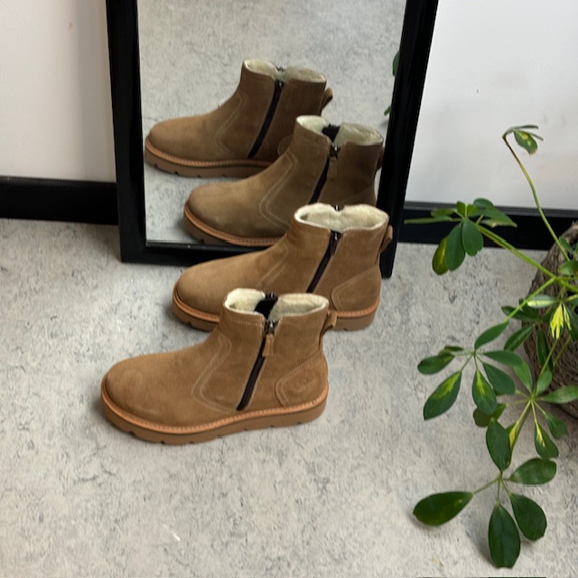 Den er laget av semsket skinn og har et varmt ullfôr som holder føttene varme.