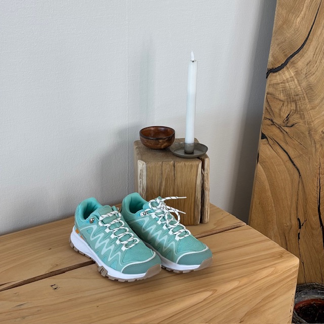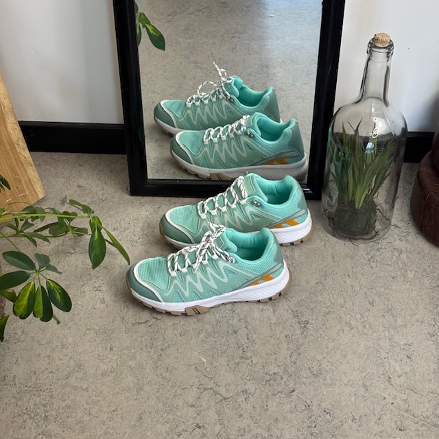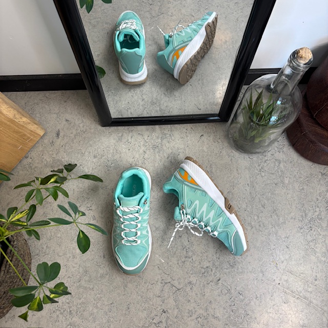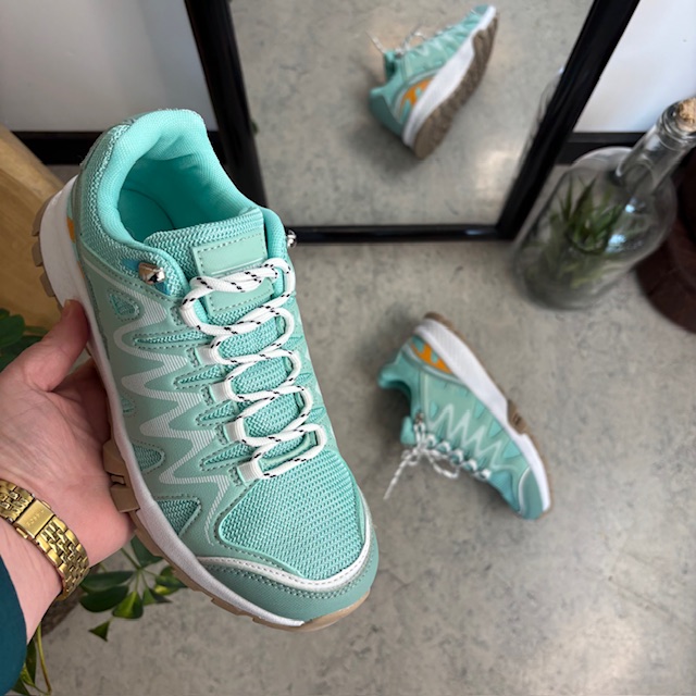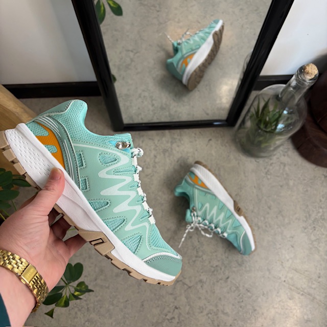 Disse lette og komfortable sko kombinerer et stilrent, grønt design med vakre, hvite detaljer som gir et friskt og feminint uttrykk.