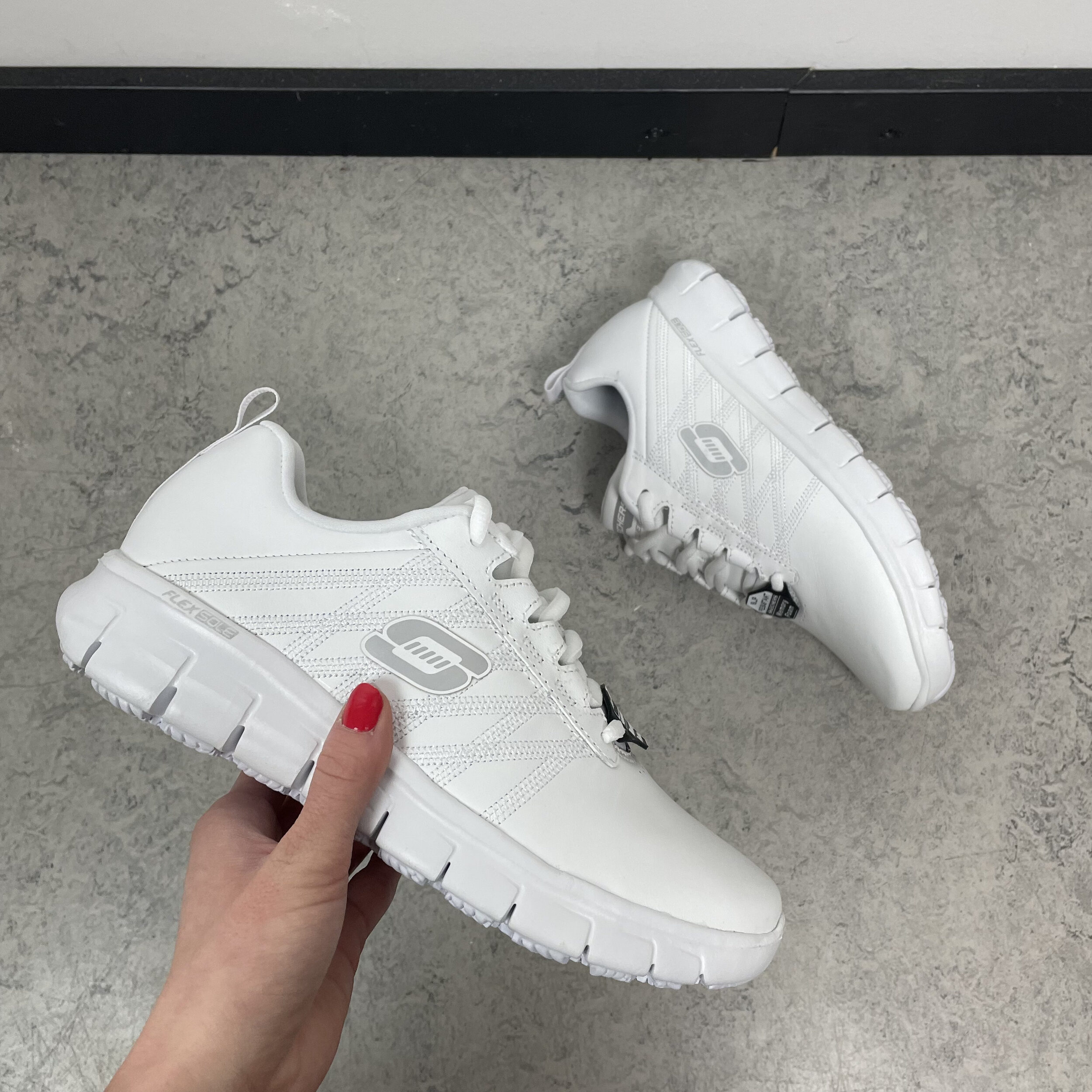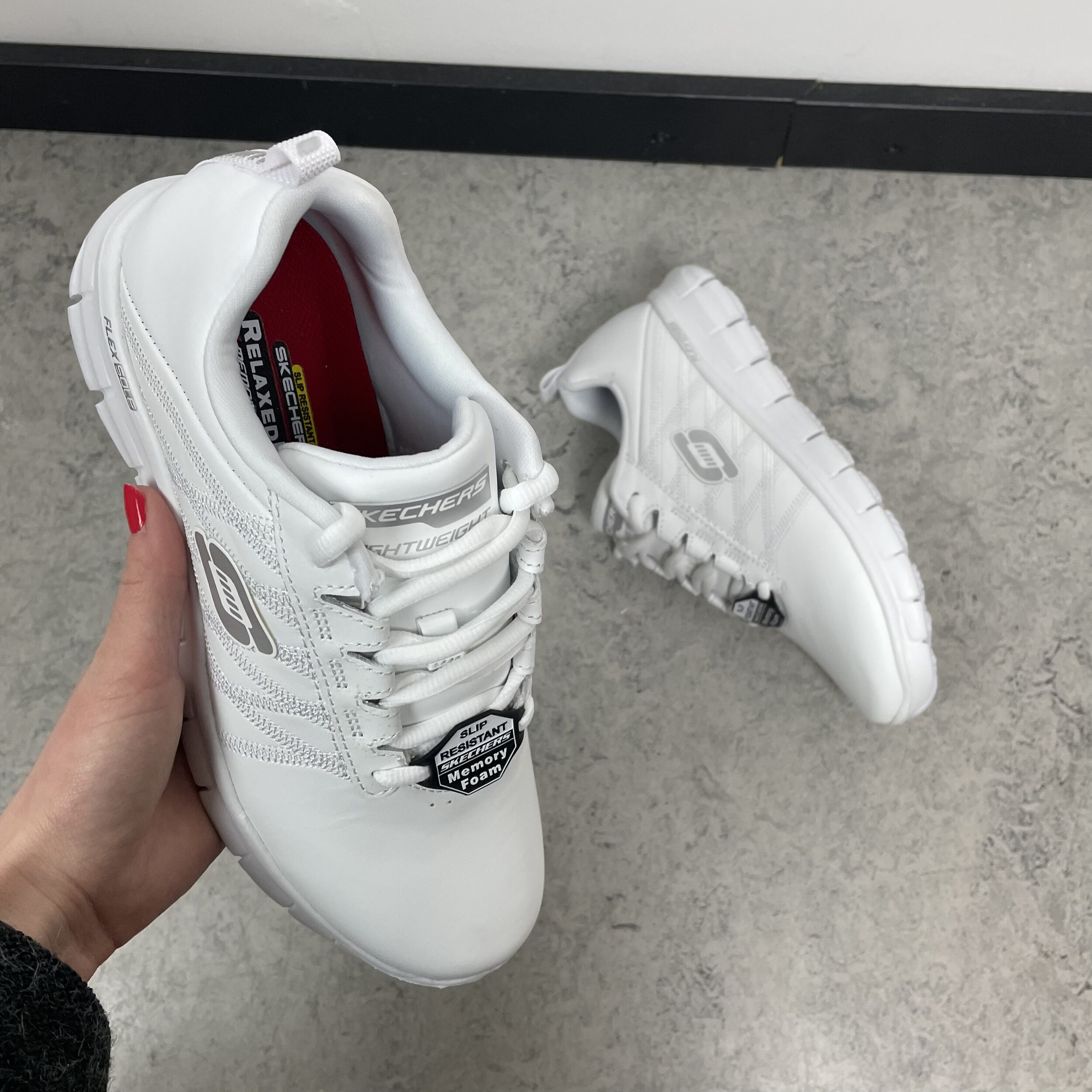 Hvite Skechers arbeidssko.