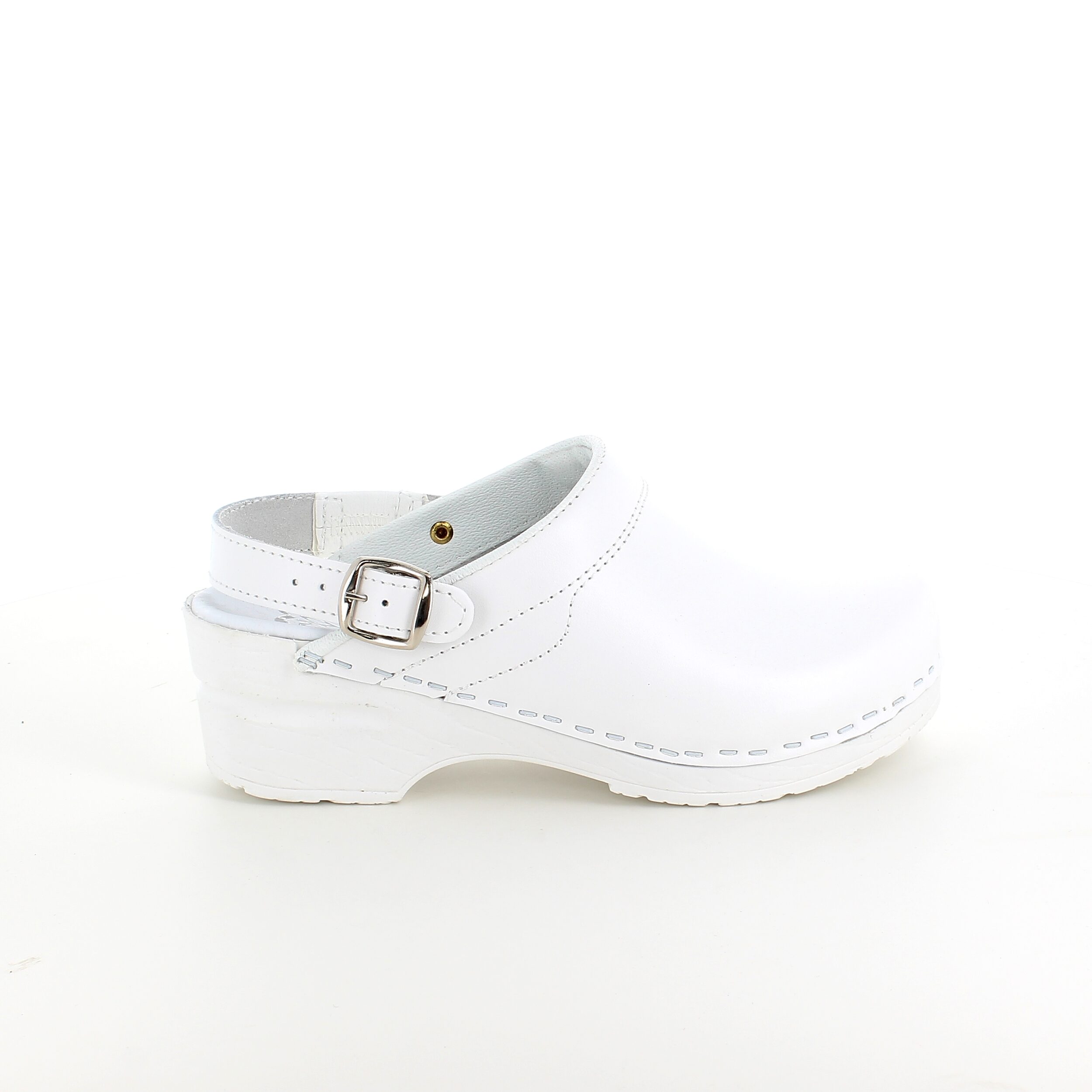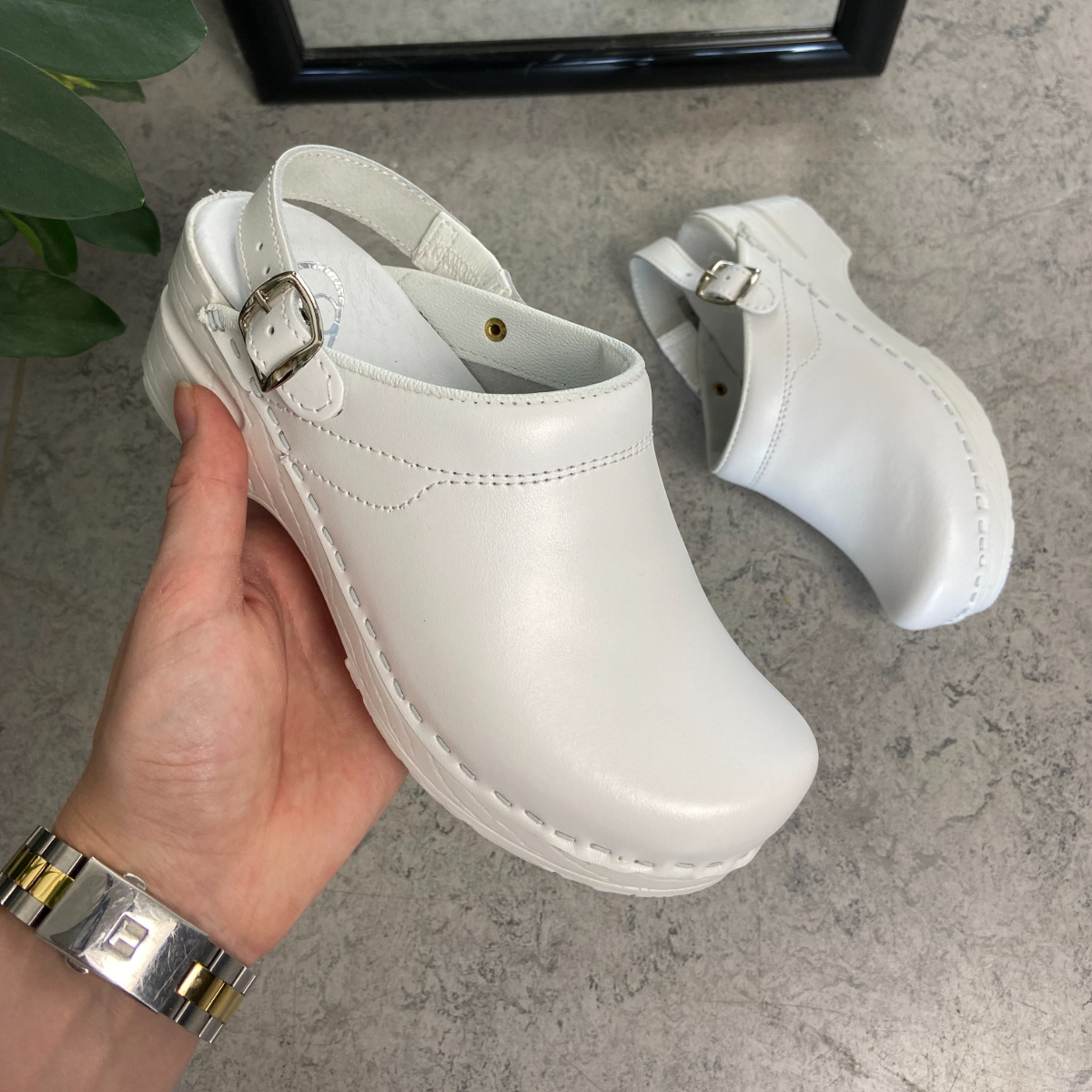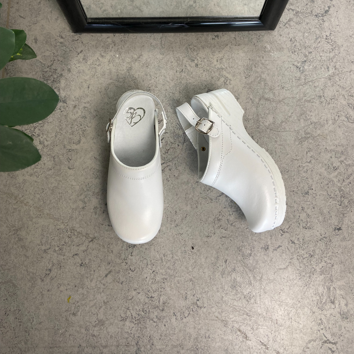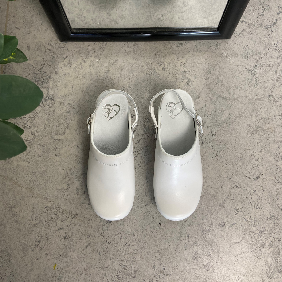 Skinnetresko i hvit med hælrem. Den kan brukes med eller uten rem.