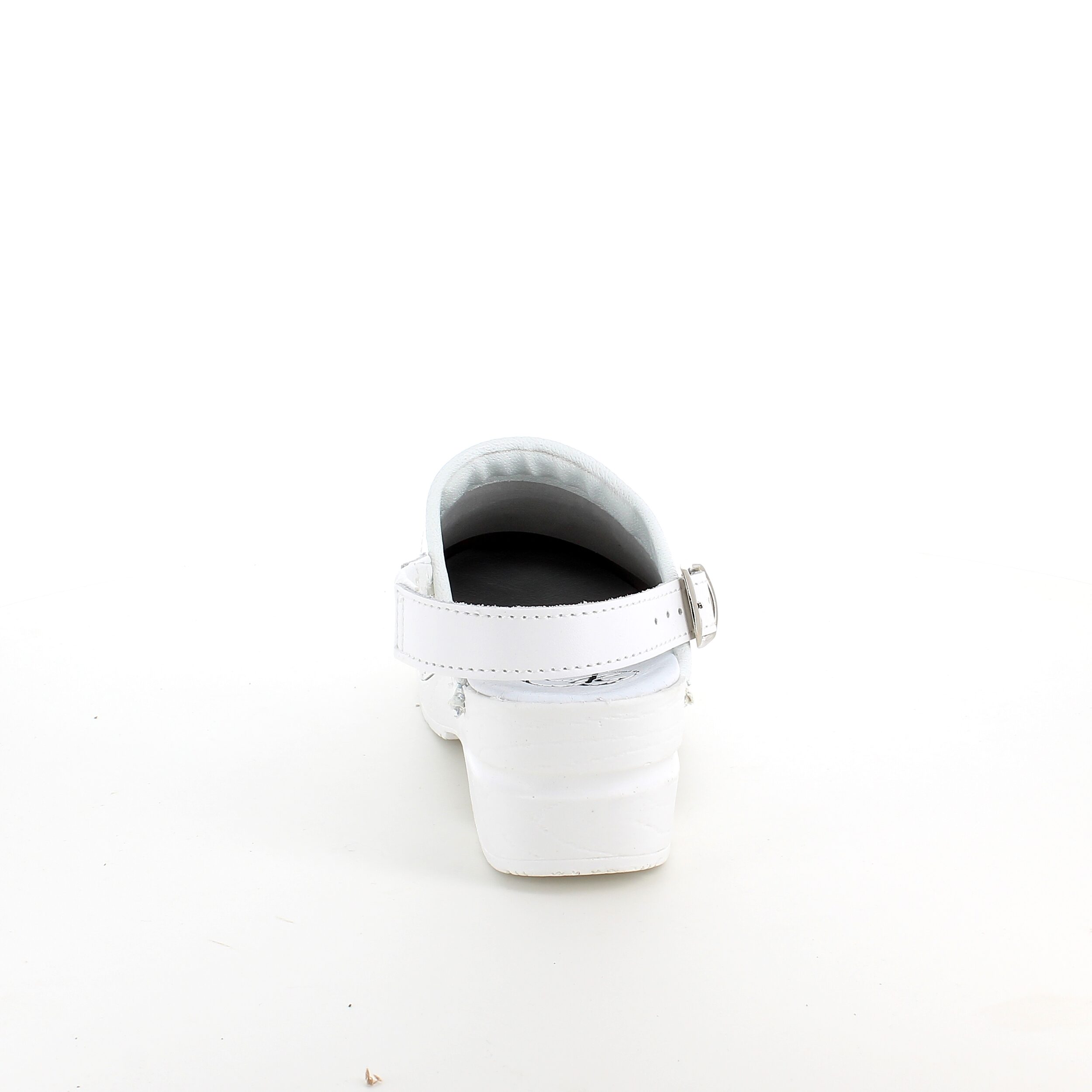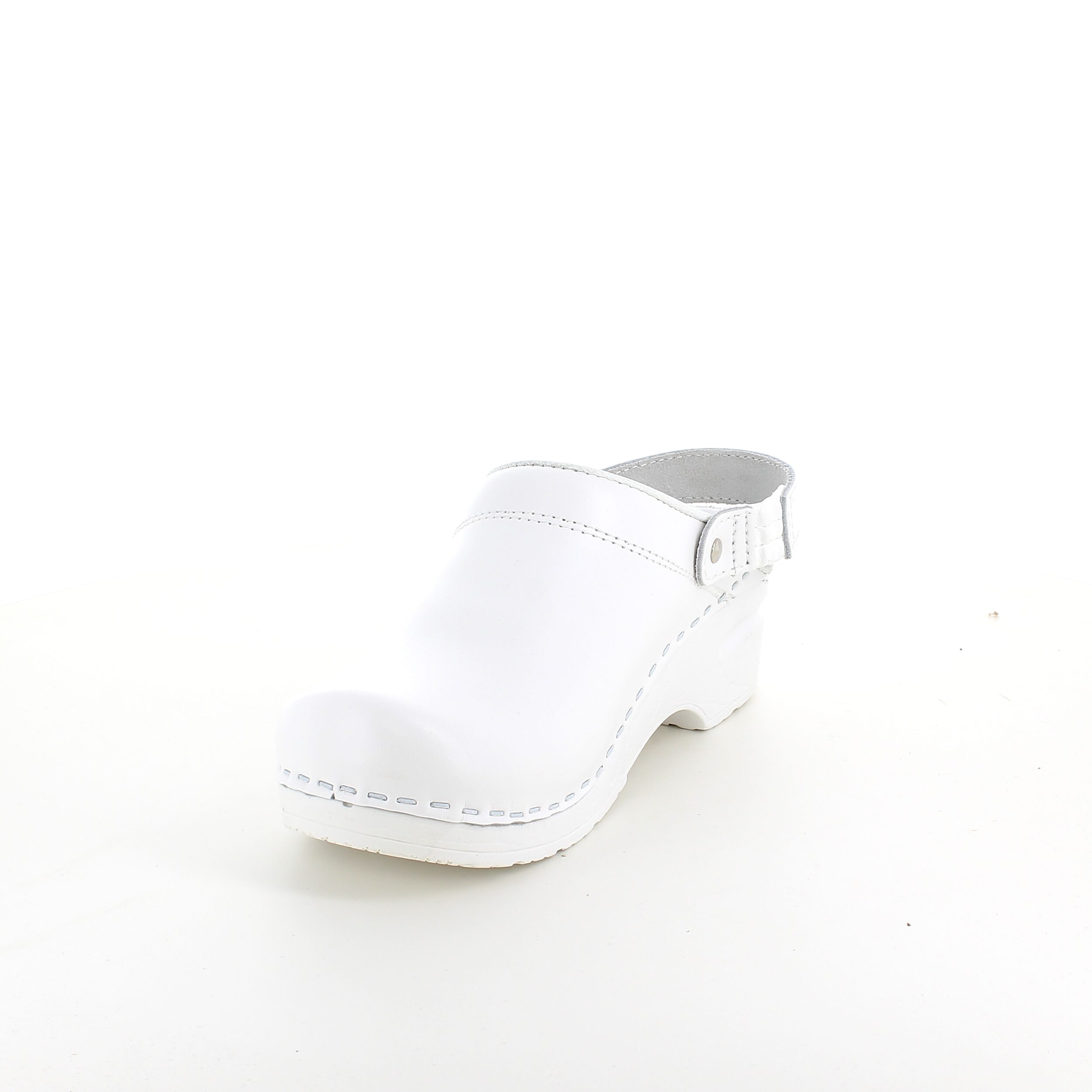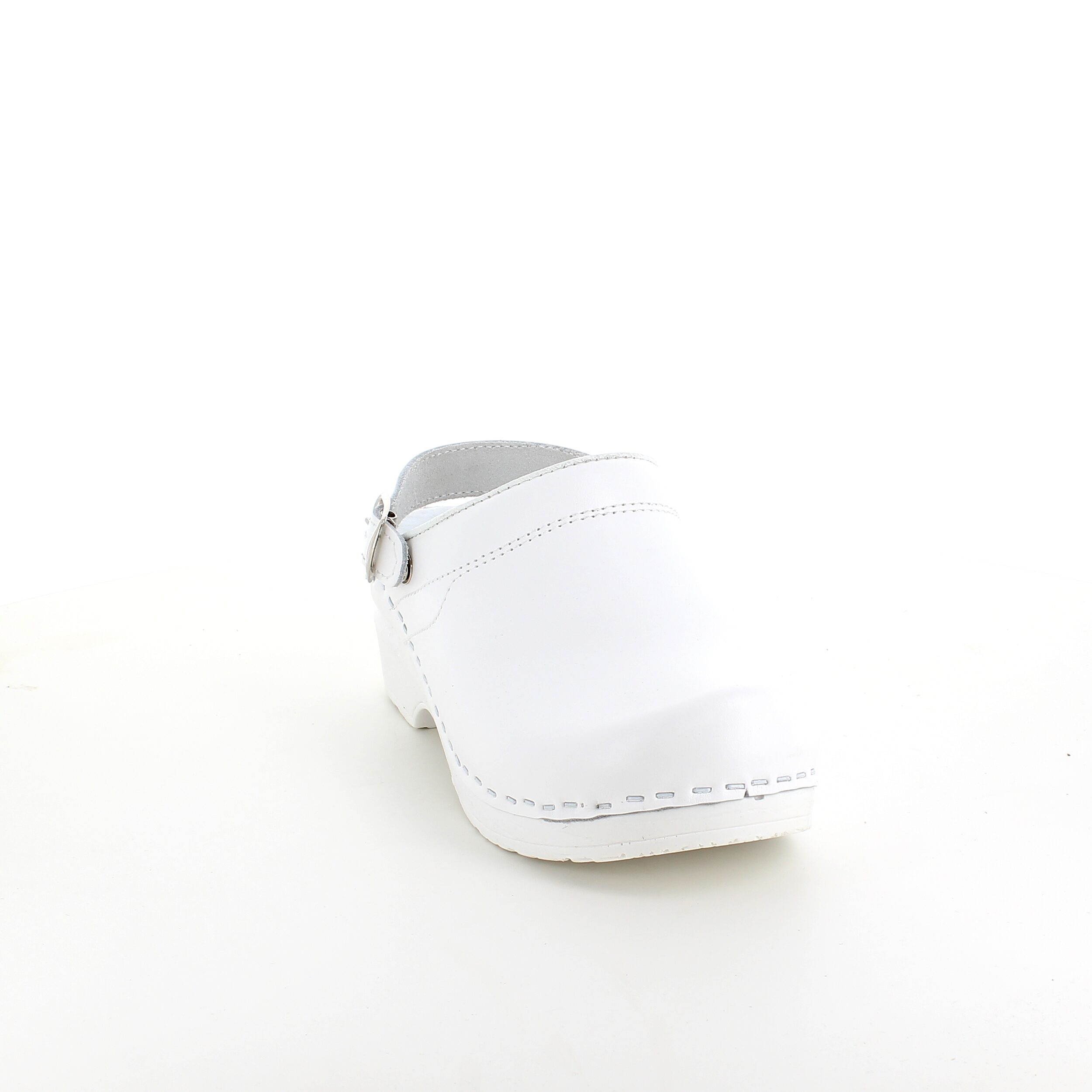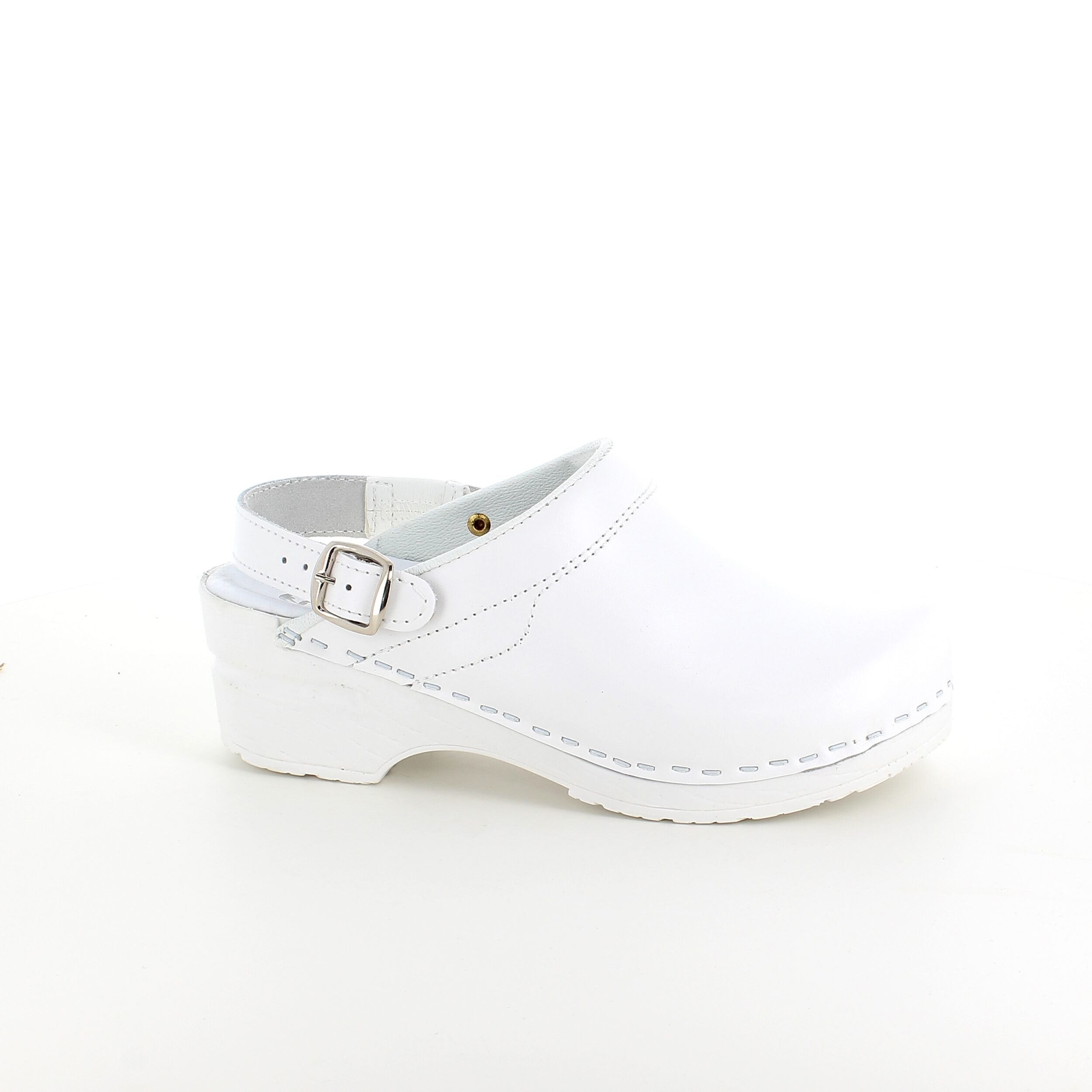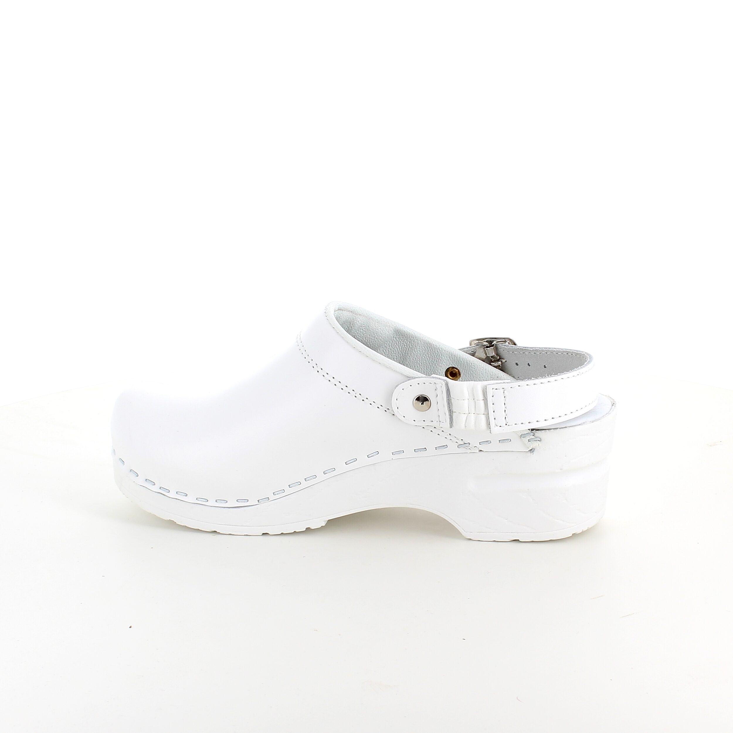 Skinnetresko i hvit med hælrem. Den kan brukes med eller uten rem.