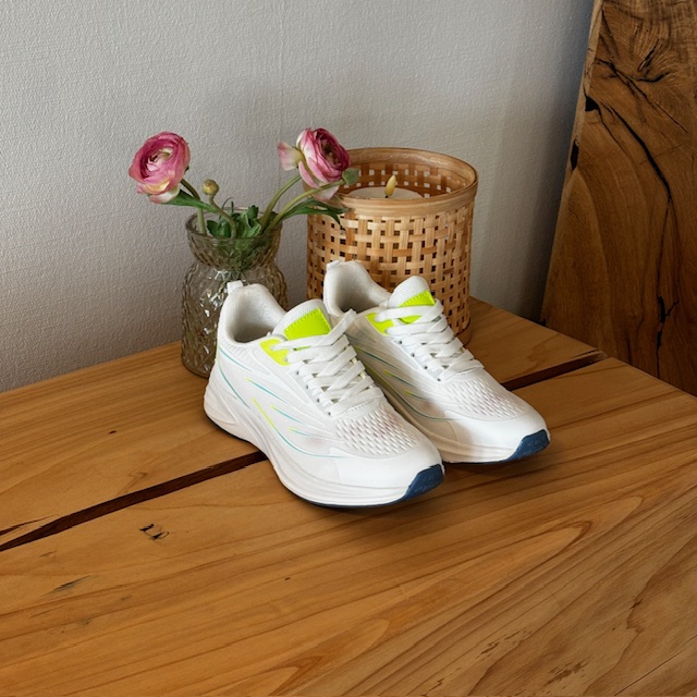 Hvite sneakers med stilige gule og grønne detaljer ved lissene og på siden av skoen.