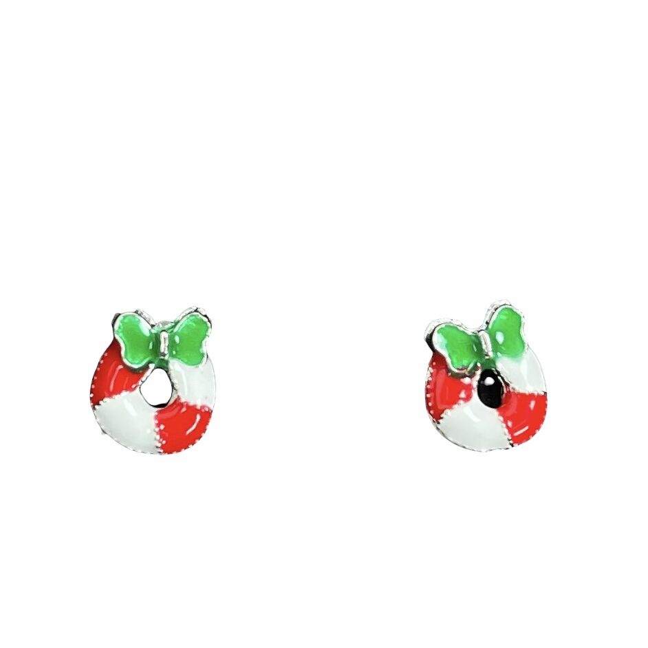 Fine julekrans øreringer i sølvtoner med røde, hvite og grønne detaljer.