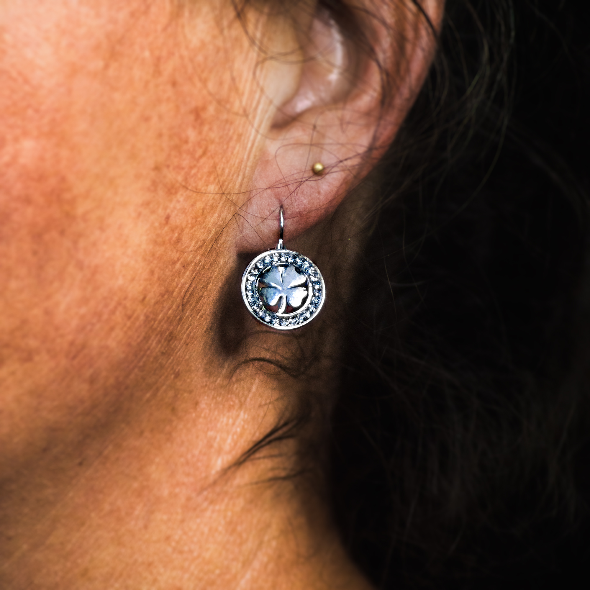 Øredobber med kløver i sølvfarget tone. Søte små steiner i en sirkel rundt om firkløveren.