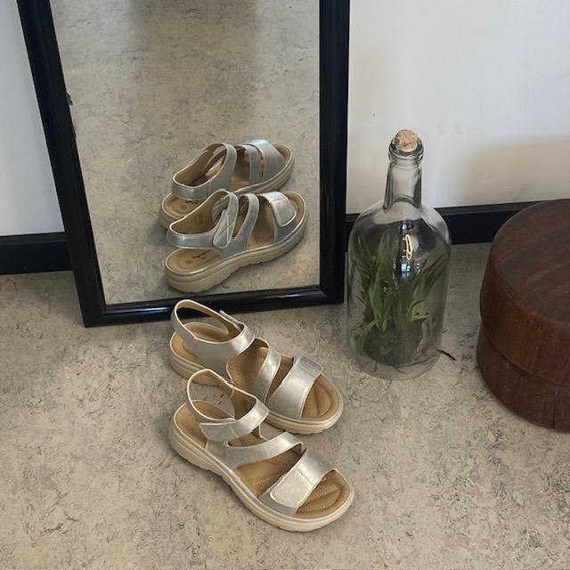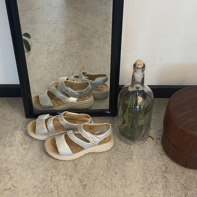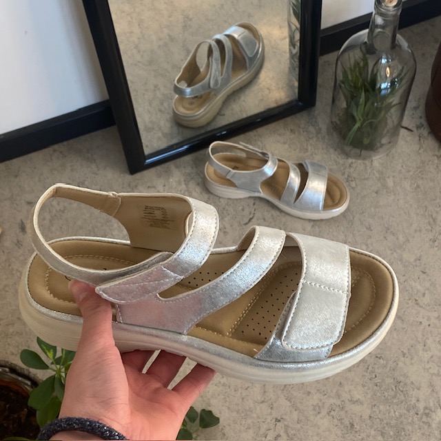 Gjør arbeidsdagene og gåturene dine litt mer glitrende med denne stilrene og superkomfortable sandalen i sølv. Den er designet med to brede velcrostropper, slik at du enkelt kan justere passformen – perfekt for deg som ønsker god støtte og stabilitet hele dagen.
