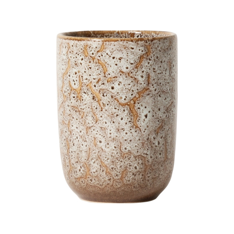Trå inn i en verden av subtil eleganse med vårt brune krus, som kommer uten håndtak og måler 8×12 cm. Dette kruset er laget for å tilføre en ekstra dimensjon av stil til din daglige drikkeopplevelse.