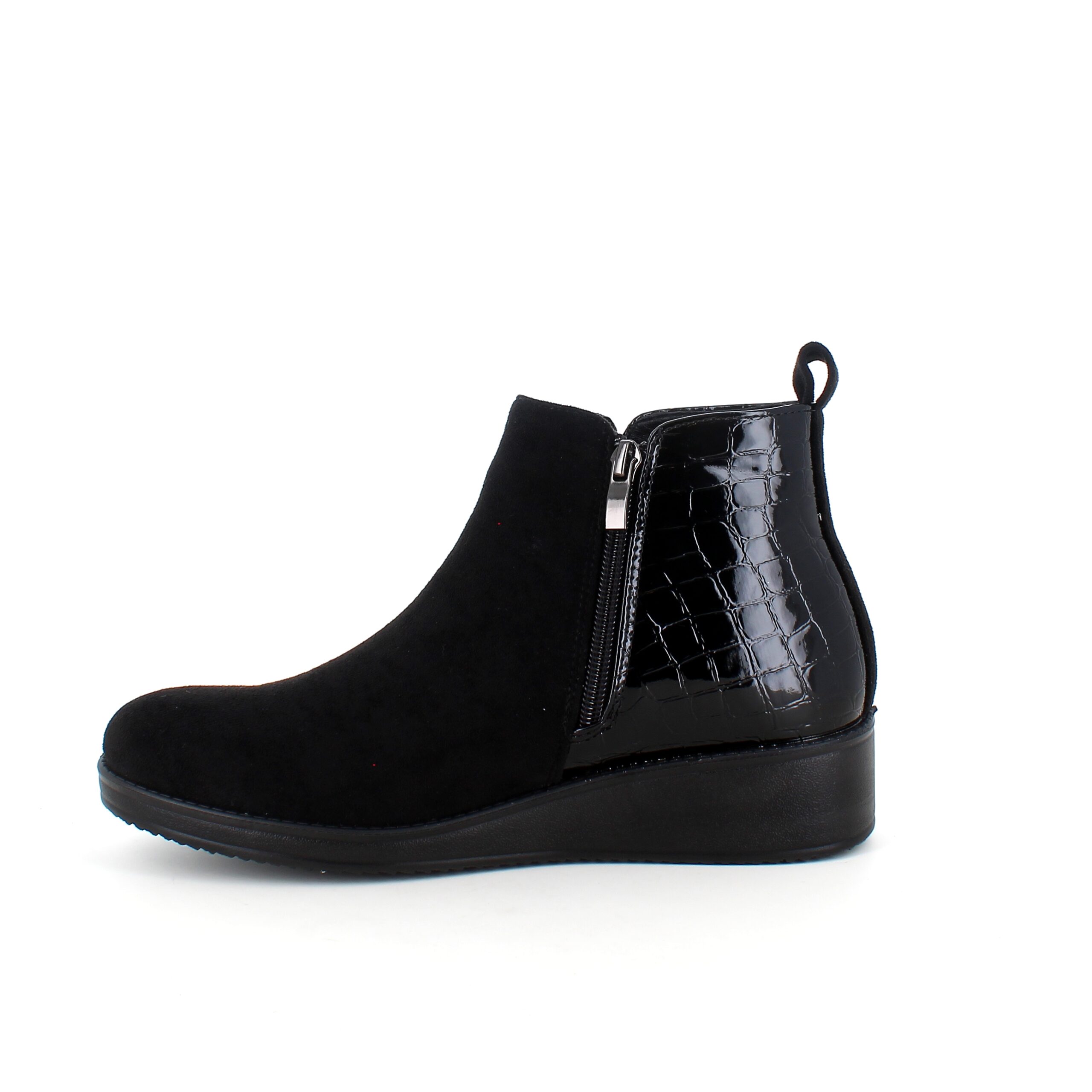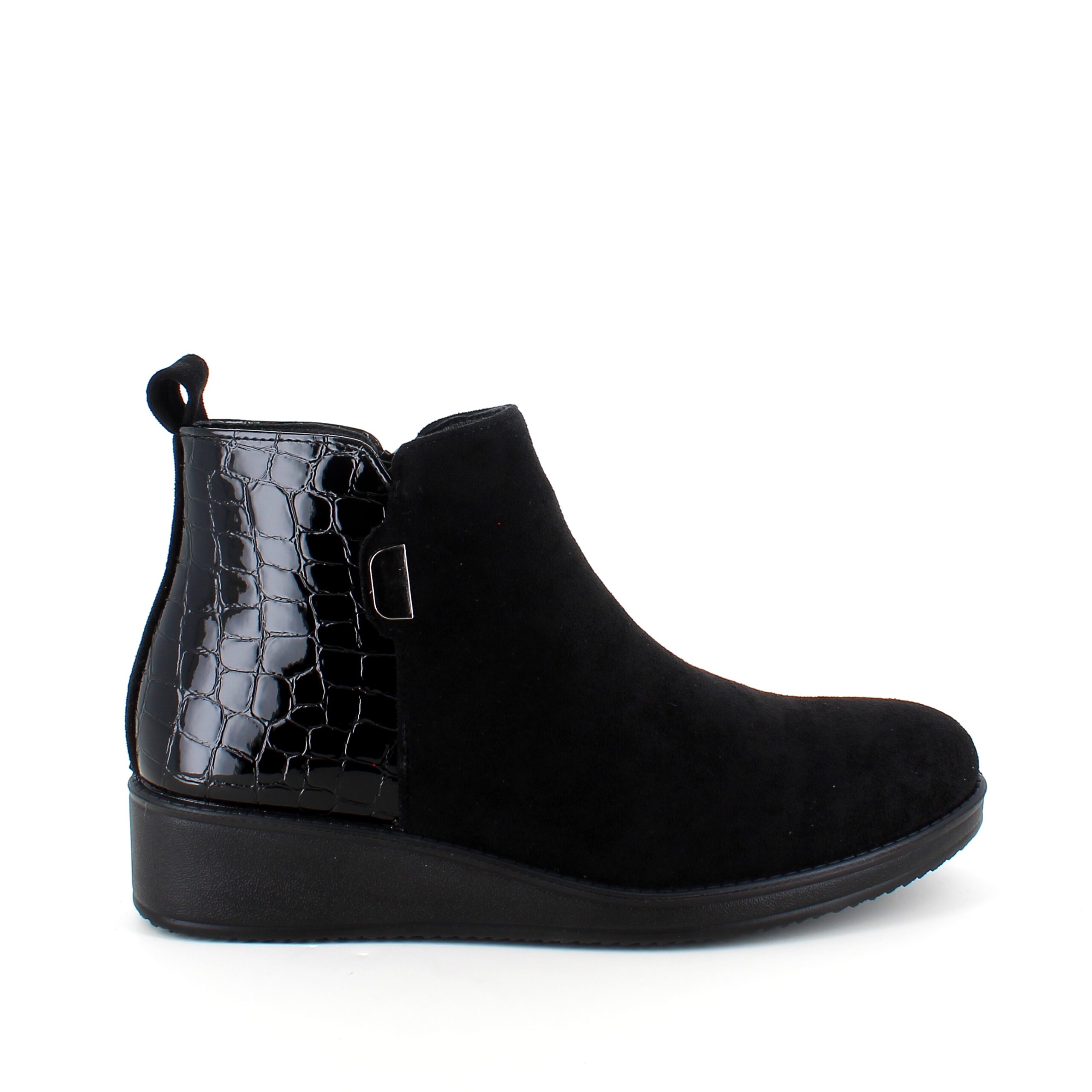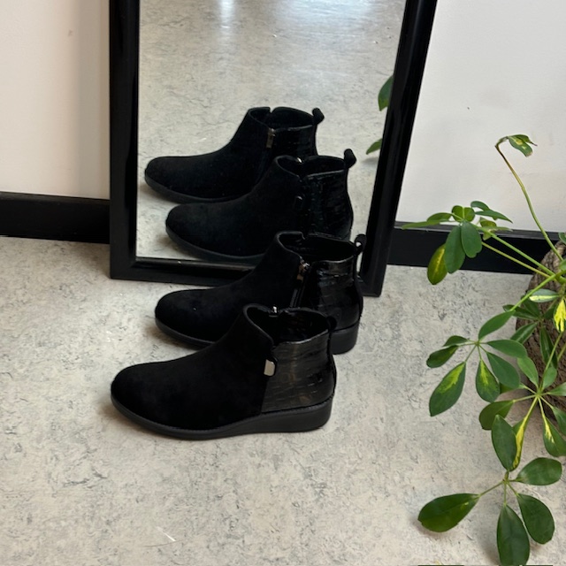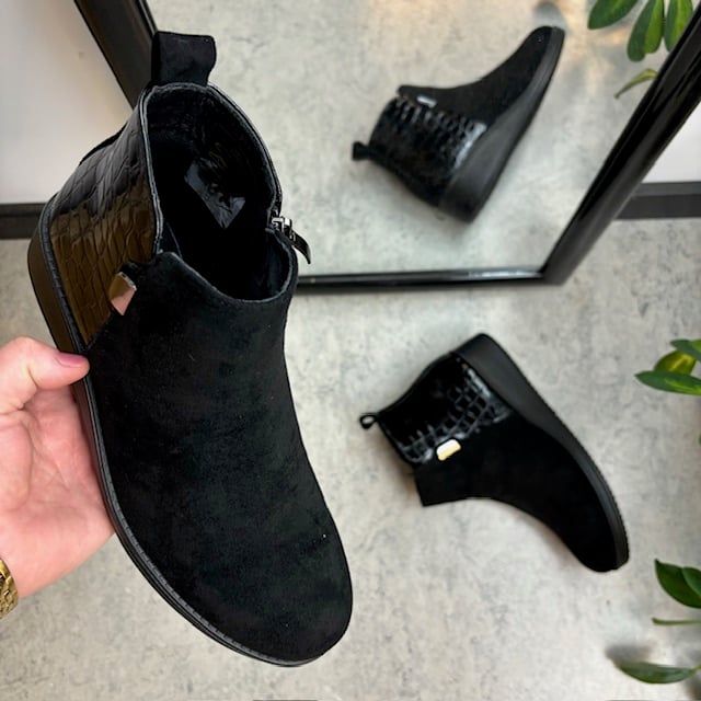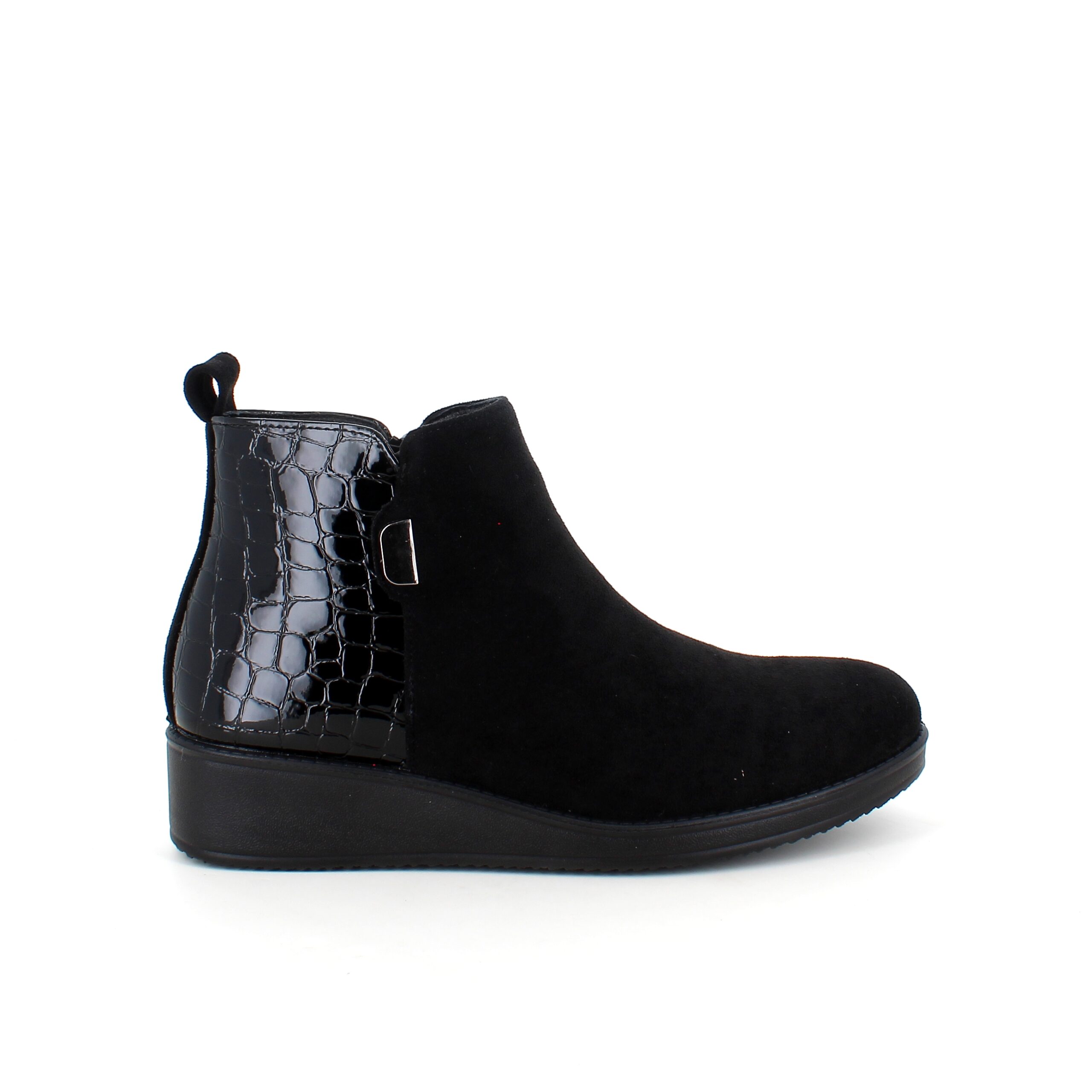 Kort svart støvel med en overdel i svart tekstil og lakdetaljer ved hælen.