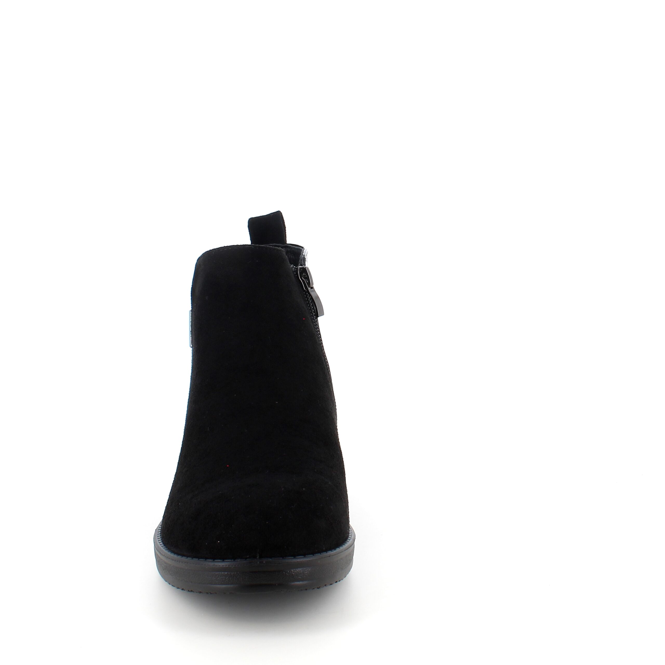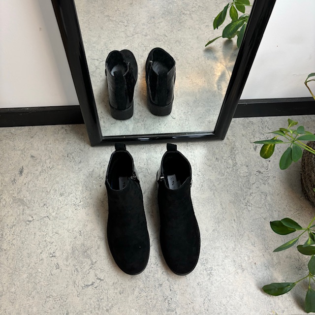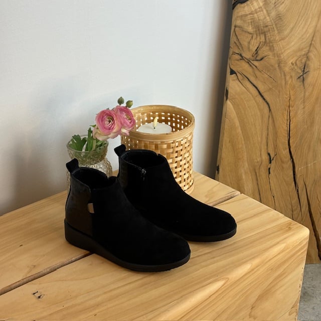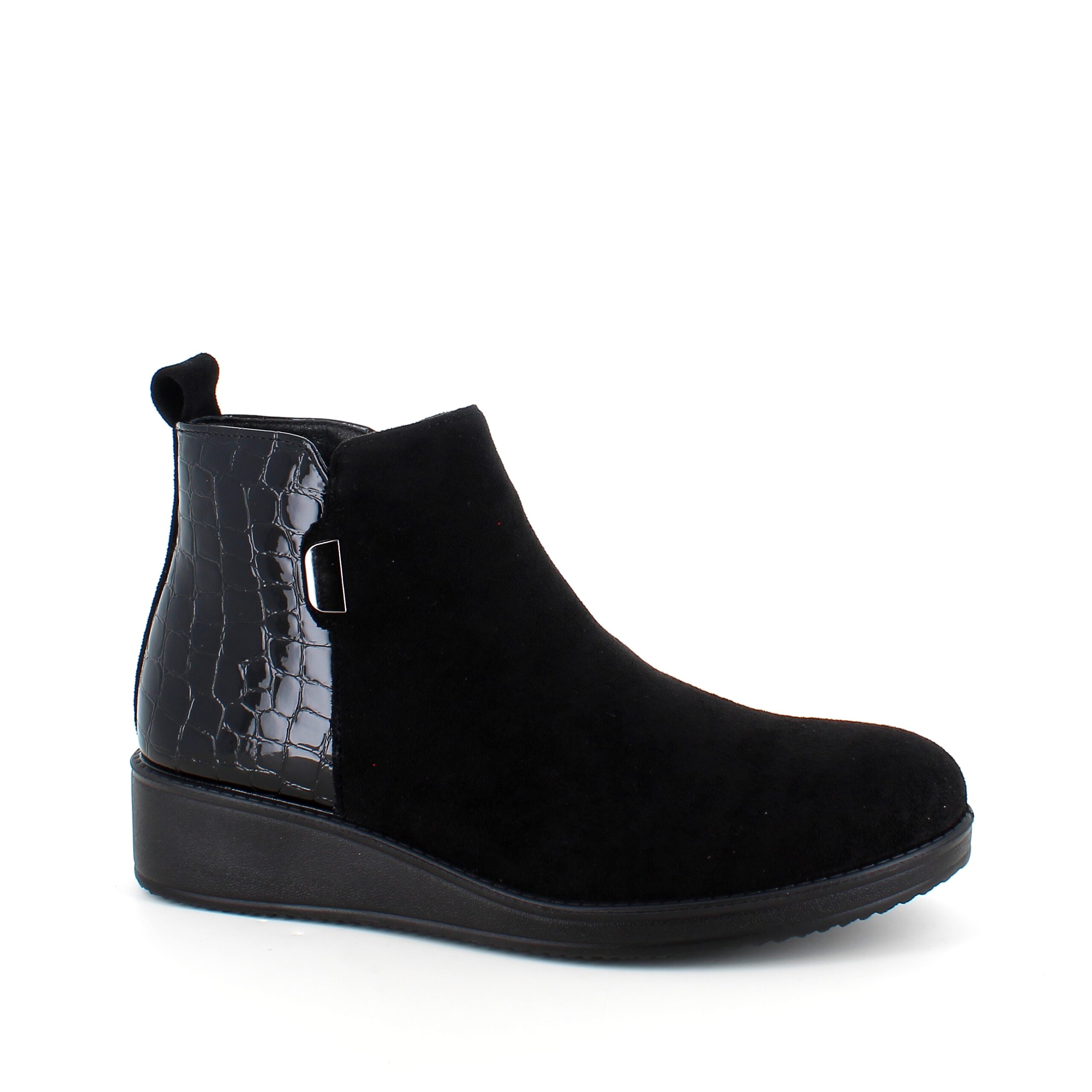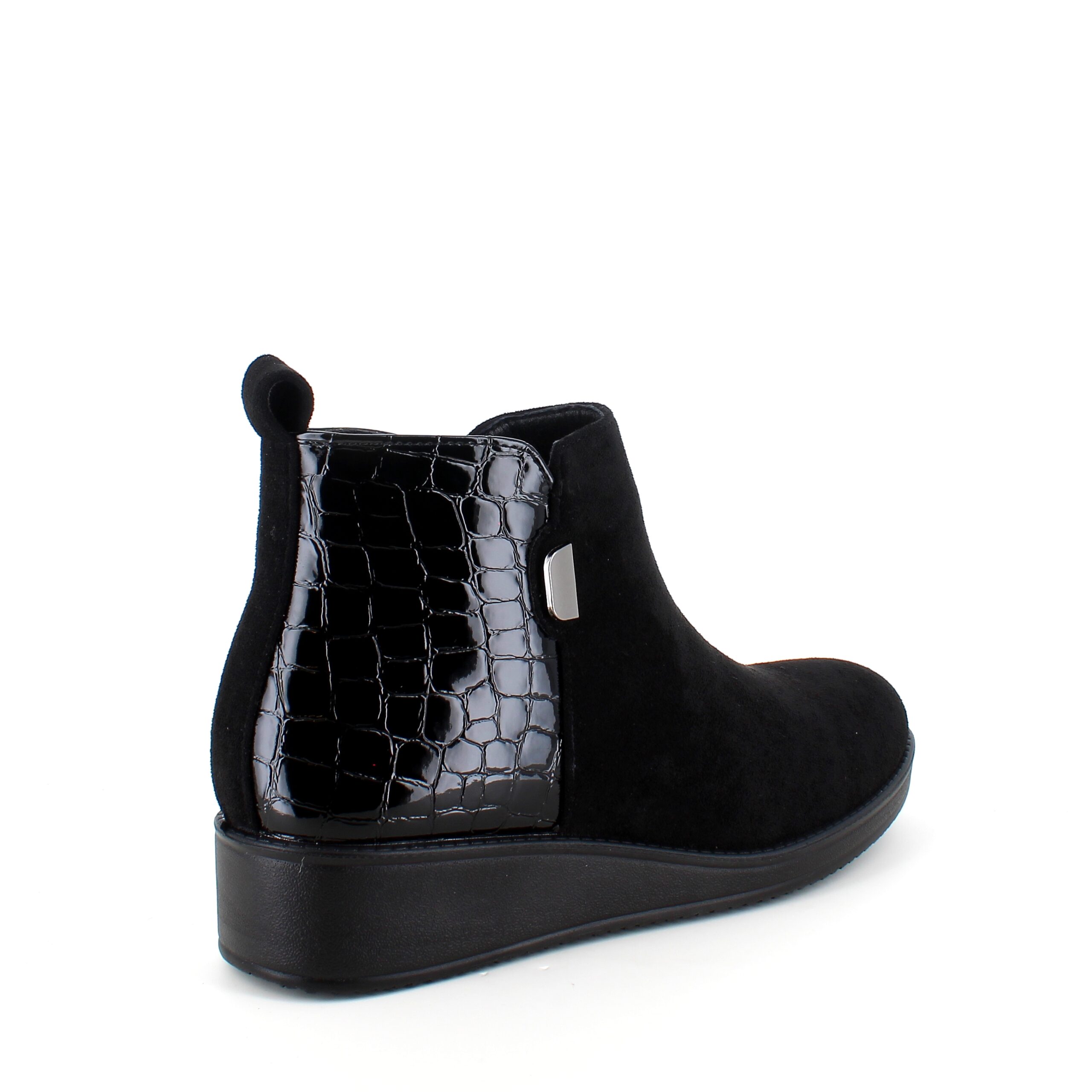 Kort svart støvel med en overdel i svart tekstil og lakdetaljer ved hælen.