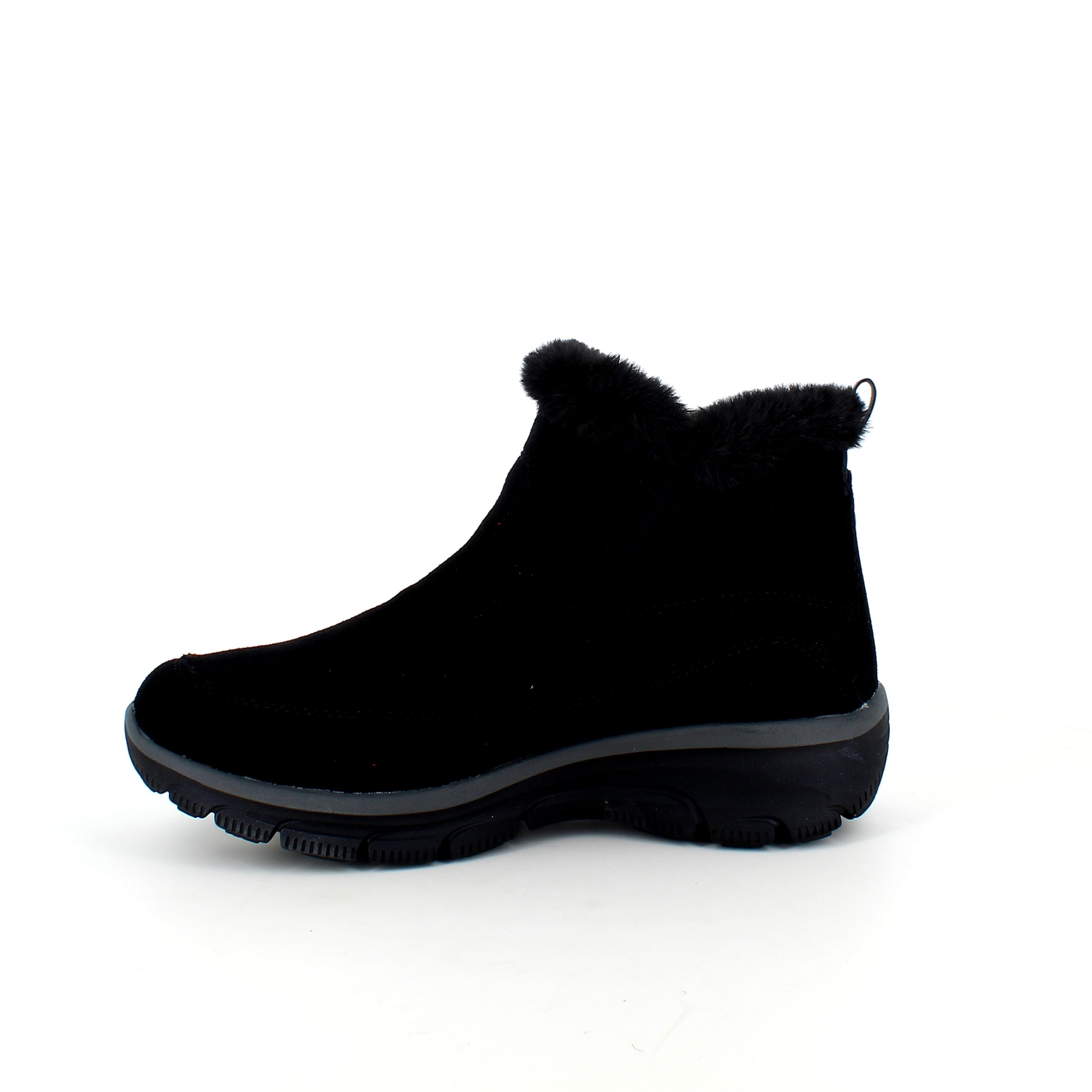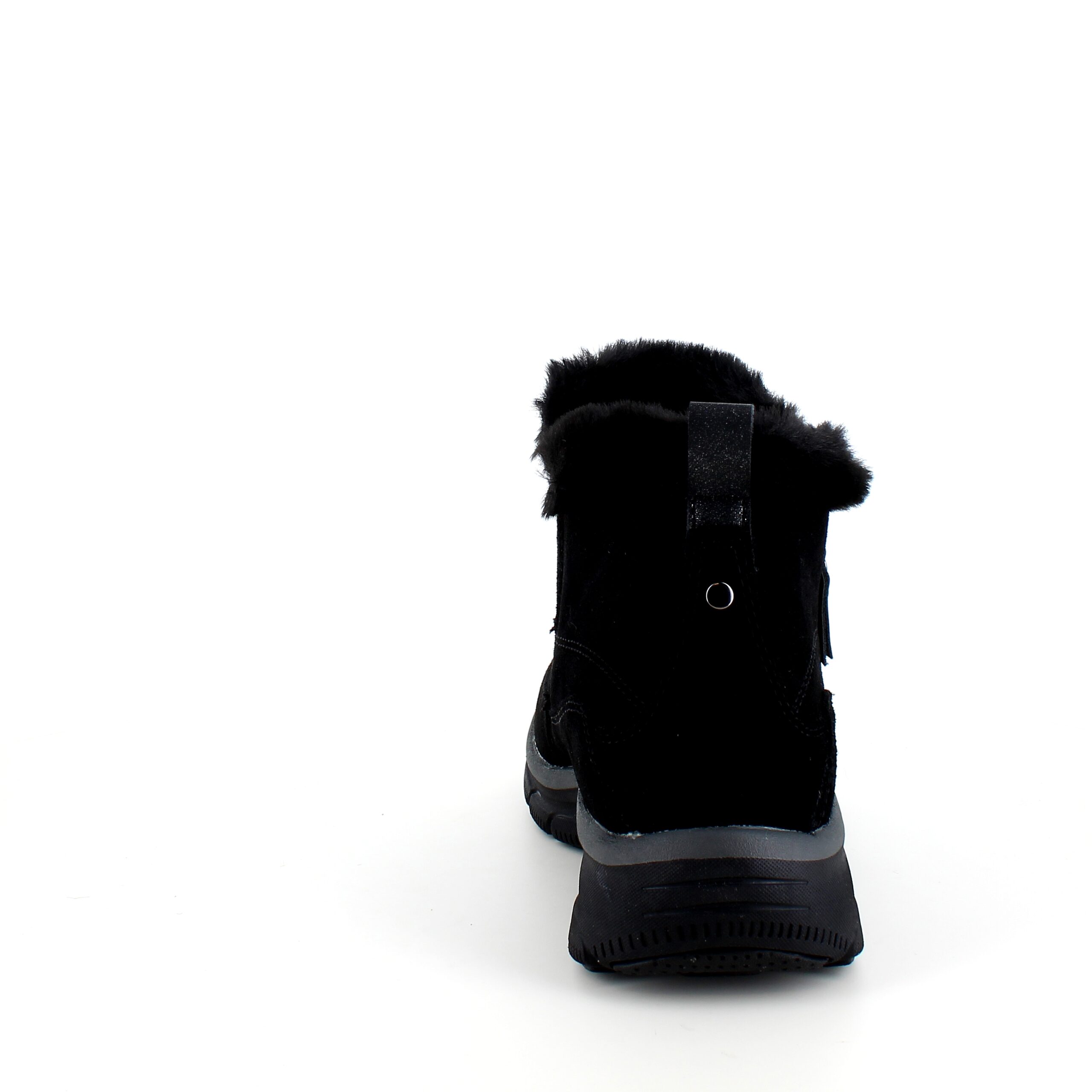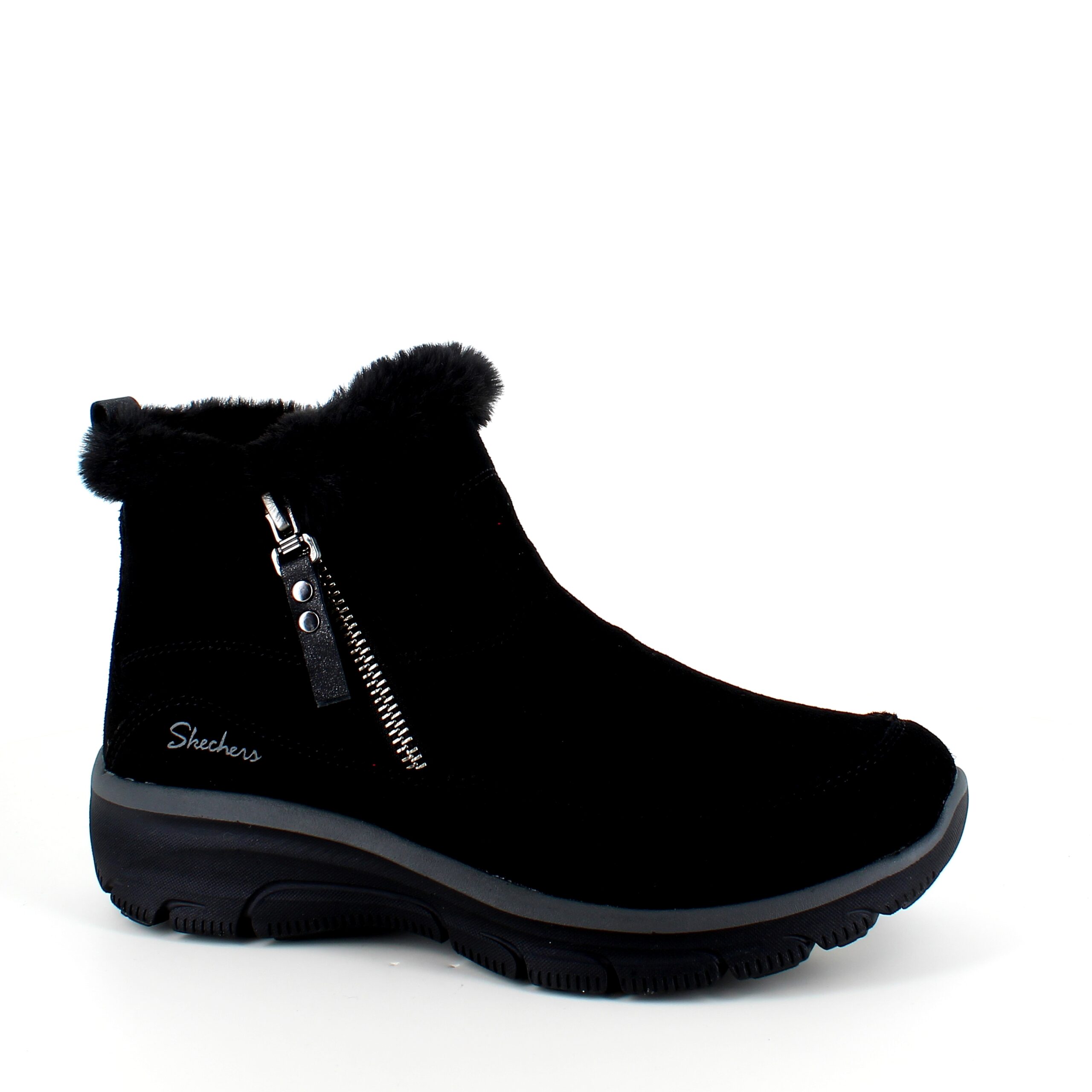 Kort sort Skechers ankelstøvel med svangstøtte omslutter dine føtter med en overdel i semsket skinn og en myk imitasjonspelsforing.