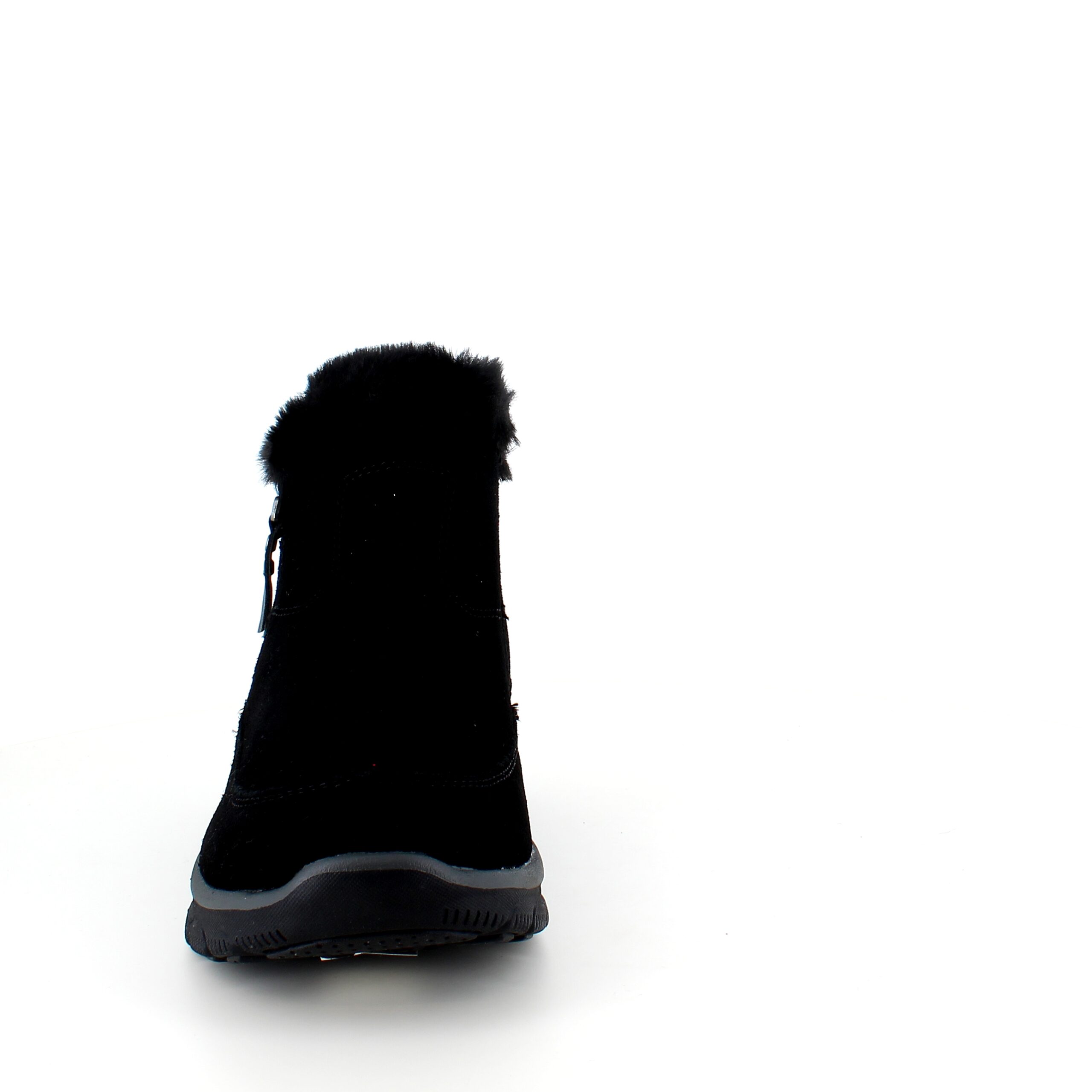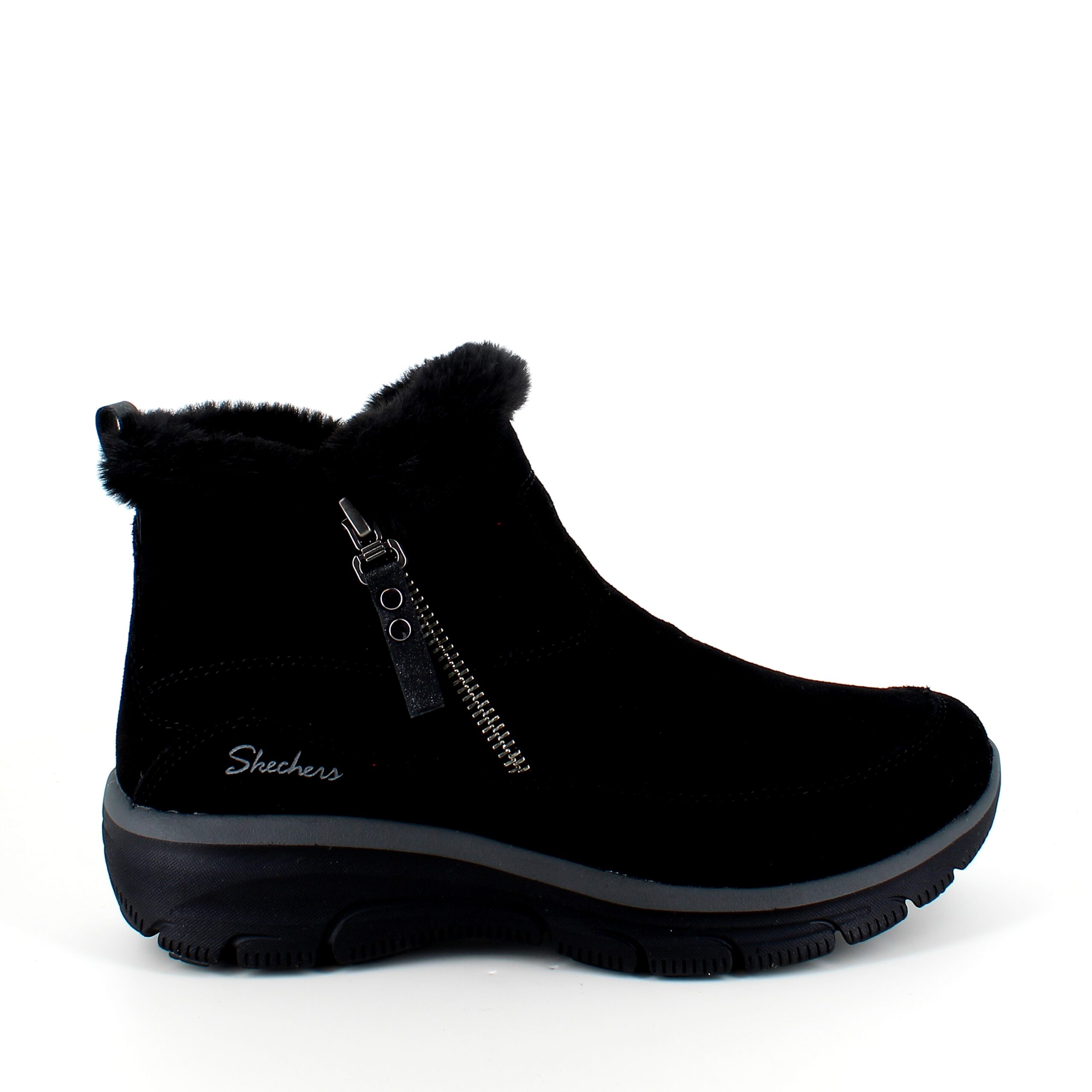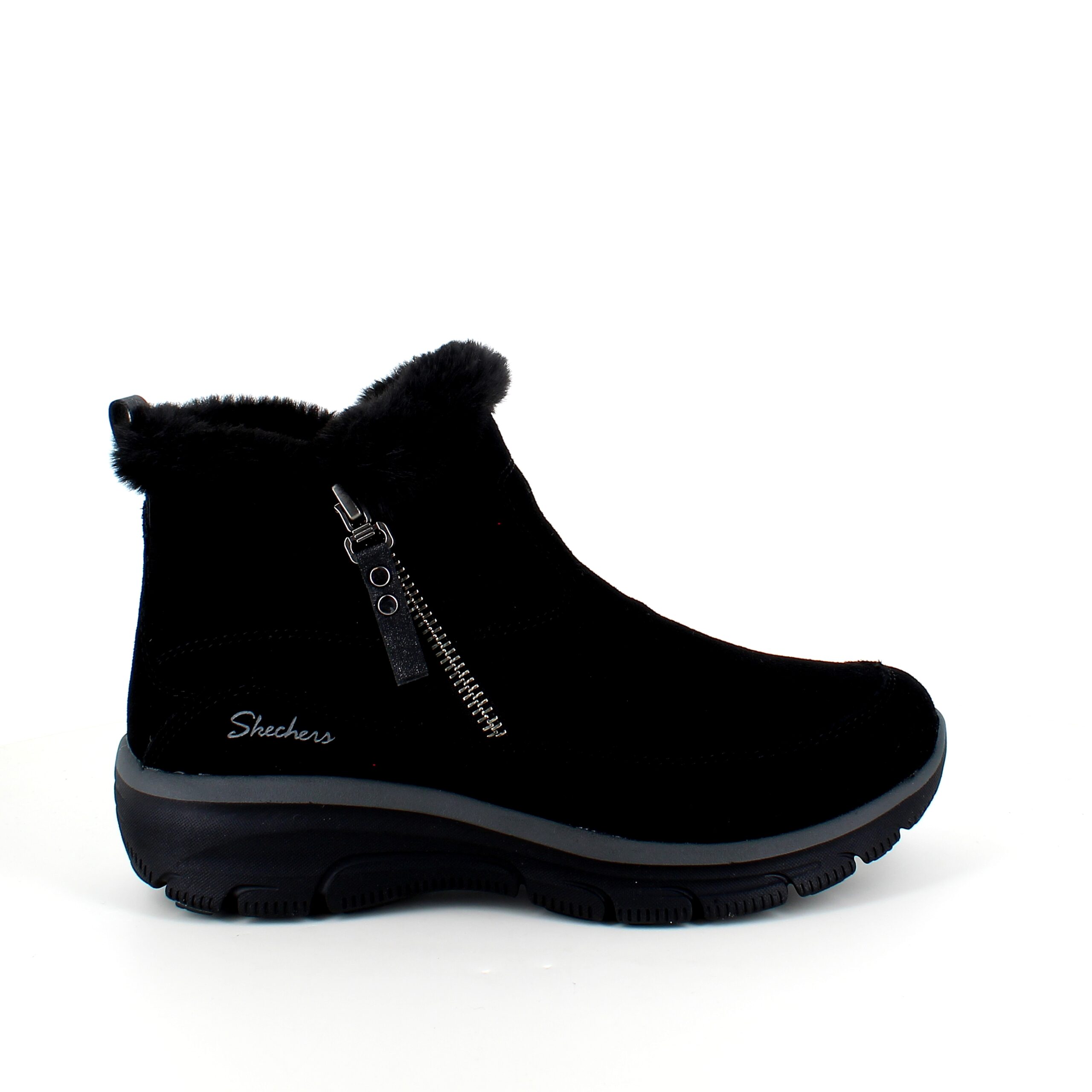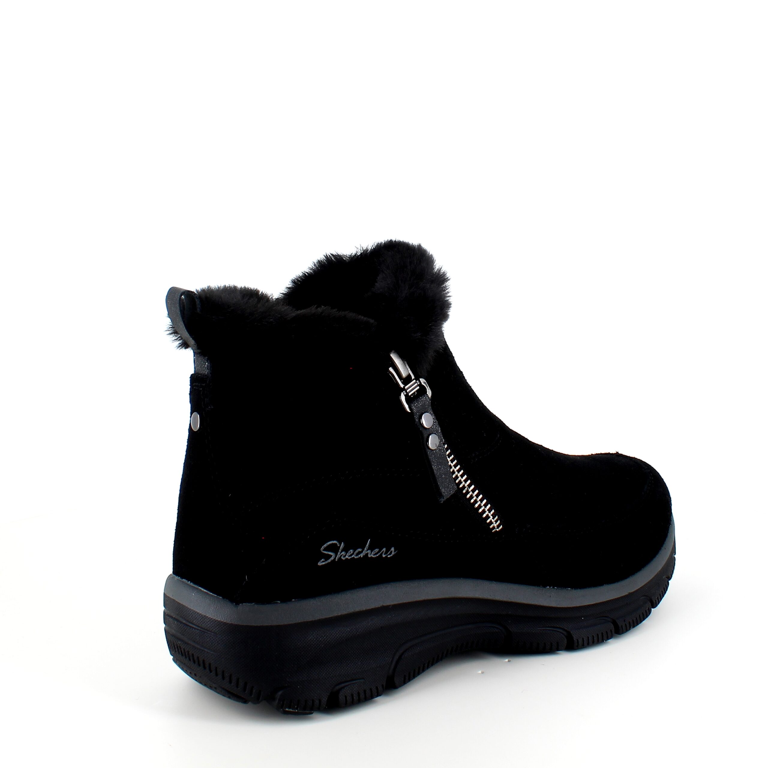 Kort sort Skechers ankelstøvel med svangstøtte omslutter dine føtter med en overdel i semsket skinn og en myk imitasjonspelsforing.