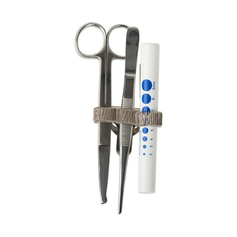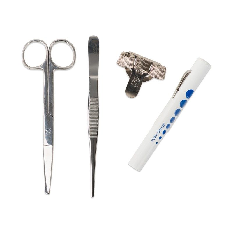 Pakken inneholder en lykt med måleskala, pinsett til medikamentdosering og forbindelsesskift. I tillegg er det en vanlig sykepleiesaks i stål. Har du behov for en bandasjesaks, kan du kjøpe den her.