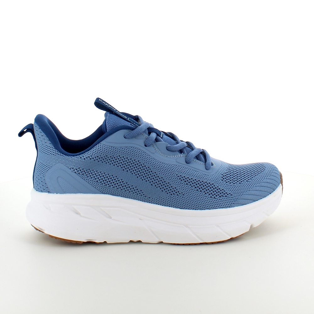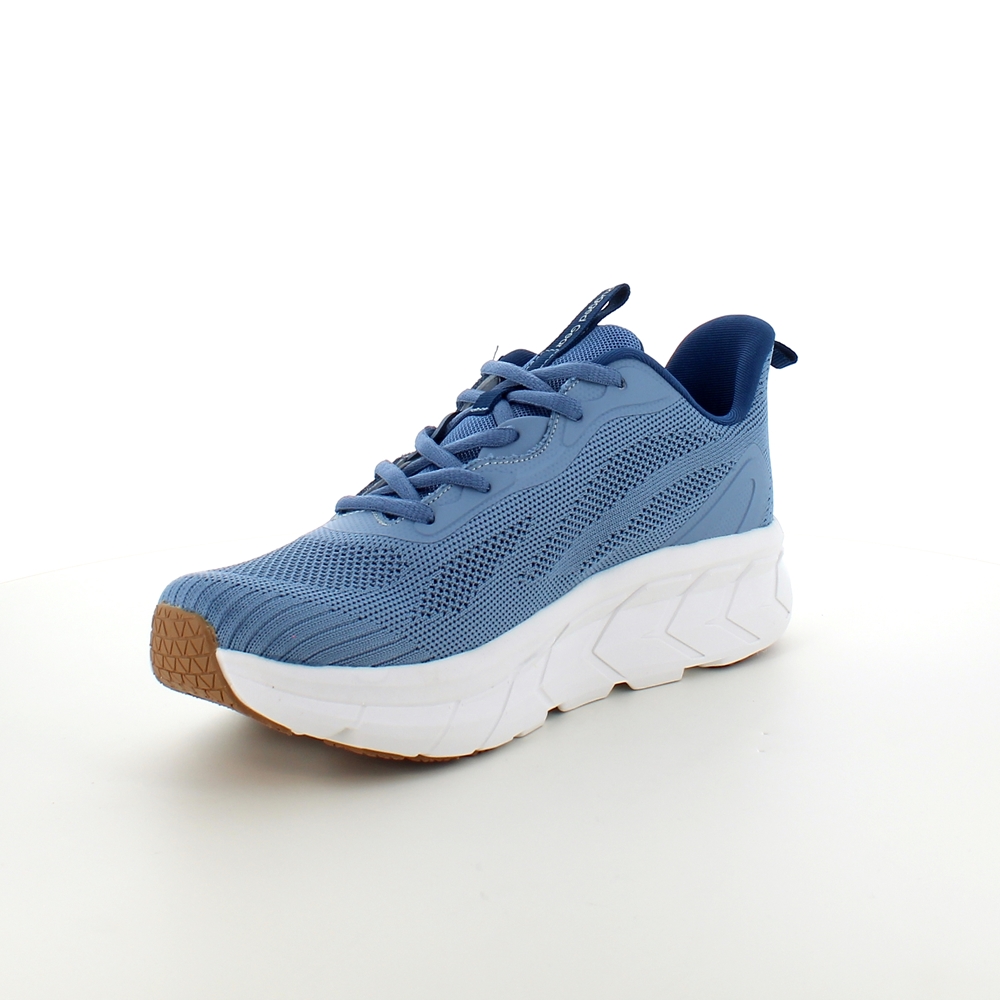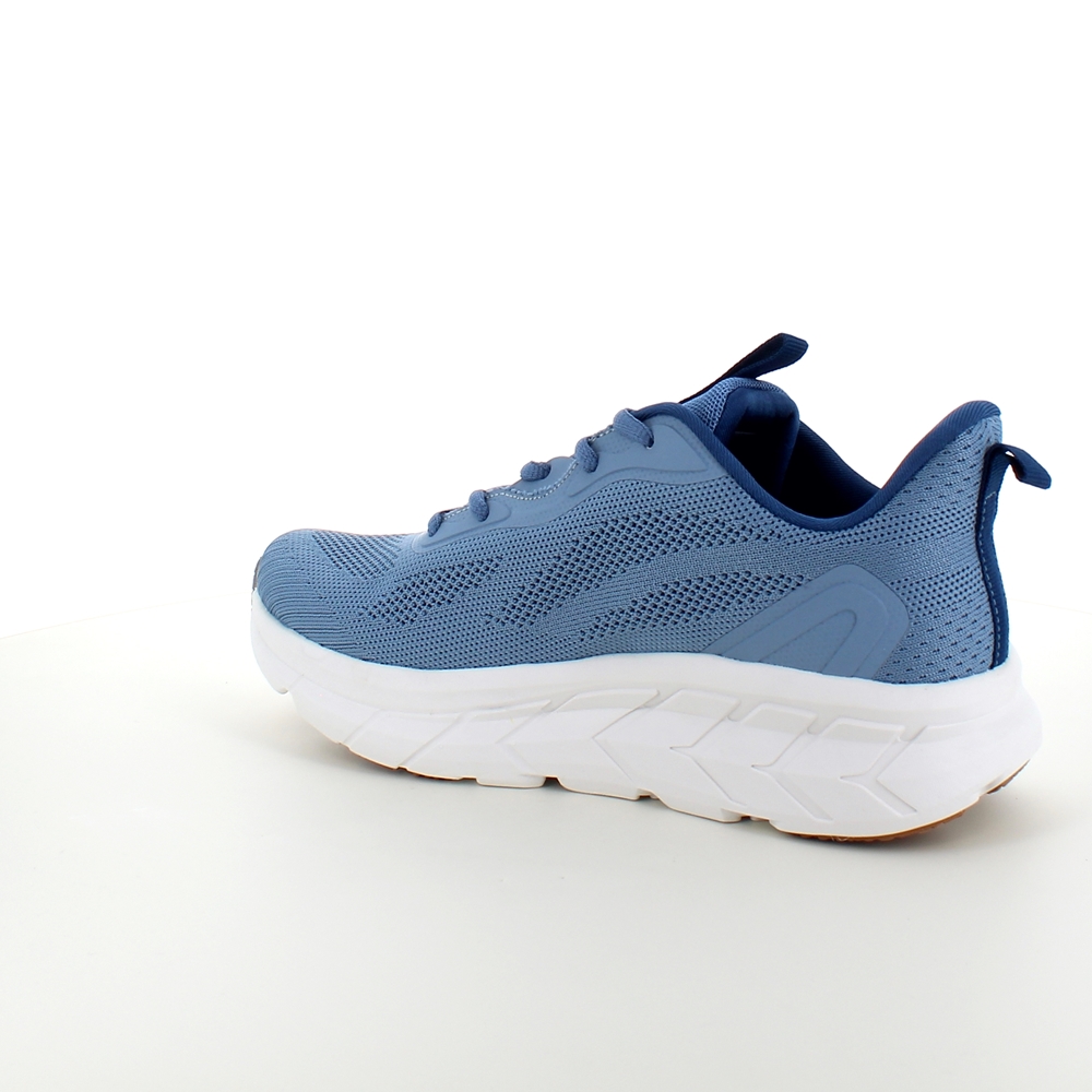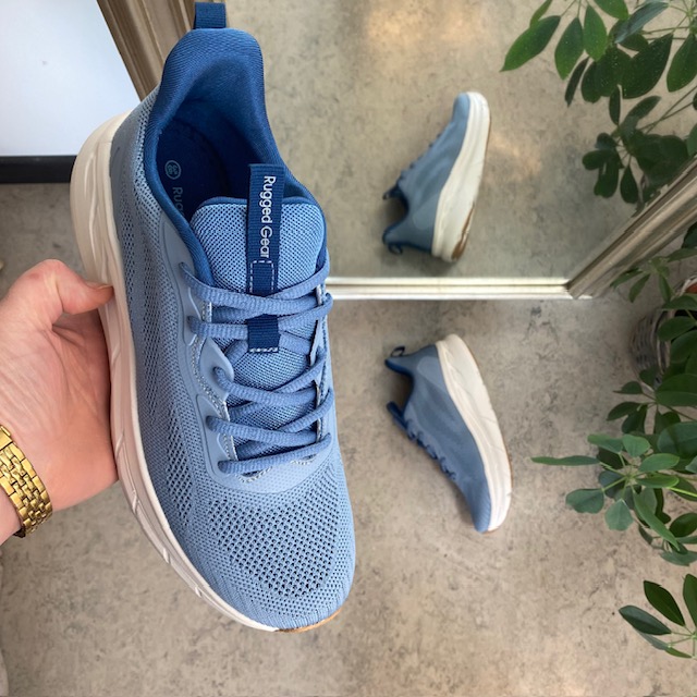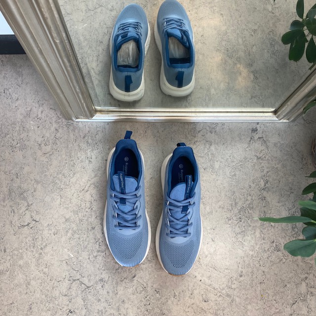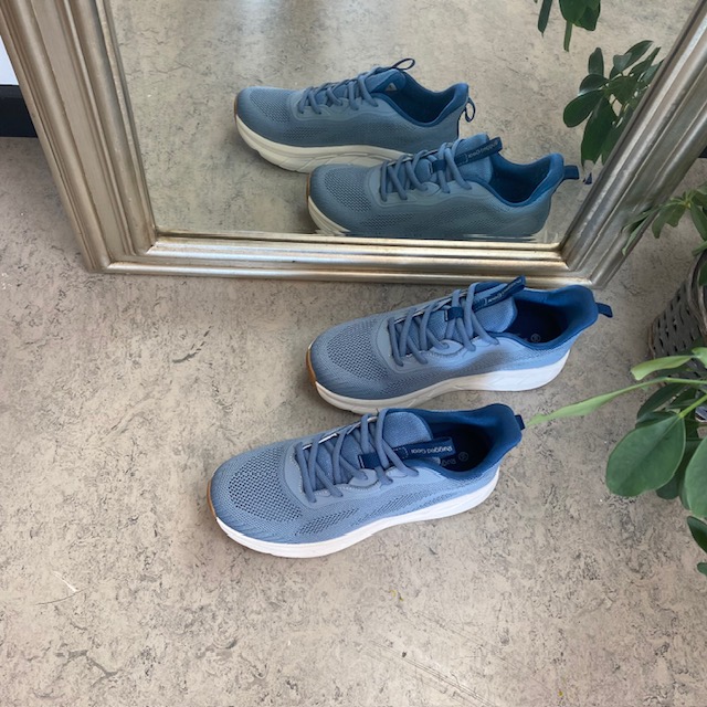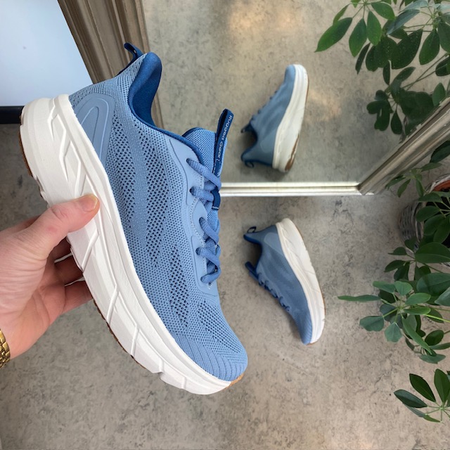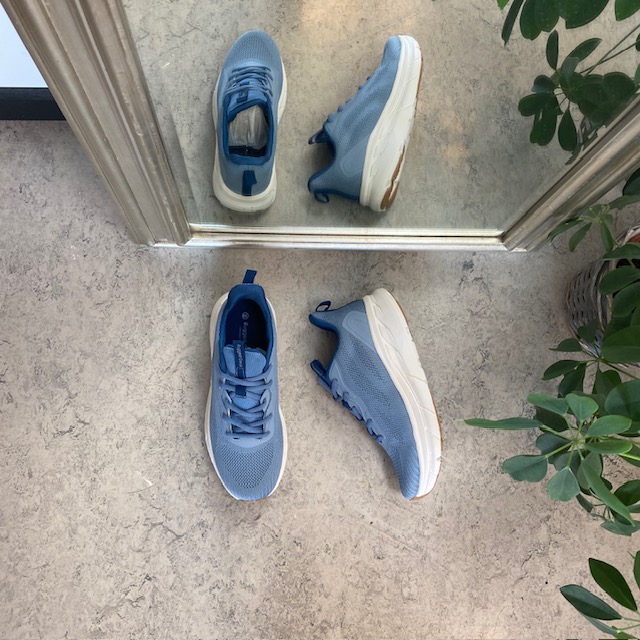 Lys blå sko med overdel i mesh, som gjør skoen pustende