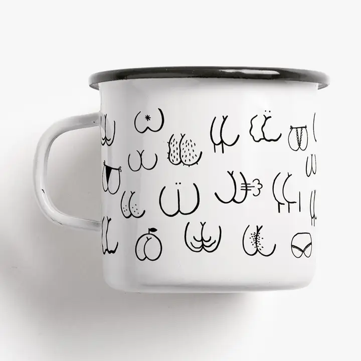 Denne hvite emaljekoppen er dekorert med et unikt og humoristisk design, der morsomme illustrasjoner av forskjellige rumper gir et lekent og annerledes uttrykk. Den klassiske emaljeoverflaten gjør koppen både slitesterk og lett å rengjøre, mens den svarte kanten tilfører et retro-utseende, som passer perfekt til både kjøkkenet, piknik eller kontoret.