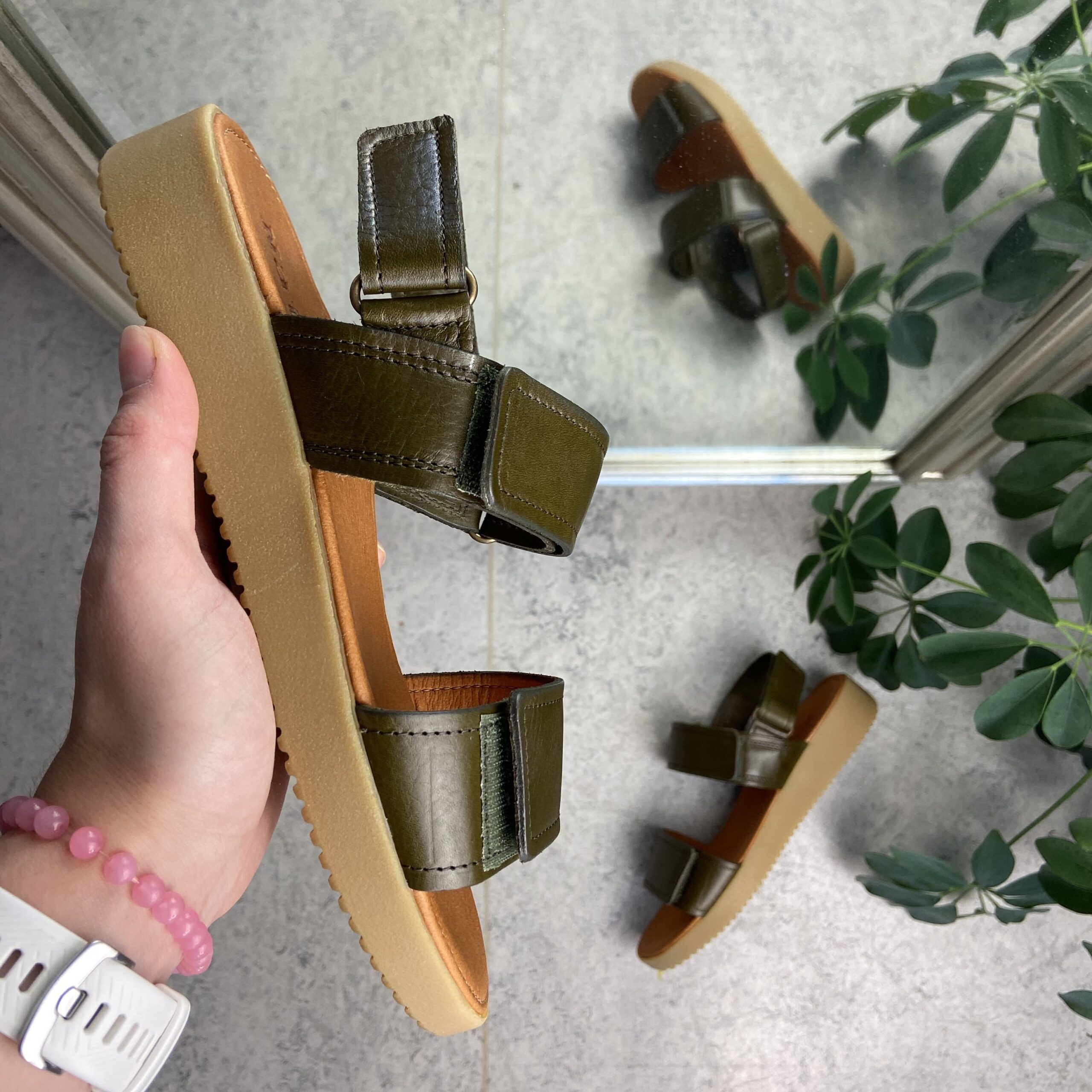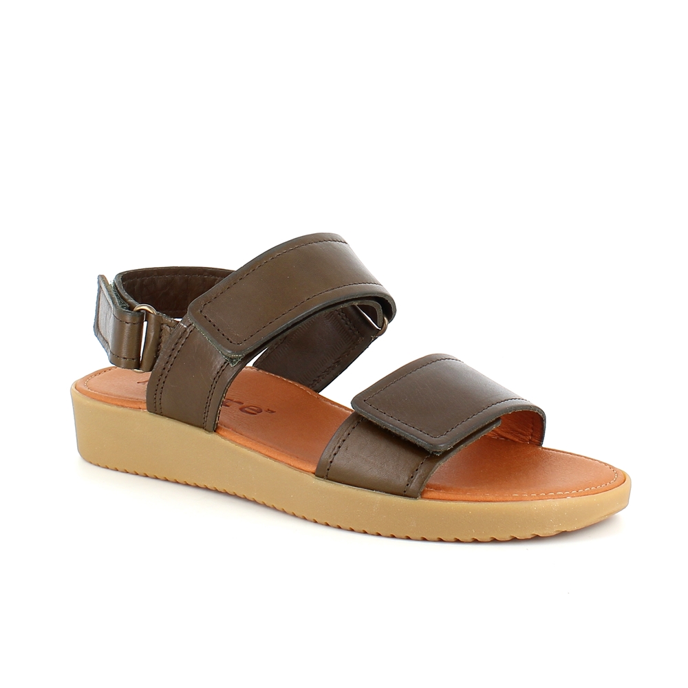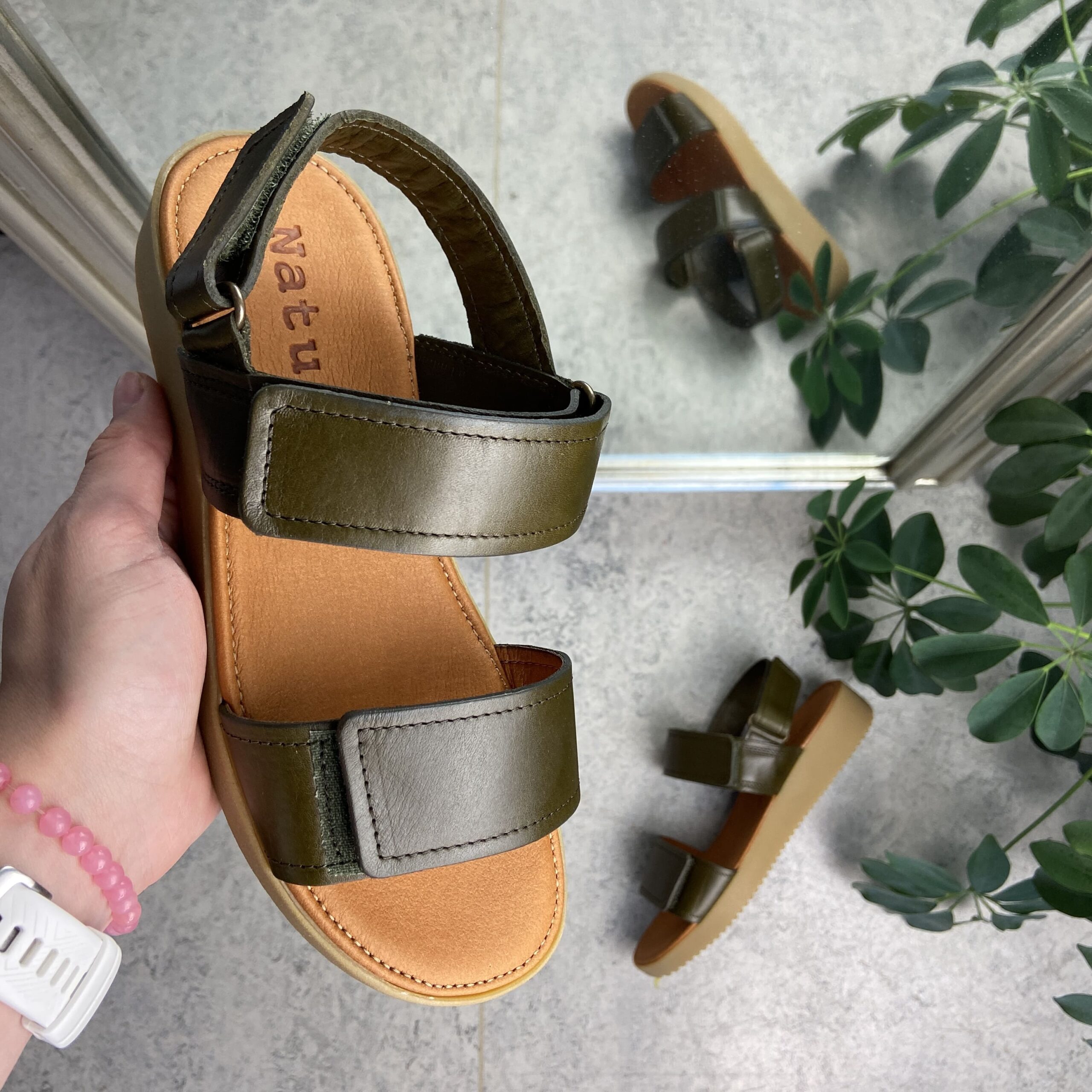 Nature olivengrønn lærsandal med tre justerbare reimer
