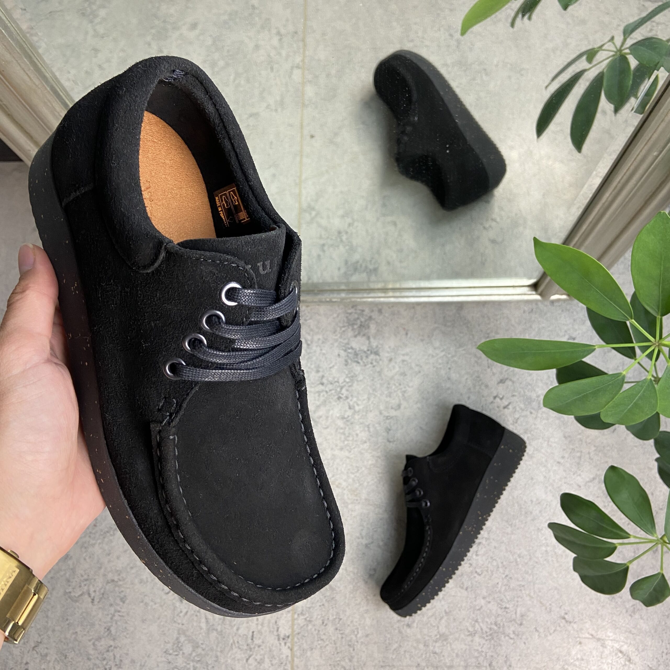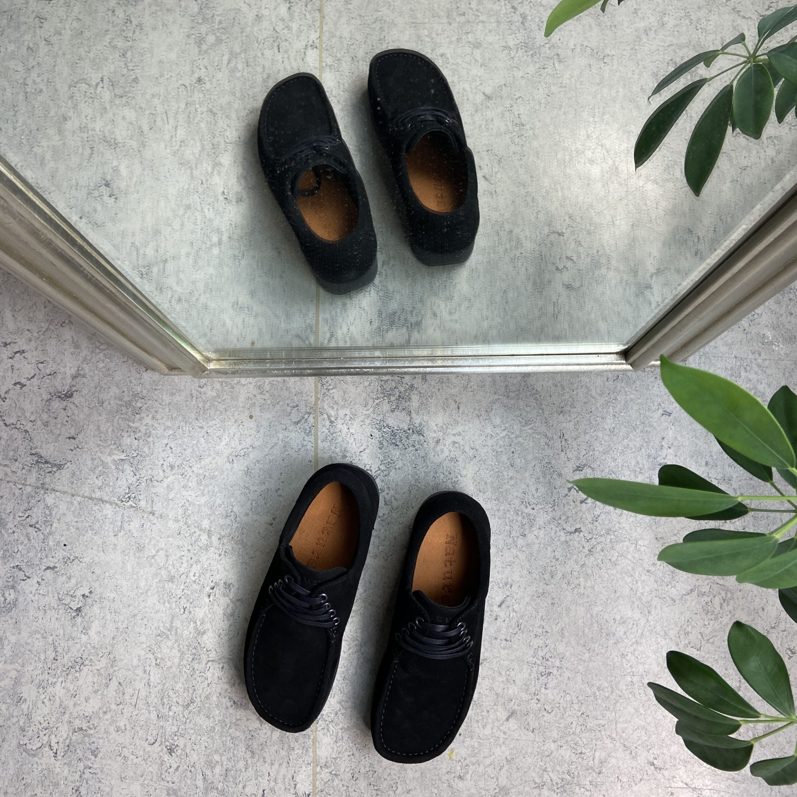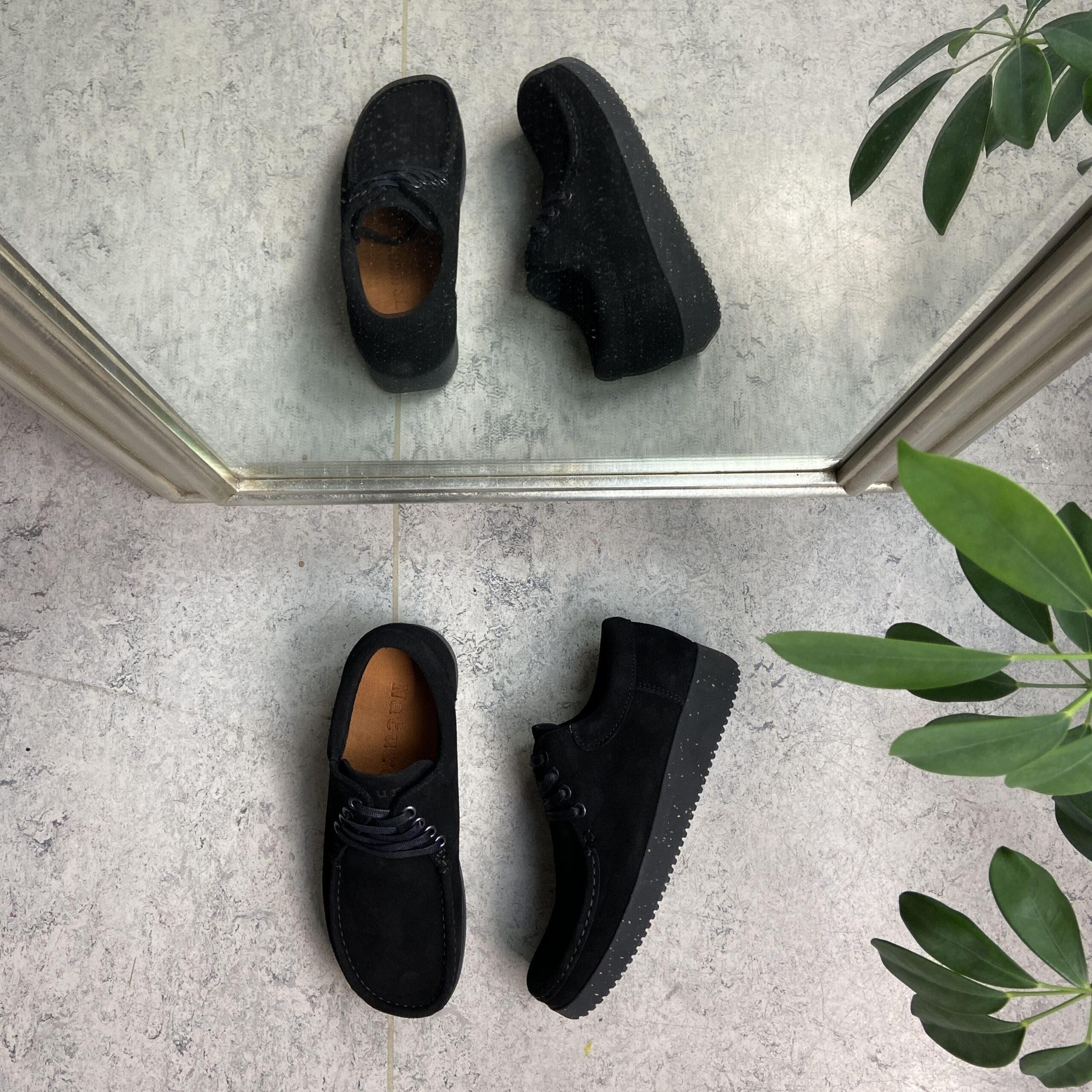 Nature sko i svart semsket skinn med brune flekker i sålen