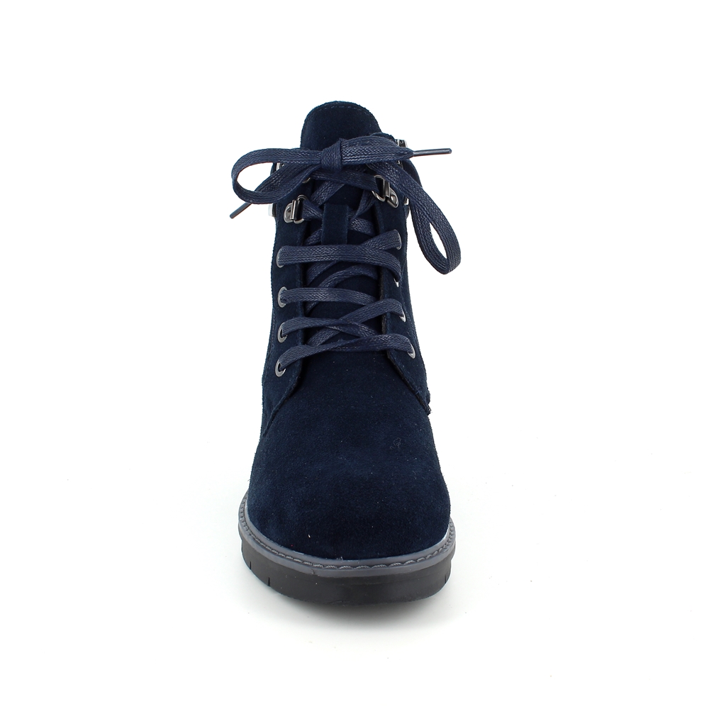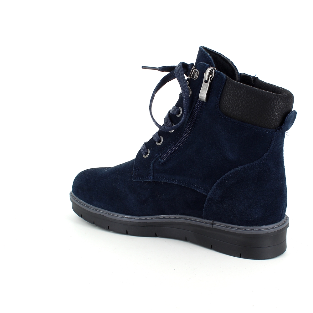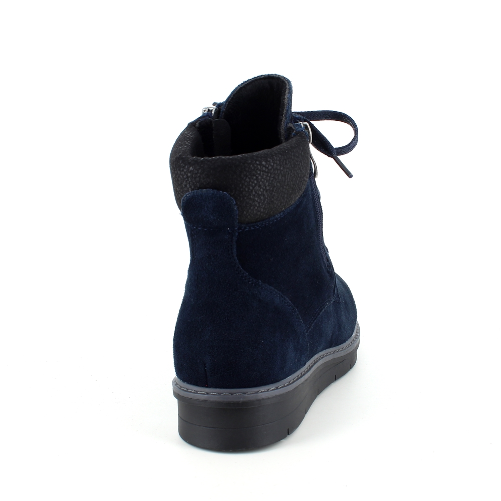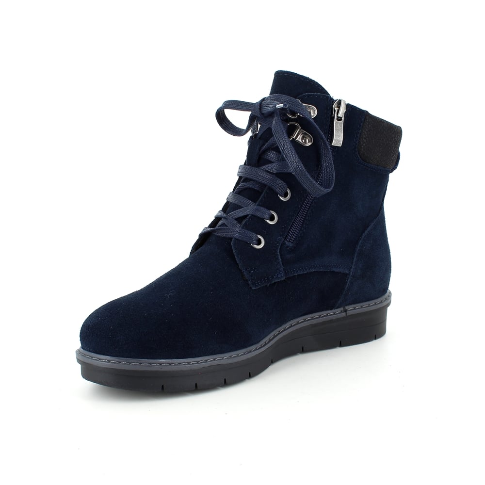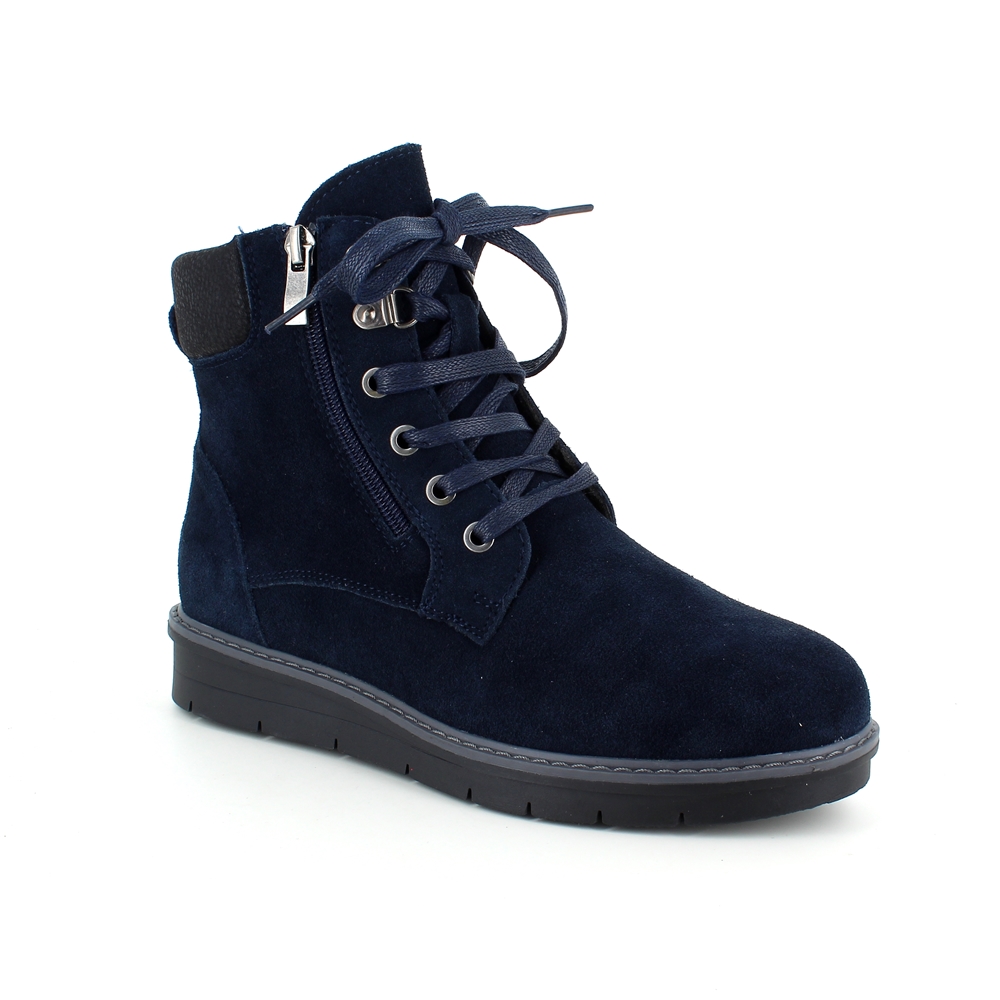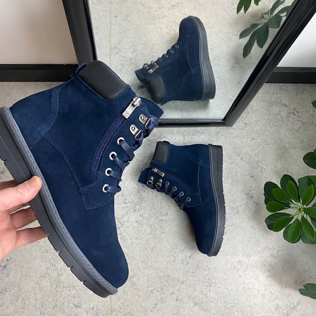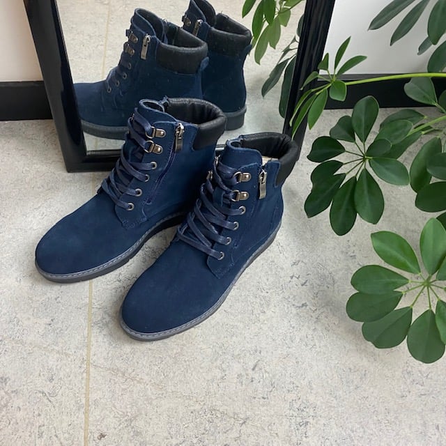Navy lærstøvlett med glidelås på begge sider, som gjør den enkel å ta på.