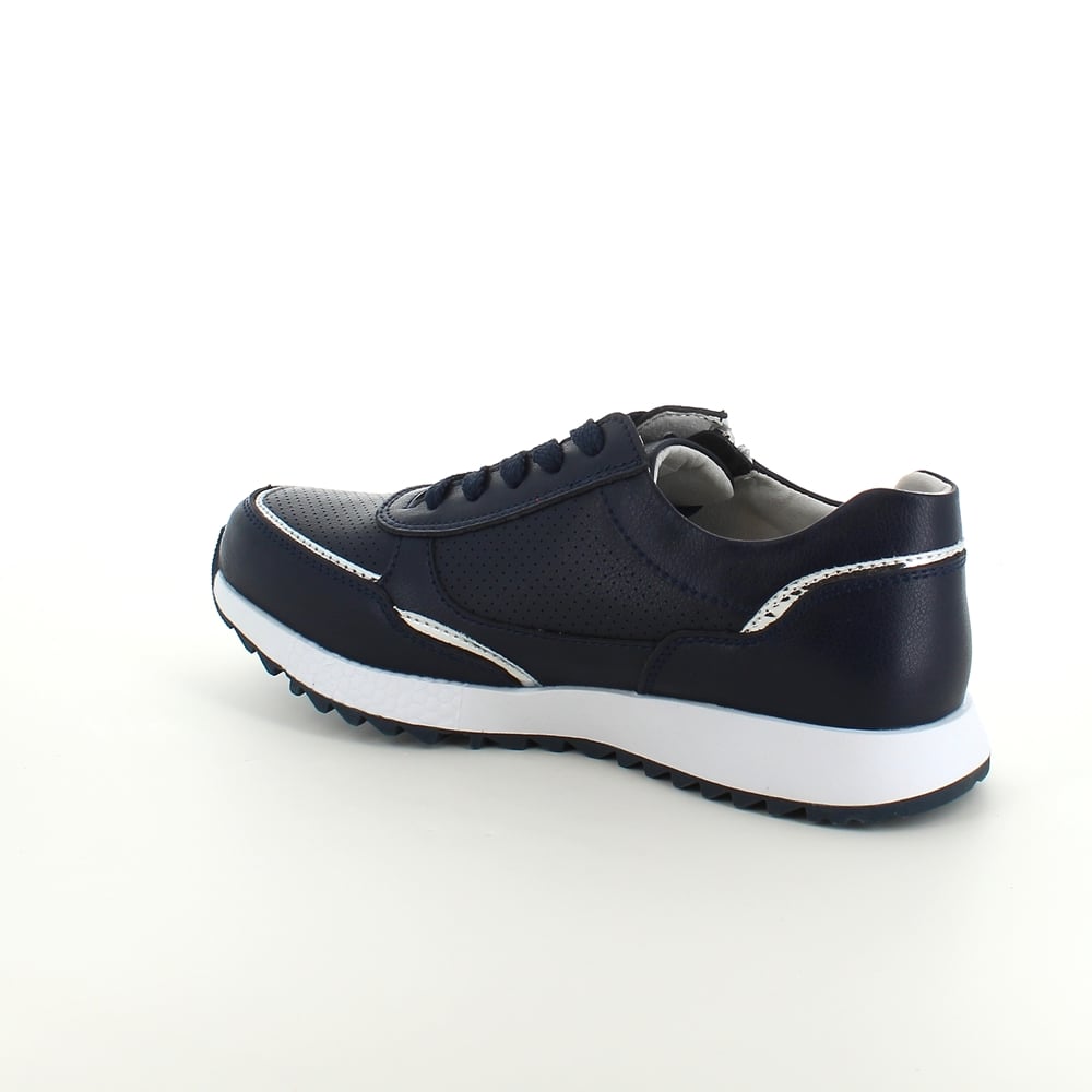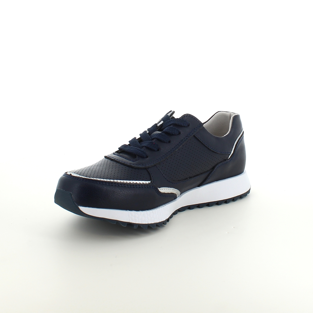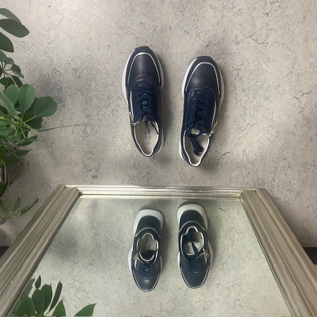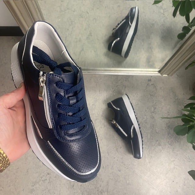 Sko med overdel i både glatt og perforert marineblått skinn.