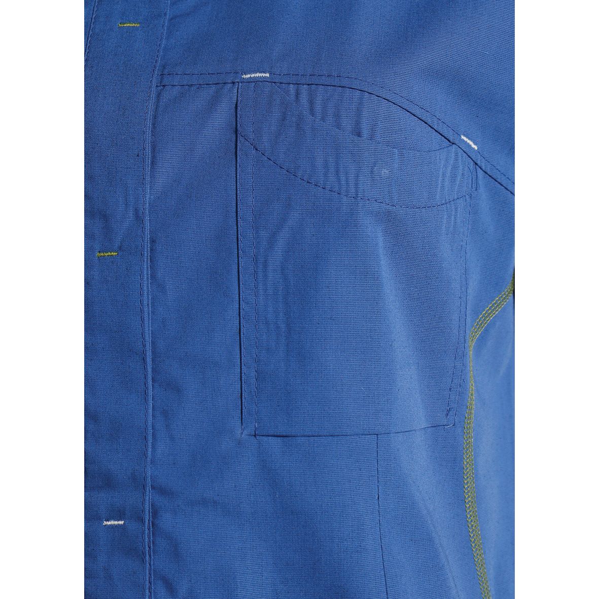 Den strekker seg tilstrekkelig langt ned til at den også dekker godt bak, selv ved bøying og løfting. De avrundede kantene med rib i sidene tilfører ekstra fleksibilitet og komfort. Materialet, en blanding av 50% polyester og 50% BC-bomull med en vekt på 140 g/m², sikrer pusteevne og holdbarhet.
